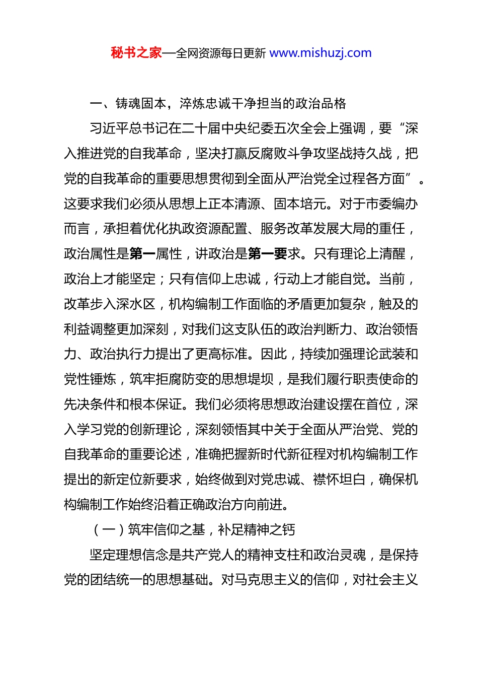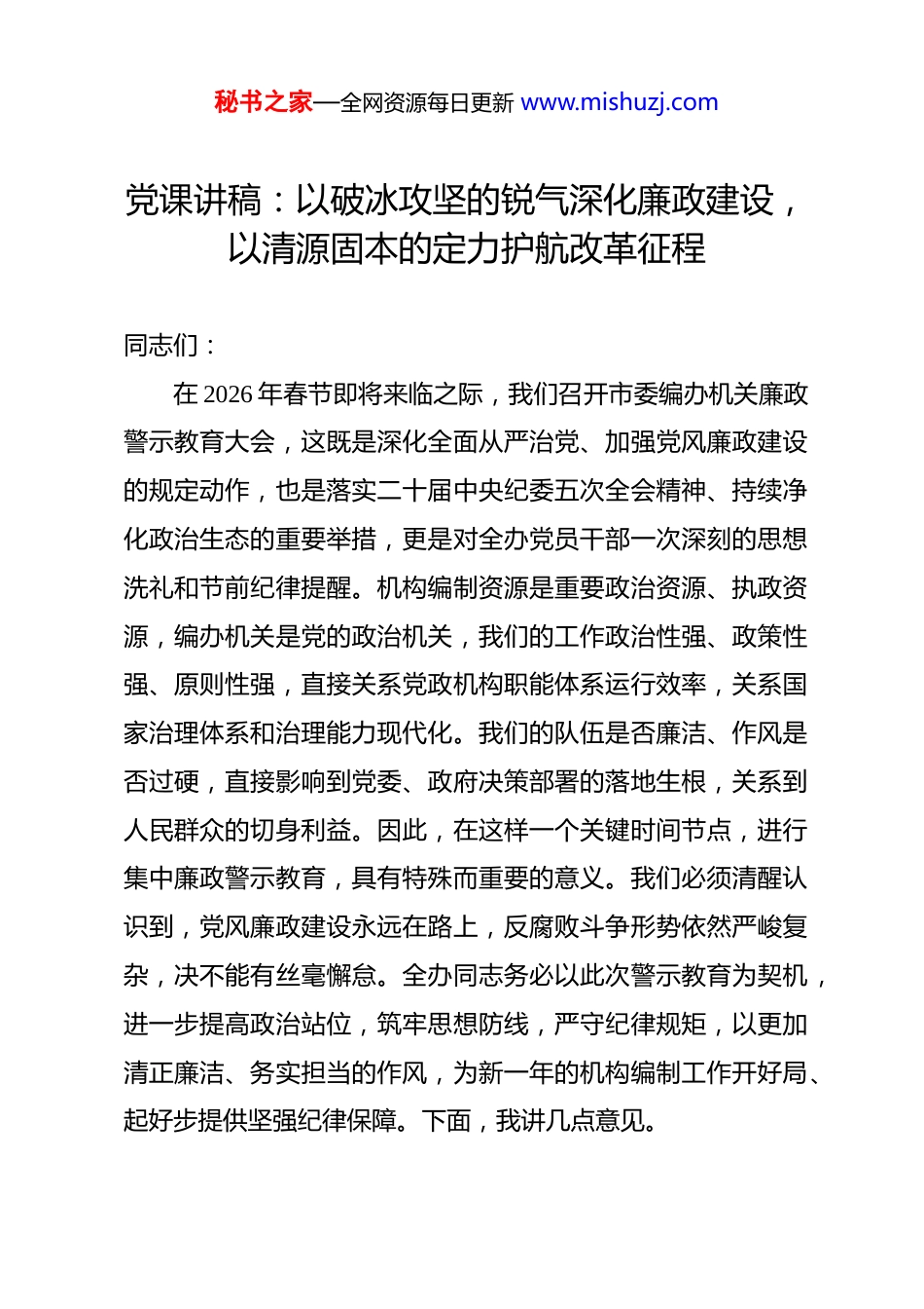秘书之家—全网资源每日更新 www.mishuzj.com党课讲稿:以破冰攻坚的锐气深化廉政建设,以清源固本的定力护航改革征程 同志们:在 2026 年春节即将来临之际,我们召开市委编办机关廉政警示教育大会,这既是深化全面从严治党、加强党风廉政建设的规定动作,也是落实二十届中央纪委五次全会精神、持续净化政治生态的重要举措,更是对全办党员干部一次深刻的思想洗礼和节前纪律提醒。机构编制资源是重要政治资源、执政资源,编办机关是党的政治机关,我们的工作政治性强、政策性强、原则性强,直接关系党政机构职能体系运行效率,关系国家治理体系和治理能力现代化。我们的队伍是否廉洁、作风是否过硬,直接影响到党委、政府决策部署的落地生根,关系到人民群众的切身利益。因此,在这样一个关键时间节点,进行集中廉政警示教育,具有特殊而重要的意义。我们必须清醒认识到,党风廉政建设永远在路上,反腐败斗争形势依然严峻复杂,决不能有丝毫懈怠。全办同志务必以此次警示教育为契机,进一步提高政治站位,筑牢思想防线,严守纪律规矩,以更加清正廉洁、务实担当的作风,为新一年的机构编制工作开好局、起好步提供坚强纪律保障。下面,我讲几点意见。秘书之家—全网资源每日更新 www.mishuzj.com一、铸魂固本,淬炼忠诚干净担当的政治品格习近平总书记在二十届中央纪委五次全会上强调,要“深入推进党的自我革命,坚决打赢反腐败斗争攻坚战持久战,把党的自我革命的重要思想贯彻到全面从严治党全过程各方面”。这要求我们必须从思想上正本清源、固本培元。对于市委编办而言,承担着优化执政资源配置、服务改革发展大局的重任,政治属性是第一属性,讲政治是第一要求。只有理论上清醒,政治上才能坚定;只有信仰上忠诚,行动上才能自觉。当前,改革步入深水区,机构编制工作面临的矛盾更加复杂,触及的利益调整更加深刻,对我们这支队伍的政治判断力、政治领悟力、政治执行力提出了更高标准。因此,持续加强理论武装和党性锤炼,筑牢拒腐防变的思想堤坝,是我们履行职责使命的先决条件和根本保证。我们必须将思想政治建设摆在首位,深入学习党的创新理论,深刻领悟其中关于全面从严治党、党的自我革命的重要论述,准确把握新时代新征程对机构编制工作提出的新定位新要求,始终做到对党忠诚、襟怀坦白,确保机构编制工作始终沿着正确政治方向前进。(一)筑牢信仰之基,补足精神之钙坚定理想信念是共产党人的精神支柱和政治灵魂,是保持党的团结统一的思想基础。对马克思主义的信仰,对社会主义秘书之家—全网资源每日更新 www.mishuzj.com和共产主义的信念,是共产党人经受住任何考验的精神支柱。习近平总书记指出,“理想信念就是共产党人精神上的‘钙’,没有理想信念,理想信念不坚定,精神上就会‘缺钙’,就会得‘软骨病’”。这一论断深刻揭示了坚定理想信念的极端重要性。在机构编制工作中,我们时常面临编制资源紧张与事业发展需求之间的矛盾,面临优化协同高效与既有利益格局之间的冲突,面临严格编制纪律与“说情打招呼”之间的压力。如果理想信念不坚定,精神“缺钙”,就容易在原则问题上态度暧昧、是非不分,在利益诱惑面前立场动摇、底线失守,甚至在机构设置、职能配置、编制核定等关键环节上打折扣、搞变通,损害编制工作的严肃性和权威性。因此,补足精神之“钙”,首要在于持续强化理论武装。要坚持读原著、学原文、悟原理,系统学习党的创新理论,特别是关于国家治理、机构改革、法治建设等方面的重要论述,深刻理解其核心要义、精神实质、丰富内涵、实践要求。要通过学习,不断增强对党的价值追求和前进方向的高度政治认同、思想认同、理论认同、情感认同,切实把学习成果转化为不可撼动的理想信念,转化为推动机构编制事业发展的正确思路、有效举措和实际能力。要自觉用党的理想信念宗旨滋养初心、引领使命,将其内化为对党忠诚、服务人民的政治品格,外化为恪尽职守、廉洁奉公秘书之家—全网资源每日更新 www.mishuzj.com的实际行动,确保在任何时候、任何情况下都做到“乱云飞渡仍从容”。(二)把稳思想之舵,锤炼政治能力政治能力是党员干部第一位的...