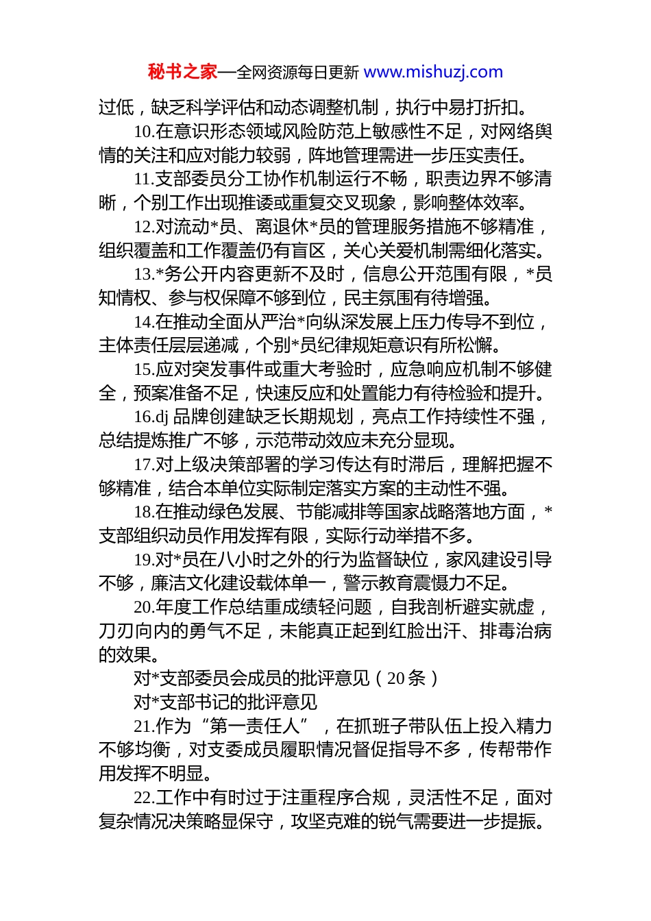秘书之家—全网资源每日更新 www.mishuzj.com*支部班子及各支委成员组织生活批评意见集锦(40 条)对*支部的批评意见(20 条)1.在组织理论学习时,存在“重形式、轻实效”倾向,多以读文件、看视频为主,结合支部实际开展研讨交流不够深入,学用转化效果有待提升。2.面对急难险重任务时,*支部战斗堡垒作用发挥不够充分,统筹协调各方力量的能力还需加强,有时存在等上级指示多、主动谋划少的情况。3.对*员日常教育管理偏宽松软,谈心谈话制度落实不到位,了解*员思想动态不及时,对苗头性、倾向性问题提醒不够早。4.推动 dj 工作与业务工作融合不够紧密,“两张皮”现象依然存在,dj 引领中心工作的切入点找得不准、抓手不多。5.组织生活会查摆问题整改闭环管理机制不健全,部分整改措施停留在纸面,跟踪问效力度不足,影响了整改实效。6.在联系服务群众方面,主动下沉一线听取意见建议较少,解决群众急难愁盼问题的回应速度和办理质量有待提高。7.主题*日活动形式较为单一,创新性不足,吸引力不强,个别活动存在“打卡式”参与现象,*员参与积极性未充分调动。8.对青年*员的培养引导不够系统,压担子、搭平台做得不到位,未能有效激发年轻*员的活力和创造力。9.*支部工作计划制订有时脱离实际,目标设定过高或秘书之家—全网资源每日更新 www.mishuzj.com过低,缺乏科学评估和动态调整机制,执行中易打折扣。10.在意识形态领域风险防范上敏感性不足,对网络舆情的关注和应对能力较弱,阵地管理需进一步压实责任。11.支部委员分工协作机制运行不畅,职责边界不够清晰,个别工作出现推诿或重复交叉现象,影响整体效率。12.对流动*员、离退休*员的管理服务措施不够精准,组织覆盖和工作覆盖仍有盲区,关心关爱机制需细化落实。13.*务公开内容更新不及时,信息公开范围有限,*员知情权、参与权保障不够到位,民主氛围有待增强。14.在推动全面从严治*向纵深发展上压力传导不到位,主体责任层层递减,个别*员纪律规矩意识有所松懈。15.应对突发事件或重大考验时,应急响应机制不够健全,预案准备不足,快速反应和处置能力有待检验和提升。16.dj 品牌创建缺乏长期规划,亮点工作持续性不强,总结提炼推广不够,示范带动效应未充分显现。17.对上级决策部署的学习传达有时滞后,理解把握不够精准,结合本单位实际制定落实方案的主动性不强。18.在推动绿色发展、节能减排等国家战略落地方面,*支部组织动员作用发挥有限,实际行动举措不多。19.对*员在八小时之外的行为监督缺位,家风建设引导不够,廉洁文化建设载体单一,警示教育震慑力不足。20.年度工作总结重成绩轻问题,自我剖析避实就虚,刀刃向内的勇气不足,未能真正起到红脸出汗、排毒治病的效果。对*支部委员会成员的批评意见(20 条)对*支部书记的批评意见21.作为“第一责任人”,在抓班子带队伍上投入精力不够均衡,对支委成员履职情况督促指导不多,传帮带作用发挥不明显。22.工作中有时过于注重程序合规,灵活性不足,面对复杂情况决策略显保守,攻坚克难的锐气需要进一步提振。秘书之家—全网资源每日更新 www.mishuzj.com23.与普通*员面对面交流较少,听取基层声音渠道不畅,对一线实际情况掌握不够全面,导致部分决策针对性不强。24.在推动重点工作落实上,跟踪督办力度不够,存在“开头热、中间松、结尾赶”的现象,过程管控需加强。25.对自身要求标准有时不高,参加双重组织生活会偶尔因公务请假,未能始终以普通*员身份严格要求自己。对组织委员的批评意见26.发展*员工作节奏把控不严,材料审核把关不够细致,偶有返工补录情况,影响整体进度和规范性。27.*员信息台账更新不及时,数据准确性有待提高,信息化管理水平较低,难以满足动态管理需求。28.组织生活记录不完整,会议纪要撰写简略,关键环节缺失,归档资料整理不规范,不利于后期查证和总结。29.在协助书记开展谈心谈话方面主动性不强,仅限于完成规定动作,深度沟通和心理疏导能力有待提升。30.对*小组活动指导支持不够,对其自主开展工作赋能不足,作用发挥受限。对宣传委员的批评意见31.宣传工作策划前瞻性不足,热点捕捉不敏锐,稿件发布时效...