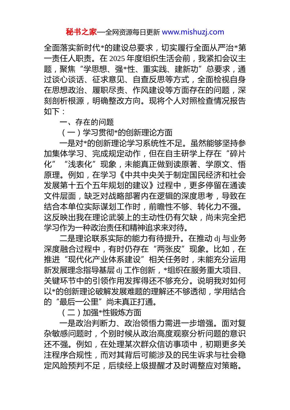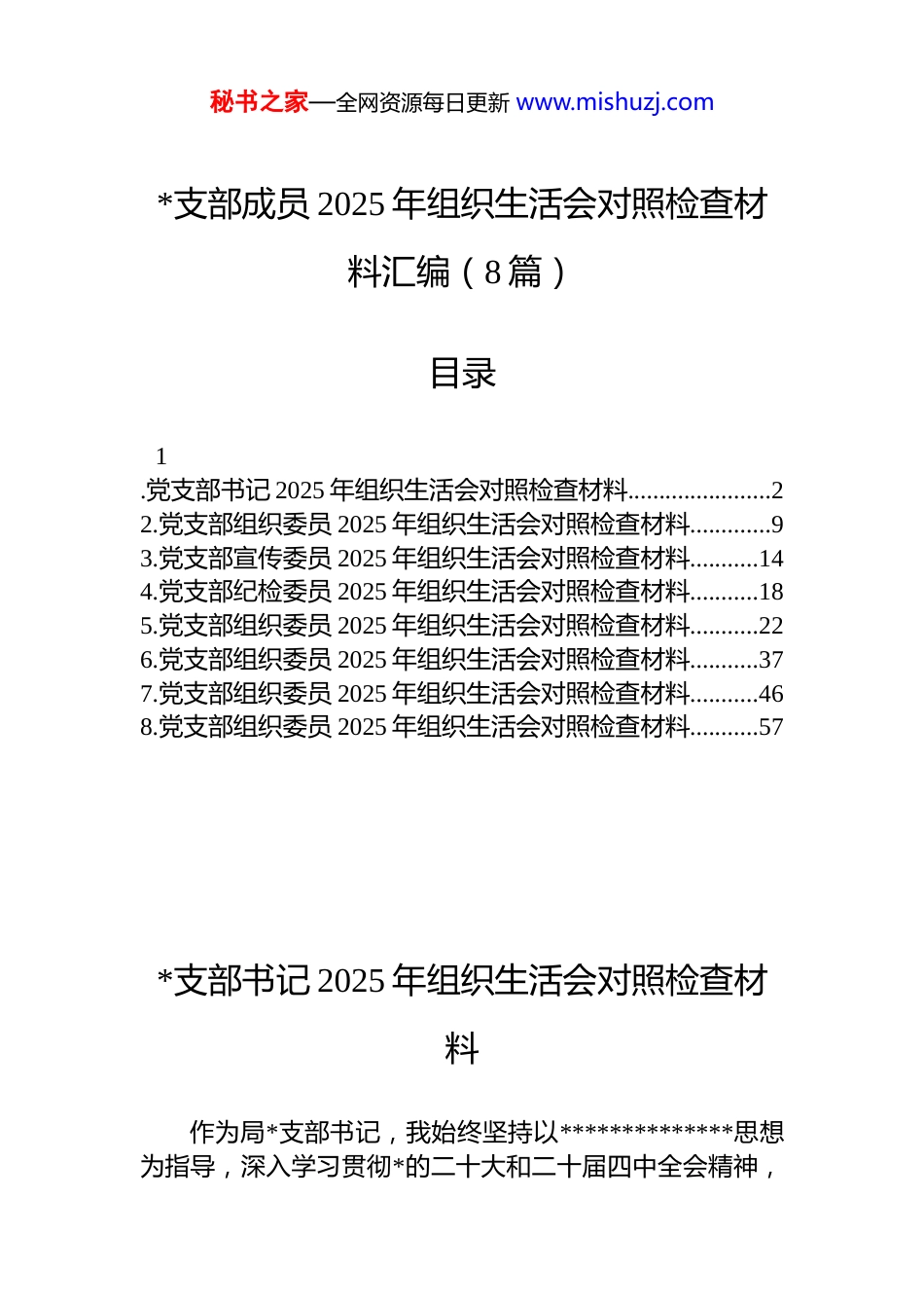 秘书之家—全网资源每日更新 www.mishuzj.com*支部成员 2025 年组织生活会对照检查材料汇编(8 篇)目录1.党支部书记 2025 年组织生活会对照检查材料.......................22.党支部组织委员 2025 年组织生活会对照检查材料.............93.党支部宣传委员 2025 年组织生活会对照检查材料...........144.党支部纪检委员 2025 年组织生活会对照检查材料...........185.党支部组织委员 2025 年组织生活会对照检查材料...........226.党支部组织委员 2025 年组织生活会对照检查材料...........377.党支部组织委员 2025 年组织生活会对照检查材料...........468.党支部组织委员 2025 年组织生活会对照检查材料...........57*支部书记 2025 年组织生活会对照检查材料作为局*支部书记,我始终坚持以**************思想为指导,深入学习贯彻*的二十大和二十届四中全会精神,秘书之家—全网资源每日更新 www.mishuzj.com全面落实新时代*的建设总要求,切实履行全面从严治*第一责任人职责。在 2025 年度组织生活会前,我紧扣会议主题,聚焦“学思想、强*性、重实践、建新功”总要求,通过谈心谈话、征求意见、自查反思等方式,全面检视自身在思想政治、履职尽责、作风建设等方面存在的问题,深刻剖析根源,明确整改方向。现将个人对照检查情况报告如下:一、存在的问题(一)学习贯彻*的创新理论方面一是对*的创新理论学习系统性不足。虽然能够坚持参加集体学习、完成规定动作,但在自主研学上存在“碎片化”“浅表化”现象,未能真正做到读原著、学原文、悟原理。例如,在学习《中共中央关于制定国民经济和社会发展第十五个五年规划的建议》过程中,更多停留在通读文件层面,缺乏对战略部署内在逻辑的深度思考,导致在结合本单位实际谋划工作时,前瞻性不够、转化力不强。这反映出我在理论武装上的主动性仍有欠缺,尚未完全把学习作为一种政治责任和精神追求来对待。二是理论联系实际的能力有待提升。在推动 dj 与业务深度融合过程中,有时仍存在“两张皮”现象。比如,在推进“现代化产业体系建设”相关任务时,未能充分运用新发展理念指导基层 dj 工作创新,*组织在服务重大项目、关键环节中的引领作用发挥得还不够充分。说明我对如何以*的创新理论破解发展难题的理解还不够透彻,学用结合的“最后一公里”尚未真正打通。(二)加强*性锻炼方面一是政治判断力、政治领悟力需进一步增强。面对复杂敏感问题时,个别时候从政治高度观察分析问题的意识还不强。例如,在处理某次群众信访事项中,初期更多关注程序合规性,而对其背后可能涉及的民生诉求与社会稳定风险预判不足,后续经上级提醒才及时调整应对策略。秘书之家—全网资源每日更新 www.mishuzj.com暴露出我在政治敏锐性和大局观上还有短板,没有时刻做到胸怀“国之大者”。二是*内政治生活质量有待提高。作为支部书记,在主持组织生活会、开展批评与自我批评时,有时存在“老好人”思想,对班子成员提醒多、点问题少,怕伤和气、影响团结。个别同志指出,“红脸出汗”的效果打了折扣。这说明我在严肃*内政治生活上还缺乏足够勇气和斗争精神,离高标准严要求尚有差距。(三)联系服务群众方面一是深入一线调研不够扎实。尽管制定了年度调研计划,但受事务性工作牵绊,真正沉到基层一线的时间偏少听汇报多、看材料多,面对面听取干部职工和服务对象意见建议相对不足。特别是在推动社区适老化改造项目中,前期征求居民意见不够广泛,导致部分设施建成后使用率不高。反映出我宗旨意识树得不牢,群众路线践行不到位。二是回应群众关切的时效性有待加强。对于一些历史遗留问题或跨部门协调事项,存在等待观望心态,主动攻坚克难的劲头不足。如某老旧小区加装电梯推进缓慢,虽多次开会研究,但实质性进展有限,群众满意度不高。说明我在担当作为上还需加压奋进,解决急难愁盼问题的力度亟待加大。(四)发挥先锋模范作用方面一是在重大任务面前示范引领作用发挥不充分。面对机构改革、职能调整等重点工作,虽然能够坚守岗位、履职尽责,但在带领团队闯关夺隘、开拓创新方面,带头冲锋的劲头有所减弱。个别...