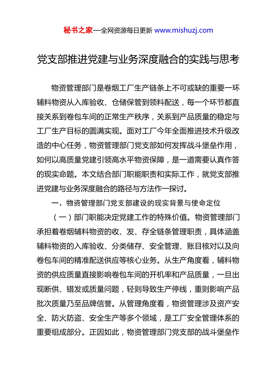 秘书之家—全网资源每日更新 www.mishuzj.com党支部推进党建与业务深度融合的实践与思考 物资管理部门是卷烟工厂生产链条上不可或缺的重要一环辅料物资从入库验收、仓储保管到领料配送,每一个环节都直接关系到卷包车间的正常生产秩序,关系到产品质量的稳定与工厂生产目标的圆满实现。面对工厂今年全面推进技术升级改造的中心任务,物资管理部门党支部如何发挥战斗堡垒作用,如何以高质量党建引领高水平物资保障,是一道需要认真作答的现实命题。本文结合部门职能职责和实际工作,就党支部推进党建与业务深度融合的路径与方法作一探讨。一、物资管理部门党支部建设的现实背景与使命定位(一)部门职能决定党建工作的特殊价值。物资管理部门承担着卷烟辅料物资的收、发、存全链条管理职责,具体涵盖辅料物资的入库验收、分类储存、安全管理、账目核对以及向卷包车间的精准配送供应等核心业务。从生产角度看,辅料物资的供应质量直接影响卷包车间的开机率和产品质量,一旦出现断供、错发或质量问题,轻则导致生产停线,重则影响产品批次质量乃至品牌信誉。从管理角度看,物资管理涉及资产安全、防火防盗、安全生产等多个领域,是工厂安全管理体系的重要组成部分。正因如此,物资管理部门党支部的战斗堡垒作秘书之家—全网资源每日更新 www.mishuzj.com用不仅体现在思想政治工作层面,更直接体现在保障生产、防范风险的实践层面。党建工作做得好不好,在这里有着最直接、最具体的检验标尺。(二)技改任务赋予党建工作新的时代内涵。今年,工厂将全面推进技术升级改造作为年度中心任务,涉及卷包设备更新换代、生产线自动化水平提升、数字化管理系统建设等多个方面。这对物资管理部门提出了全新挑战:一方面,技改期间生产任务并行推进,辅料需求结构将随设备更新而发生显著变化,新规格、新型号辅料的快速导入对仓储管理能力提出更高要求;另一方面,技改施工期间仓储区域的安全管理难度加大,人员流动增加,防火防盗压力上升;此外,技改完成后智能化生产线对辅料配送的精准性和及时性要求将大幅提高,倒逼物资管理模式向数字化、精益化方向转型升级。面对这一系列挑战,党支部必须主动担当、靠前发力,把党建工作的着力点精准落在技改攻坚的关键节点上,把党员的先锋模范作用充分激发出来。(三)行业发展趋势对党建融合提出更高要求。近年来,烟草行业深入推进物流一体化、智慧化、绿色化建设,国家局明确要求全行业坚持“党建与业务深度融合”,推动基层党组织的政治功能与生产经营功能有机统一。从行业实践来看,浙秘书之家—全网资源每日更新 www.mishuzj.com江中烟一体化数字化仓储系统的建设,广西中烟原料智能仓储关键技术的成功应用,贵州烟草物流数智融合的先进经验,均表明物资仓储管理的智能化转型已是大势所趋。物资管理部门党支部必须站在行业发展的高度审视自身定位,把党建工作的生命力融入业务创新的全过程,以党建引领推动部门管理能力的整体跃升。二、党建与业务融合的主要问题及成因分析(一)党建工作与业务工作“两张皮”现象依然存在。当前,物资管理部门党支部在推进党建融合方面取得了一定成效,但也不同程度地存在党建与业务相互割裂的问题。具体表现为:党建活动停留在学习文件、开会传达等形式层面,未能有效转化为解决实际问题的工作动力;党员先锋岗、党员责任区等载体建设流于形式,与岗位职责的结合不够紧密;党支部研究业务、服务业务的能力有待增强,在技改攻坚等重大任务面前,党支部的组织引领作用发挥还不够充分。究其原因,主要在于部分党员干部对党建融合的认识不够深入,将党建工作视为“额外负担”而非推动工作的内在动力,导致党建资源未能有效转化为生产保障能力。(二)物资管理精益化水平与技改要求存在差距。从现实情况看,物资管理部门在精益管理方面仍有较大提升空间。一秘书之家—全网资源每日更新 www.mishuzj.com是库存管理精准度有待提高,辅料物资的动态需求预测能力不足,存在阶段性积压和短缺并存的问题;二是配送效率有待优化,向卷包车间的辅料配送主要依靠人工调度,信息化程度偏低,难以适应技改后高速生产线对精...