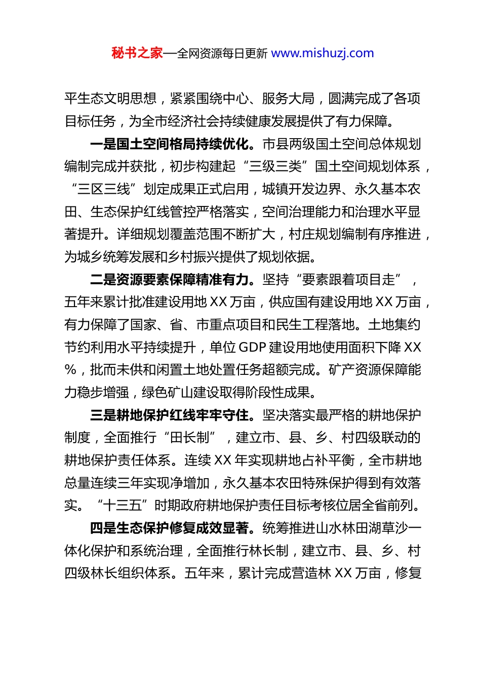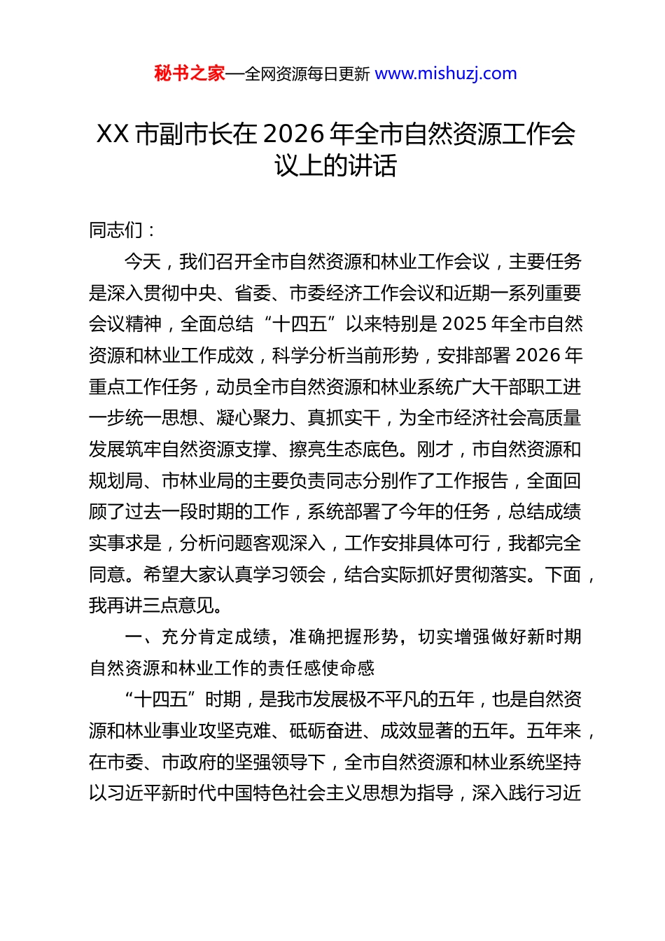 秘书之家—全网资源每日更新 www.mishuzj.comXX 市副市长在 2026 年全市自然资源工作会议上的讲话同志们:今天,我们召开全市自然资源和林业工作会议,主要任务是深入贯彻中央、省委、市委经济工作会议和近期一系列重要会议精神,全面总结“十四五”以来特别是 2025 年全市自然资源和林业工作成效,科学分析当前形势,安排部署 2026 年重点工作任务,动员全市自然资源和林业系统广大干部职工进一步统一思想、凝心聚力、真抓实干,为全市经济社会高质量发展筑牢自然资源支撑、擦亮生态底色。刚才,市自然资源和规划局、市林业局的主要负责同志分别作了工作报告,全面回顾了过去一段时期的工作,系统部署了今年的任务,总结成绩实事求是,分析问题客观深入,工作安排具体可行,我都完全同意。希望大家认真学习领会,结合实际抓好贯彻落实。下面,我再讲三点意见。一、充分肯定成绩,准确把握形势,切实增强做好新时期自然资源和林业工作的责任感使命感“十四五”时期,是我市发展极不平凡的五年,也是自然资源和林业事业攻坚克难、砥砺奋进、成效显著的五年。五年来,在市委、市政府的坚强领导下,全市自然资源和林业系统坚持以习近平新时代中国特色社会主义思想为指导,深入践行习近秘书之家—全网资源每日更新 www.mishuzj.com平生态文明思想,紧紧围绕中心、服务大局,圆满完成了各项目标任务,为全市经济社会持续健康发展提供了有力保障。一是国土空间格局持续优化。市县两级国土空间总体规划编制完成并获批,初步构建起“三级三类”国土空间规划体系,“三区三线”划定成果正式启用,城镇开发边界、永久基本农田、生态保护红线管控严格落实,空间治理能力和治理水平显著提升。详细规划覆盖范围不断扩大,村庄规划编制有序推进,为城乡统筹发展和乡村振兴提供了规划依据。二是资源要素保障精准有力。坚持“要素跟着项目走”,五年来累计批准建设用地 XX 万亩,供应国有建设用地 XX 万亩,有力保障了国家、省、市重点项目和民生工程落地。土地集约节约利用水平持续提升,单位 GDP 建设用地使用面积下降 XX%,批而未供和闲置土地处置任务超额完成。矿产资源保障能力稳步增强,绿色矿山建设取得阶段性成果。三是耕地保护红线牢牢守住。坚决落实最严格的耕地保护制度,全面推行“田长制”,建立市、县、乡、村四级联动的耕地保护责任体系。连续 XX 年实现耕地占补平衡,全市耕地总量连续三年实现净增加,永久基本农田特殊保护得到有效落实。“十三五”时期政府耕地保护责任目标考核位居全省前列。四是生态保护修复成效显著。统筹推进山水林田湖草沙一体化保护和系统治理,全面推行林长制,建立市、县、乡、村四级林长组织体系。五年来,累计完成营造林 XX 万亩,修复秘书之家—全网资源每日更新 www.mishuzj.com退化林 XX 万亩,森林覆盖率稳定在 XX%,森林蓄积量达到XX 万立方米。湿地保护率稳步提升,生物多样性保护得到加强,自然保护地体系建设加快推进。历史遗留矿山生态修复治理取得积极进展。五是林业改革发展稳步推进。集体林权制度改革不断深化,新型林业经营主体蓬勃发展。林业产业提质增效,油茶、竹木加工、森林旅游、林下经济等特色产业产值突破 XX 亿元。森林防火能力持续增强,林业有害生物防治成效明显,未发生重特大森林火灾和重大林业疫情。六是惠民利民服务提质增效。不动产统一登记制度改革全面落地,一般登记、抵押登记办理时间大幅压缩至 X 个工作日以内,历史遗留问题导致的不动产“办证难”化解率超过 XX%,惠及群众 XX 万户。地质灾害防治能力持续提升,成功避让多起地质灾害,有效保护了人民群众生命财产安全。在肯定成绩的同时,我们也要清醒地看到,我市自然资源和林业工作仍面临一些突出问题和挑战。主要表现在:资源要素保障压力持续增大,发展与保护的矛盾依然突出;节约集约利用水平有待提高,粗放利用、闲置浪费现象仍不同程度存在;耕地保护长效机制还不够健全,个别地方违法占用耕地问题时有发生;生态系统质量和稳定性有待进一步提升,生态修复的系统性、科学性需要加强;数字化治理能力、全链条监管效能还有较...