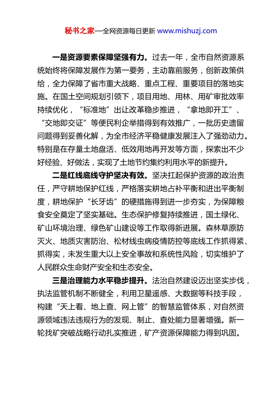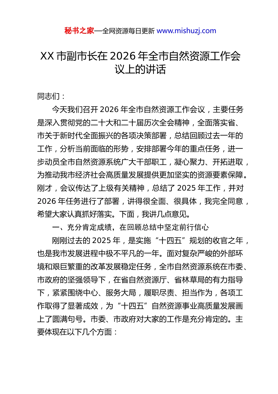 秘书之家—全网资源每日更新 www.mishuzj.comXX 市副市长在 2026 年全市自然资源工作会议上的讲话同志们:今天我们召开 2026 年全市自然资源工作会议,主要任务是深入贯彻党的二十大和二十届历次全会精神,全面落实省、市关于新时代全面振兴的各项决策部署,总结回顾过去一年的工作,分析当前面临的形势,安排部署今年的重点任务,进一步动员全市自然资源系统广大干部职工,凝心聚力、开拓进取,为推动我市经济社会高质量发展提供更加坚实的资源要素保障。刚才,会议传达了上级有关精神,总结了 2025 年工作,并对2026 年任务进行了部署,讲得很全面、很具体,我完全同意,希望大家认真抓好落实。下面,我讲几点意见。一、充分肯定成绩,在回顾总结中坚定前行信心刚刚过去的 2025 年,是实施“十四五”规划的收官之年,也是我市发展进程中极不平凡的一年。面对复杂严峻的外部环境和艰巨繁重的改革发展稳定任务,全市自然资源系统在市委、市政府的坚强领导下,在省自然资源厅、省林草局的有力指导下,紧紧围绕中心、服务大局,履职尽责、担当作为,各项工作取得了显著成效,为“十四五”自然资源事业高质量发展画上了圆满句号。市委、市政府对大家的工作是充分肯定的。主要体现在以下几个方面:秘书之家—全网资源每日更新 www.mishuzj.com一是资源要素保障坚强有力。过去一年,全市自然资源系统始终将保障发展作为第一要务,主动靠前服务,创新政策供给,全力保障了省市重大战略、重点工程、重要项目的落地实施。在国土空间规划引领下,项目用地、用林、用矿审批效率持续优化,“标准地”出让改革稳步推进,“拿地即开工”、“交地即交证”等便民利企举措得到有效推广,一批历史遗留问题得到妥善化解,为全市经济平稳健康发展注入了强劲动力。特别是在存量土地盘活、低效用地再开发等方面,探索出不少好经验、好做法,实现了土地节约集约利用水平的新提升。二是红线底线守护坚决有效。坚决扛起保护资源的政治责任,严守耕地保护红线,严格落实耕地占补平衡和进出平衡制度,耕地保护“长牙齿”的硬措施得到进一步夯实,为保障粮食安全奠定了坚实基础。生态保护修复持续推进,国土绿化、矿山环境治理、绿色矿山建设等工作取得新进展。森林草原防灭火、地质灾害防治、松材线虫病疫情防控等底线工作抓得紧、抓得实,未发生重大以上安全事故和系统性风险,切实维护了人民群众生命财产安全和生态安全。三是治理能力水平稳步提升。法治自然建设迈出坚实步伐,执法监管机制不断健全,利用卫星遥感、大数据等科技手段,构建“天上看、地上查、网上管”的智慧监管体系,对自然资源领域违法违规行为的发现、制止、查处能力显著增强。新一轮找矿突破战略行动扎实推进,矿产资源保障能力得到巩固。秘书之家—全网资源每日更新 www.mishuzj.com基础测绘和地理信息公共服务水平持续提升,全民所有自然资源资产清查试点工作稳步开展,自然资源管理的基础不断夯实。四是干部队伍面貌昂扬向上。全市自然资源系统坚持政治统领,深入开展各类主题教育实践活动,广大干部职工的政治判断力、政治领悟力、政治执行力不断增强。工作作风持续转变,服务意识、担当精神、攻坚能力得到锤炼和提升。党风廉政建设常抓不懈,全面从严治党向纵深推进,全系统风清气正、干事创业的良好政治生态持续巩固。这些成绩的取得,是市委、市政府正确领导的结果,是省厅、省局悉心指导的结果,更是全市自然资源系统广大干部职工团结奋斗、辛勤付出的结果。在此,我代表市委、市政府,向奋战在自然资源工作一线的全体同志们,表示衷心的感谢和诚挚的问候!在肯定成绩的同时,我们也要清醒地认识到,对照新时代新征程的使命任务,对照高质量发展和全面振兴的要求,对照人民群众的更高期盼,我市自然资源工作仍面临不少挑战和短板:资源约束趋紧与发展需求旺盛的矛盾依然突出,耕地保护的压力持续加大,生态保护修复的任务依然艰巨,历史遗留问题化解仍需攻坚,治理体系和治理能力现代化水平有待进一步提升,一些干部的思想观念、能力作风与新时代要求还有差距。对此,我们必须高度重视,采取有力措施,切实加以解...
