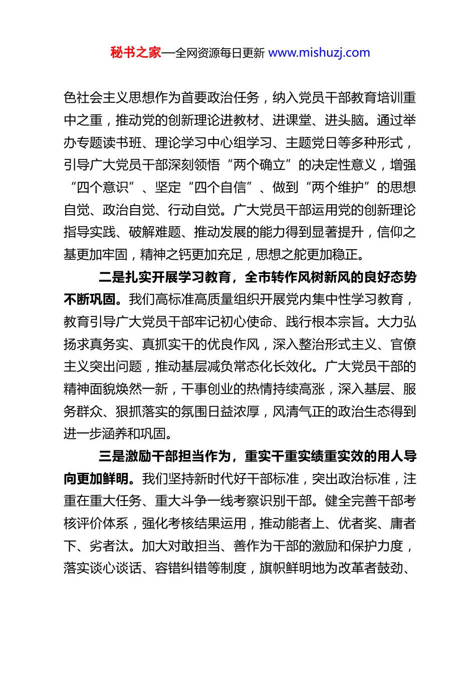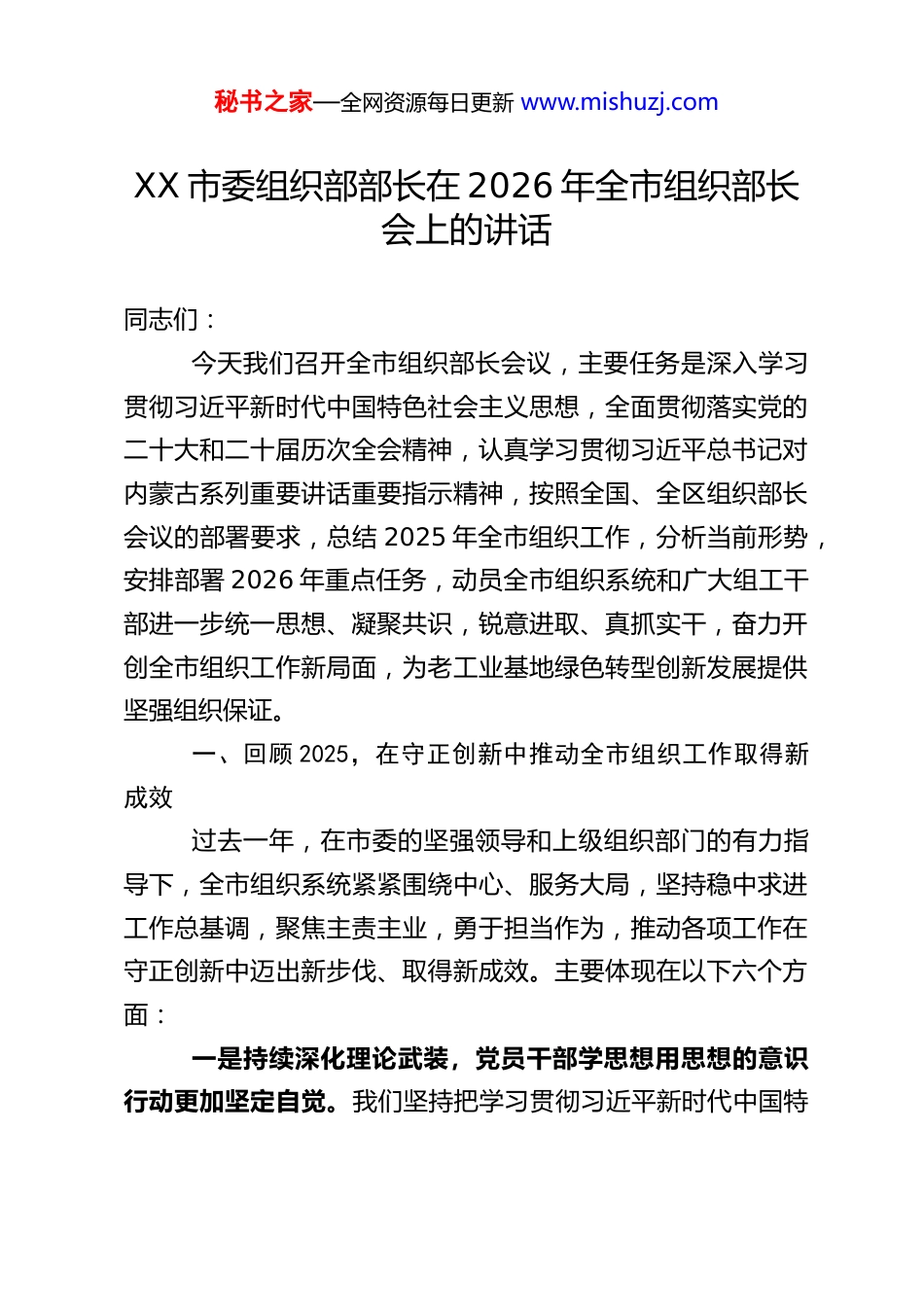 秘书之家—全网资源每日更新 www.mishuzj.comXX 市委组织部部长在 2026 年全市组织部长会上的讲话同志们:今天我们召开全市组织部长会议,主要任务是深入学习贯彻习近平新时代中国特色社会主义思想,全面贯彻落实党的二十大和二十届历次全会精神,认真学习贯彻习近平总书记对内蒙古系列重要讲话重要指示精神,按照全国、全区组织部长会议的部署要求,总结 2025 年全市组织工作,分析当前形势,安排部署 2026 年重点任务,动员全市组织系统和广大组工干部进一步统一思想、凝聚共识,锐意进取、真抓实干,奋力开创全市组织工作新局面,为老工业基地绿色转型创新发展提供坚强组织保证。一、回顾 2025,在守正创新中推动全市组织工作取得新成效过去一年,在市委的坚强领导和上级组织部门的有力指导下,全市组织系统紧紧围绕中心、服务大局,坚持稳中求进工作总基调,聚焦主责主业,勇于担当作为,推动各项工作在守正创新中迈出新步伐、取得新成效。主要体现在以下六个方面:一是持续深化理论武装,党员干部学思想用思想的意识行动更加坚定自觉。我们坚持把学习贯彻习近平新时代中国特秘书之家—全网资源每日更新 www.mishuzj.com色社会主义思想作为首要政治任务,纳入党员干部教育培训重中之重,推动党的创新理论进教材、进课堂、进头脑。通过举办专题读书班、理论学习中心组学习、主题党日等多种形式,引导广大党员干部深刻领悟“两个确立”的决定性意义,增强“四个意识”、坚定“四个自信”、做到“两个维护”的思想自觉、政治自觉、行动自觉。广大党员干部运用党的创新理论指导实践、破解难题、推动发展的能力得到显著提升,信仰之基更加牢固,精神之钙更加充足,思想之舵更加稳正。二是扎实开展学习教育,全市转作风树新风的良好态势不断巩固。我们高标准高质量组织开展党内集中性学习教育,教育引导广大党员干部牢记初心使命、践行根本宗旨。大力弘扬求真务实、真抓实干的优良作风,深入整治形式主义、官僚主义突出问题,推动基层减负常态化长效化。广大党员干部的精神面貌焕然一新,干事创业的热情持续高涨,深入基层、服务群众、狠抓落实的氛围日益浓厚,风清气正的政治生态得到进一步涵养和巩固。三是激励干部担当作为,重实干重实绩重实效的用人导向更加鲜明。我们坚持新时代好干部标准,突出政治标准,注重在重大任务、重大斗争一线考察识别干部。健全完善干部考核评价体系,强化考核结果运用,推动能者上、优者奖、庸者下、劣者汰。加大对敢担当、善作为干部的激励和保护力度,落实谈心谈话、容错纠错等制度,旗帜鲜明地为改革者鼓劲、秘书之家—全网资源每日更新 www.mishuzj.com为实干者撑腰、为负责者负责。全市干部队伍活力得到有效激发,崇尚实干、注重实绩、讲求实效的导向深入人心,形成了竞相作为、奋发有为的生动局面。四是着力抓基层打基础,党组织的政治功能和组织功能有效提升。我们牢固树立大抓基层的鲜明导向,以提升组织力为重点,突出政治功能,统筹推进各领域基层党组织建设。在农村,深入推进抓党建促乡村振兴,持续整顿软弱涣散村党组织,发展壮大村级集体经济。在城市,深化党建引领基层治理,健全“街道党工委—社区党组织—网格党支部—楼栋党小组”组织体系。在机关、企事业单位、新兴领域等领域,分类施策、精准发力,推动基层党组织全面进步、全面过硬。党员教育管理监督得到加强,党员队伍的先进性和纯洁性进一步彰显。五是厚植人才发展生态,“包揽人才头等大事”品牌效应持续放大。我们坚持党管人才原则,深入实施人才强市战略,聚焦产业发展和科技创新需求,靶向引进高层次人才和急需紧缺人才。持续优化人才政策体系和服务环境,用心用情解决好人才在住房、医疗、子女教育等方面的后顾之忧。深化产教融合、校企合作,加强本土人才培养。积极搭建各类人才创新创业平台,让各类人才的创造活力竞相迸发、聪明才智充分涌流。“包揽人才头等大事”的服务理念深入人心,我市对人才的吸引力、凝聚力不断增强。六是坚持全面从严治部,党的光荣传统和优良作风得到秘书之家—全网资源每日更新 www.mishuzj.com赓续传承。我们坚持以更高标准...