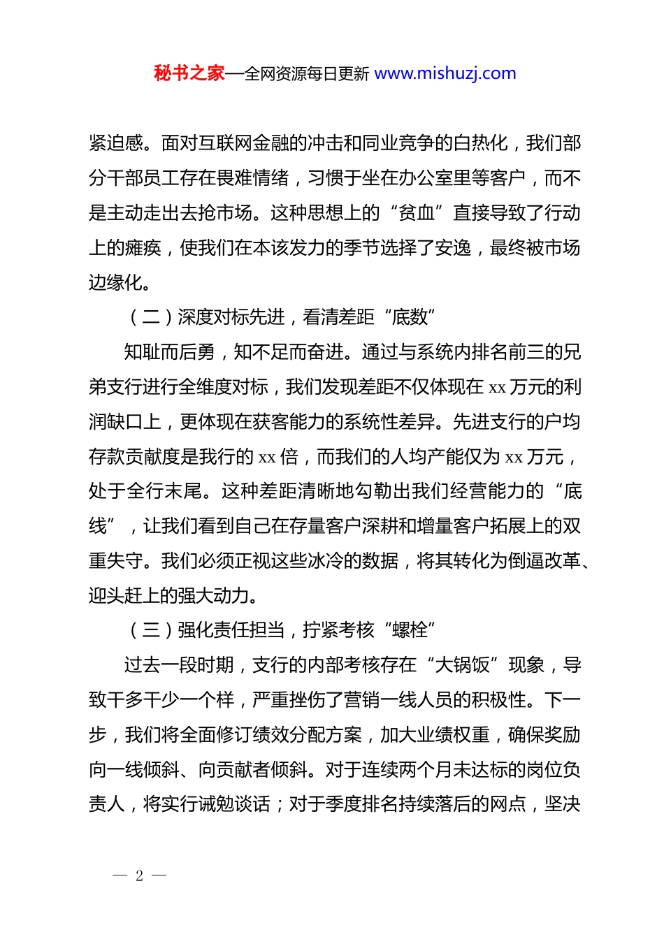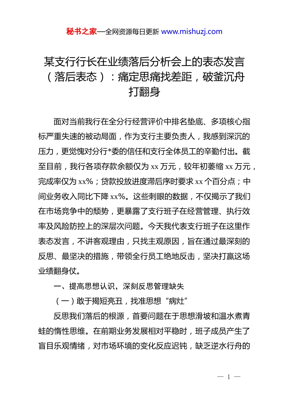 秘书之家—全网资源每日更新 www.mishuzj.com某支行行长在业绩落后分析会上的表态发言(落后表态):痛定思痛找差距,破釜沉舟打翻身面对当前我行在全分行经营评价中排名垫底、多项核心指标严重失速的被动局面,作为支行主要负责人,我感到深沉的压力,更觉愧对分行*委的信任和支行全体员工的辛勤付出。截至目前,我行各项存款余额仅为 xx 万元,较年初萎缩 xx 万元,完成率仅为 xx%;贷款投放进度滞后序时要求 xx 个百分点;中间业务收入同比下降 xx%。这些刺眼的数据,不仅揭示了我们在市场竞争中的颓势,更暴露了支行班子在经营管理、执行效率及风险防控上的深层次问题。今天我代表支行班子在这里作表态发言,不讲客观理由,只找主观原因,旨在通过最深刻的反思、最坚决的措施,带领全行员工绝地反击,坚决打赢这场业绩翻身仗。一、提高思想认识,深刻反思管理缺失(一)敢于揭短亮丑,找准思想“病灶”反思我们落后的根源,首要问题在于思想滑坡和温水煮青蛙的惰性思维。在前期业务发展相对平稳时,班子成员产生了盲目乐观情绪,对市场环境的变化反应迟钝,缺乏逆水行舟的— 1 —秘书之家—全网资源每日更新 www.mishuzj.com紧迫感。面对互联网金融的冲击和同业竞争的白热化,我们部分干部员工存在畏难情绪,习惯于坐在办公室里等客户,而不是主动走出去抢市场。这种思想上的“贫血”直接导致了行动上的瘫痪,使我们在本该发力的季节选择了安逸,最终被市场边缘化。(二)深度对标先进,看清差距“底数”知耻而后勇,知不足而奋进。通过与系统内排名前三的兄弟支行进行全维度对标,我们发现差距不仅体现在 xx 万元的利润缺口上,更体现在获客能力的系统性差异。先进支行的户均存款贡献度是我行的 xx 倍,而我们的人均产能仅为 xx 万元,处于全行末尾。这种差距清晰地勾勒出我们经营能力的“底线”,让我们看到自己在存量客户深耕和增量客户拓展上的双重失守。我们必须正视这些冰冷的数据,将其转化为倒逼改革、迎头赶上的强大动力。(三)强化责任担当,拧紧考核“螺栓”过去一段时期,支行的内部考核存在“大锅饭”现象,导致干多干少一个样,严重挫伤了营销一线人员的积极性。下一步,我们将全面修订绩效分配方案,加大业绩权重,确保奖励向一线倾斜、向贡献者倾斜。对于连续两个月未达标的岗位负责人,将实行诫勉谈话;对于季度排名持续落后的网点,坚决— 2 —秘书之家—全网资源每日更新 www.mishuzj.com实行末位淘汰。我们要通过这种硬指标、硬约束,在全行上下树立起以业绩论英雄的鲜明导向,彻底解决管理环节中“松散软”的顽疾。二、聚焦主责主业,全力冲刺经营指标(一)稳住存款根基,做大资金“池子”存款是银行经营的命脉,面对 xx 万元的缺口,我们必须采取非常规手段进行集中攻坚。支行将启动全员营销计划,实行班子成员包片、部门经理包点、员工包户的责任制,重点瞄准财政资金、代发工资及大额存单市场。我们将利用 xx 天的时间开展专项竞赛,力争实现对公存款日均增长 xx 万元,零售存款新增 xx 万元。通过建立每日通报、每周调度的机制,确保每一笔资金都能落袋为安,为业务发展提供充足的“后勤保障”。(二)优化贷款结构,提升信贷“动能”在贷款投放上,我们要改变过去过度依赖大客户的单一模式,转向普惠金融和消费信贷双轮驱动。针对当前贷款投放落后 xx%的现状,支行将成立三个营销攻坚小组,重点对接产业园区的 xx 家小微企业,实行一户一策的定制化服务。同时,积极推广线上快贷产品,通过简化流程、限时办结等方式,力争在二季度实现新增贷款投放 xx 万元。我们要把信贷投放作为利润增长的“助推器”,在风险可控的前提下,跑出信贷增长的— 3 —秘书之家—全网资源每日更新 www.mishuzj.com加速度。(三)拓展中收渠道,挖掘利润“源泉”中间业务收入是衡量银行轻型化转型的关键,我们 xx%的跌幅说明在财富管理领域已严重掉队。为此,支行将开展财富管理升级行动,重点加大对基金、保险、理财等产品的组合营销力度。我们将对现有的 xx 名贵宾客户进行拉网式梳理,提升资产配置的渗透率,目标是实现户均...