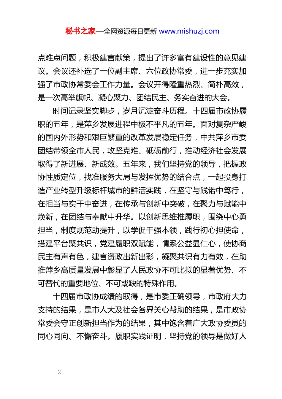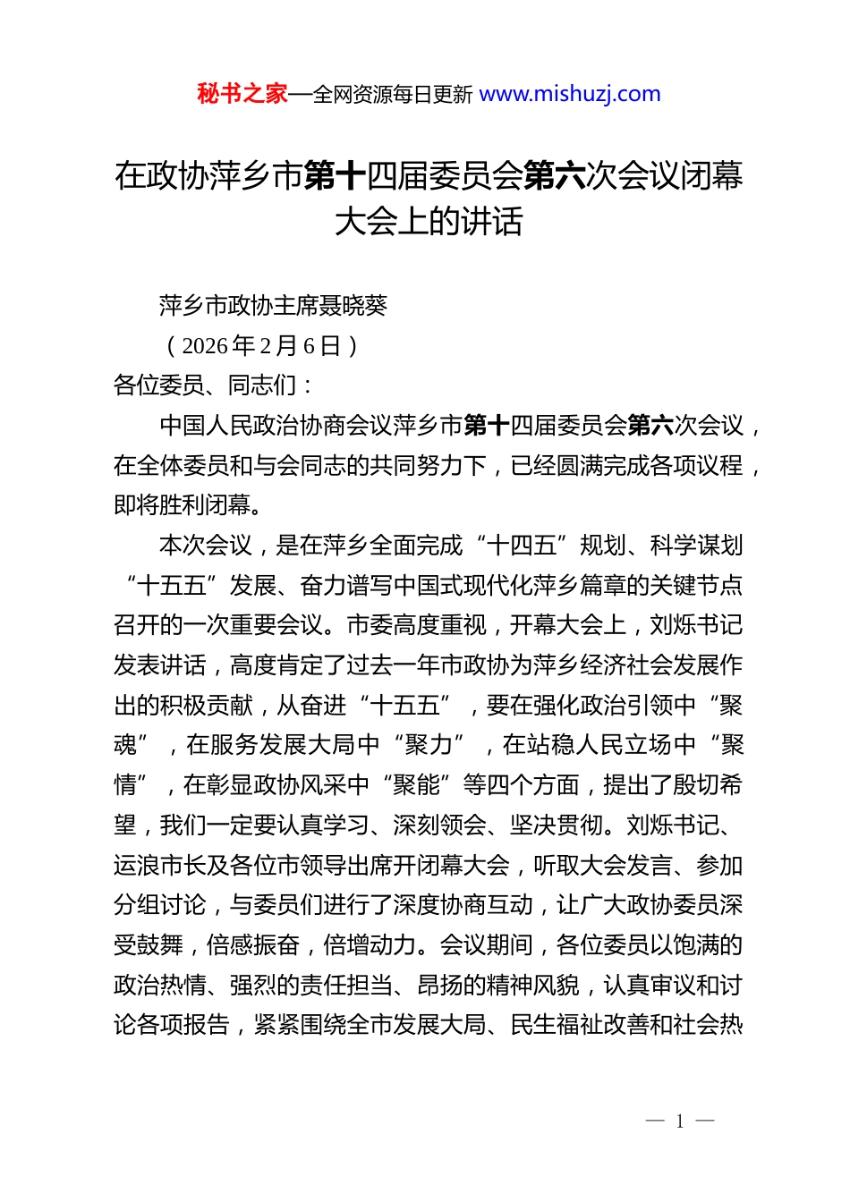 秘书之家—全网资源每日更新 www.mishuzj.com在政协萍乡市第十四届委员会第六次会议闭幕大会上的讲话萍乡市政协主席聂晓葵(2026 年 2 月 6 日)各位委员、同志们:中国人民政治协商会议萍乡市第十四届委员会第六次会议,在全体委员和与会同志的共同努力下,已经圆满完成各项议程,即将胜利闭幕。本次会议,是在萍乡全面完成“十四五”规划、科学谋划“十五五”发展、奋力谱写中国式现代化萍乡篇章的关键节点召开的一次重要会议。市委高度重视,开幕大会上,刘烁书记发表讲话,高度肯定了过去一年市政协为萍乡经济社会发展作出的积极贡献,从奋进“十五五”,要在强化政治引领中“聚魂”,在服务发展大局中“聚力”,在站稳人民立场中“聚情”,在彰显政协风采中“聚能”等四个方面,提出了殷切希望,我们一定要认真学习、深刻领会、坚决贯彻。刘烁书记、运浪市长及各位市领导出席开闭幕大会,听取大会发言、参加分组讨论,与委员们进行了深度协商互动,让广大政协委员深受鼓舞,倍感振奋,倍增动力。会议期间,各位委员以饱满的政治热情、强烈的责任担当、昂扬的精神风貌,认真审议和讨论各项报告,紧紧围绕全市发展大局、民生福祉改善和社会热— 1 —秘书之家—全网资源每日更新 www.mishuzj.com点难点问题,积极建言献策,提出了许多富有建设性的意见建议。会议还补选了一位副主席、六位政协常委,进一步充实加强了市政协常委会工作力量。会议开得隆重热烈、简朴高效,是一次高举旗帜、凝心聚力、团结民主、务实奋进的大会。时间记录坚实脚步,岁月沉淀奋斗历程。十四届市政协履职的五年,是萍乡发展进程中极不平凡的五年。面对复杂严峻的国内外形势和艰巨繁重的改革发展稳定任务,中共萍乡市委团结带领全市人民,攻坚克难、砥砺前行,推动经济社会发展取得了新进展、新成效。五年来,我们坚持党的领导,把握政协性质定位,找准服务大局与发挥优势的结合点,一起投身打造产业转型升级标杆城市的鲜活实践,在坚守与践诺中笃行,在担当与实干中奋进,在传承与创新中突破,在聚力与赋能中焕新,在团结与奉献中升华。以创新思维推履职,围绕中心勇担当,制度规范助提升,以学促干强本领,践行初心担使命,搭建平台聚共识,党建履职双赋能,情系公益显仁心,使协商民主有声有色,建言资政出新出彩,凝聚共识有力有效,在助推萍乡高质量发展中彰显了人民政协不可比拟的显著优势、不可替代的重要地位、不可或缺的特殊作用。十四届市政协成绩的取得,是市委正确领导,市政府大力支持的结果,是市人大及社会各界关心帮助的结果,是市政协常委会守正创新担当作为的结果,其中饱含着广大政协委员的同心同向、不懈奋斗。履职实践证明,坚持党的领导是做好人— 2 —秘书之家—全网资源每日更新 www.mishuzj.com民政协工作的根本保证,厚植为民情怀是做好人民政协工作的价值追求,服务中心大局是做好人民政协工作的核心任务,树立创新思维是做好人民政协工作的关键方法,深入调查研究是做好人民政协工作的基本要求,加强能力建设是做好人民政协工作的重要支撑。各位委员、同志们!“风劲潮涌,自当扬帆破浪;任重道远,更需策马扬鞭”。今年是“十五五”开局之年,是打造产业转型升级标杆城市接续奋斗的一年,也是十四届市政协全面完成履职任务的收官之年。做好今年的工作,意义重大,使命光荣。市委已经擘画了萍乡未来五年发展的宏伟蓝图,明确了全年经济社会发展的目标任务。全市各级政协组织、政协各参加单位和广大政协委员,要切实把思想和行动统一到中央、省委和市委决策部署上来,把智慧和力量凝聚到落实本次会议确定的各项目标任务上来,初心如磐,使命在肩,奋力在新征程上展现政协新气象、干出政协新业绩。一、要始终把牢政治方向,把“党的领导”根植于魂从建国初期的共商国是到新时代的凝心聚力,坚持党的领导始终是做好人民政协工作的根本保证。要把坚持党的领导落实到筑牢“思想同心”中。将习近平新时代中国特色社会主义思想作为统揽政协工作的总纲,在学思践悟中不断增进政治认同、思想认同、理论认同、情感认同,坚持不懈用党的创新理— 3 —秘书之家—全网资源...