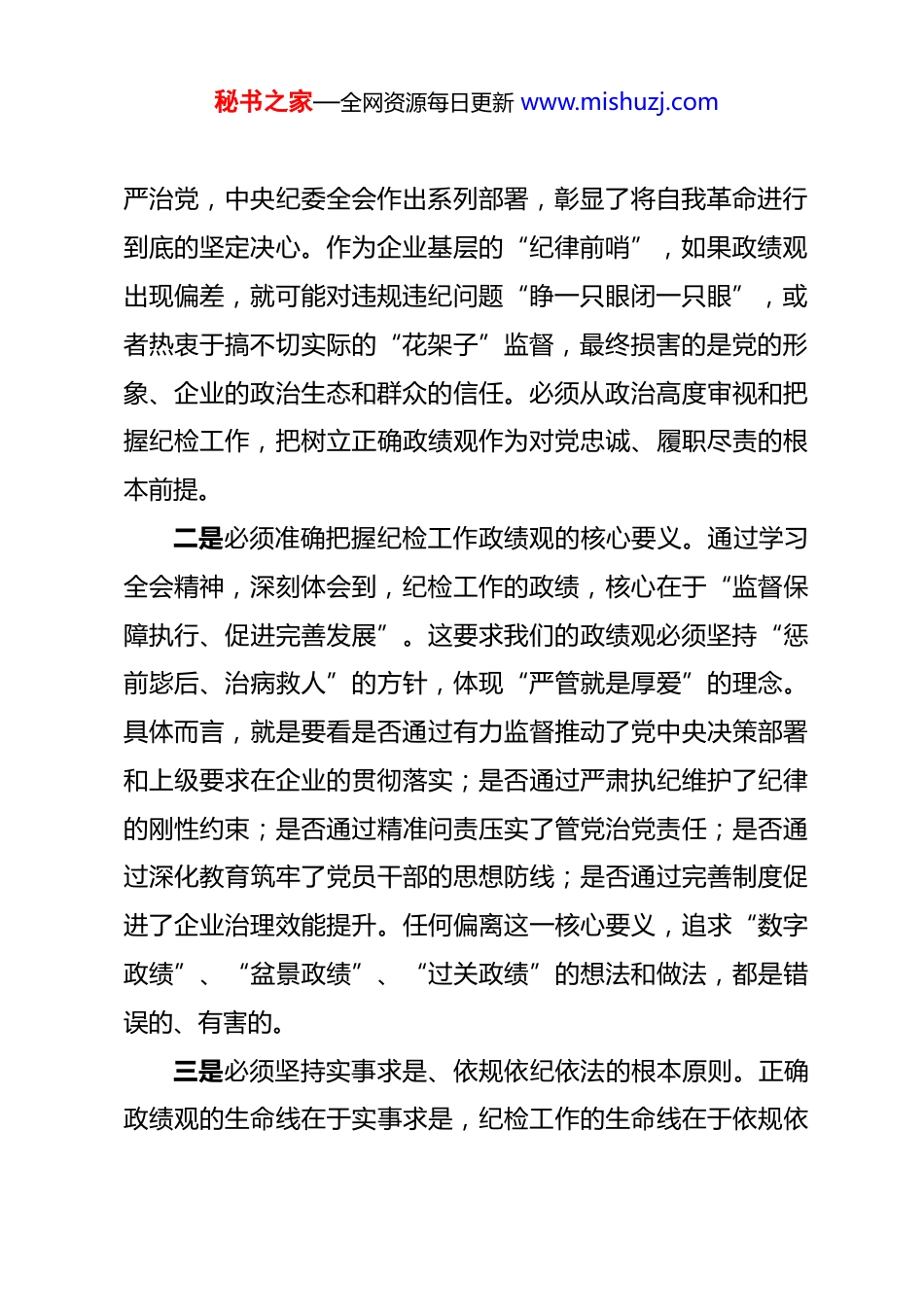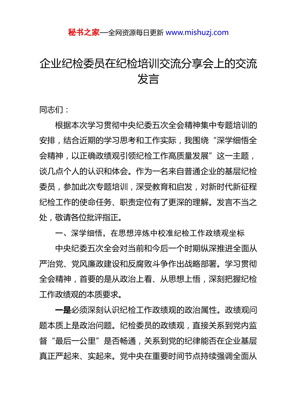 秘书之家—全网资源每日更新 www.mishuzj.com企业纪检委员在纪检培训交流分享会上的交流发言 同志们:根据本次学习贯彻中央纪委五次全会精神集中专题培训的安排,结合近期的学习思考和工作实际,我围绕“深学细悟全会精神,以正确政绩观引领纪检工作高质量发展”这一主题,谈几点个人的认识和体会。作为一名来自普通企业的基层纪检委员,参加此次专题培训,深受教育和启发,对新时代新征程纪检工作的使命任务、职责定位有了更深的理解。发言不当之处,敬请各位批评指正。一、深学细悟,在思想淬炼中校准纪检工作政绩观坐标中央纪委五次全会对当前和今后一个时期纵深推进全面从严治党、党风廉政建设和反腐败斗争作出战略部署。学习贯彻全会精神,首要的是从政治上看、从思想上悟,深刻把握纪检工作政绩观的本质要求。一是必须深刻认识纪检工作政绩观的政治属性。政绩观问题本质上是政治问题。纪检委员的政绩观,直接关系到党内监督“最后一公里”是否畅通,关系到党的纪律能否在企业基层真正严起来、实起来。党中央在重要时间节点持续强调全面从秘书之家—全网资源每日更新 www.mishuzj.com严治党,中央纪委全会作出系列部署,彰显了将自我革命进行到底的坚定决心。作为企业基层的“纪律前哨”,如果政绩观出现偏差,就可能对违规违纪问题“睁一只眼闭一只眼”,或者热衷于搞不切实际的“花架子”监督,最终损害的是党的形象、企业的政治生态和群众的信任。必须从政治高度审视和把握纪检工作,把树立正确政绩观作为对党忠诚、履职尽责的根本前提。二是必须准确把握纪检工作政绩观的核心要义。通过学习全会精神,深刻体会到,纪检工作的政绩,核心在于“监督保障执行、促进完善发展”。这要求我们的政绩观必须坚持“惩前毖后、治病救人”的方针,体现“严管就是厚爱”的理念。具体而言,就是要看是否通过有力监督推动了党中央决策部署和上级要求在企业的贯彻落实;是否通过严肃执纪维护了纪律的刚性约束;是否通过精准问责压实了管党治党责任;是否通过深化教育筑牢了党员干部的思想防线;是否通过完善制度促进了企业治理效能提升。任何偏离这一核心要义,追求“数字政绩”、“盆景政绩”、“过关政绩”的想法和做法,都是错误的、有害的。三是必须坚持实事求是、依规依纪依法的根本原则。正确政绩观的生命线在于实事求是,纪检工作的生命线在于依规依秘书之家—全网资源每日更新 www.mishuzj.com纪依法。这要求我们在履行监督执纪问责职责时,必须坚持一切从实际出发,一是一、二是二,不夸大、不缩小、不歪曲。要精准运用“四种形态”,做到事实清楚、证据确凿、定性准确、处理恰当、手续完备、程序合规。要坚决反对监督中的形式主义、官僚主义,杜绝选择性监督、随意执纪、问责泛化简单化等问题。实事求是、依规依纪依法,既是工作方法,更是必须坚守的政绩底线。二、对标检视,在自我剖析中找准履职短板与差距对照中央纪委五次全会的新部署新要求,对照正确政绩观的内涵,结合自身作为企业纪检委员的工作实际,进行了深刻反思,主要存在以下差距和不足:一是对照政治监督首责查找差距。反思自身,在推动政治监督具体化、精准化、常态化上还存在不足。有时对监督保障党中央重大决策部署和上级工作要求在本单位落实落地的切入点找得不够精准,监督措施不够细化,存在一定的“上下一般粗”现象。对业务工作中的政治风险、廉洁风险研判不够深入,从政治高度发现、分析和处置问题的能力有待提高。这反映出政绩观上可能存在“重业务监督、轻政治监督”的倾向,对纪检工作的政治属性把握不够到位。二是对照监督执纪问责主业查找短板。在日常监督中,有秘书之家—全网资源每日更新 www.mishuzj.com时存在“老好人”思想,怕得罪人、怕伤和气,对一些苗头性、倾向性问题提醒、批评不够及时、不够直接。在问题线索处置和执纪审查中,有时过于依赖传统方式,运用信息化手段、大数据思维发现问题、分析问题的能力不足。在推动以案促改、促治方面,满足于完成规定动作,深挖问题根源、推动建章立制、堵塞管理漏洞的力度和深度有待加强。这反映出政绩观上可能存在“重过程、轻实效”、“重...