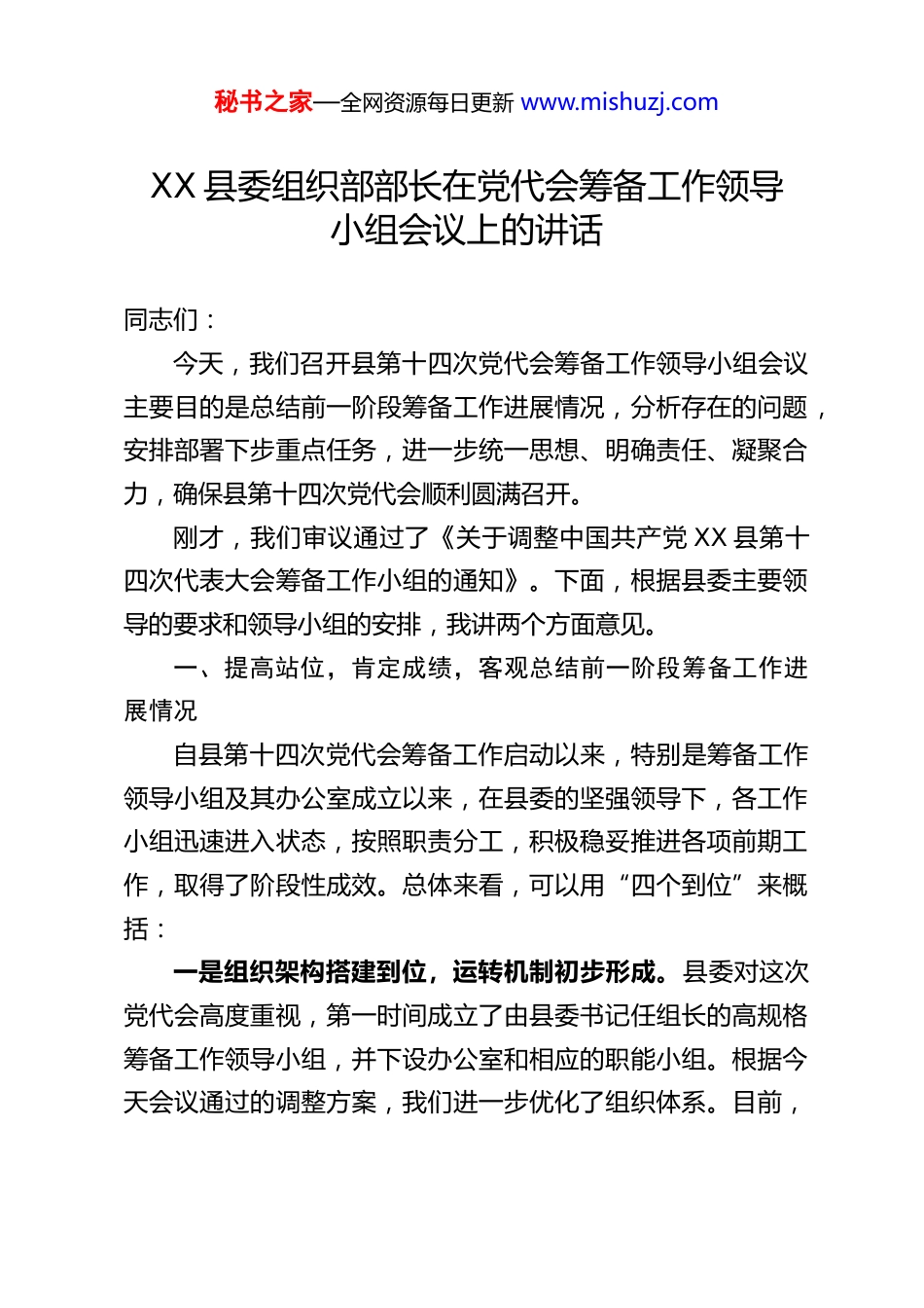 秘书之家—全网资源每日更新 www.mishuzj.comXX 县委组织部部长在党代会筹备工作领导小组会议上的讲话同志们:今天,我们召开县第十四次党代会筹备工作领导小组会议主要目的是总结前一阶段筹备工作进展情况,分析存在的问题,安排部署下步重点任务,进一步统一思想、明确责任、凝聚合力,确保县第十四次党代会顺利圆满召开。刚才,我们审议通过了《关于调整中国共产党 XX 县第十四次代表大会筹备工作小组的通知》。下面,根据县委主要领导的要求和领导小组的安排,我讲两个方面意见。一、提高站位,肯定成绩,客观总结前一阶段筹备工作进展情况自县第十四次党代会筹备工作启动以来,特别是筹备工作领导小组及其办公室成立以来,在县委的坚强领导下,各工作小组迅速进入状态,按照职责分工,积极稳妥推进各项前期工作,取得了阶段性成效。总体来看,可以用“四个到位”来概括:一是组织架构搭建到位,运转机制初步形成。县委对这次党代会高度重视,第一时间成立了由县委书记任组长的高规格筹备工作领导小组,并下设办公室和相应的职能小组。根据今天会议通过的调整方案,我们进一步优化了组织体系。目前,秘书之家—全网资源每日更新 www.mishuzj.com领导小组办公室已实体化运作,建立了周例会、日报告、信息沟通等制度,各项工作机制初步建立并有效运转,形成了“统一领导、分工负责、协调联动”的良好工作格局。二是方案预案制定到位,工作蓝图基本绘就。各工作小组坚持“早谋划、早部署、早启动”,结合各自职责,认真学习上级关于换届工作的政策文件,深入研究吃透精神,广泛借鉴以往经验做法,初步拟定了代表选举、人事安排、文件起草、会务准备、宣传报道、纪律监督、安全保卫等一系列工作方案和应急预案。这些方案既体现了上级要求,又结合了我县实际,具有较强的针对性和可操作性,为我们下一步挂图作战、有序推进提供了清晰的“路线图”和“时间表”。三是基础数据摸排到位,底数情况更加清晰。组织人事组牵头,会同各乡镇、县直各单位党组织,对全县党组织和党员队伍状况进行了全面摸底,特别是对流动党员、年老体弱党员等情况进行了精准掌握,为代表名额分配、选举单位划分等打下了坚实基础。同时,按照干部管理权限和相关政策要求,对现任领导班子成员、拟提名推荐人选的有关情况进行了梳理分析,为县委通盘考虑人事安排提供了第一手资料。四是思想舆论引导到位,换届氛围积极向好。宣传报道组提前介入,围绕“喜迎党代会、奋进新征程”主题,在县内主流媒体开设专栏,系统宣传展示县第十三次党代会以来,特别是“十四五”时期我县经济社会发展取得的辉煌成就、党的建秘书之家—全网资源每日更新 www.mishuzj.com设的显著成效以及涌现出的先进典型。同时,密切关注社情民意和网络舆情,加强分析研判和正面引导,为党代会胜利召开营造了良好的思想舆论氛围。纪律监督组也坚持教育在先、警示在先、预防在先,组织党员干部学习换届纪律要求,通报典型案例,提前敲响警钟。在肯定成绩的同时,我们也要清醒地看到,对标县委的高标准、严要求,对照换届工作的复杂性和艰巨性,我们的筹备工作还存在一些不容忽视的问题:比如,部分工作方案的细节还需进一步打磨,个别环节的责任落实还不够具体,各组之间的协同配合还需要进一步加强,安全保卫等突发情况的应急预案还需要再细化、再演练等等。这些问题,都需要我们在接下来的工作中高度重视,认真加以解决。二、聚焦重点,狠抓落实,高标准高质量完成下阶段筹备工作任务2026 年,是一个具有特殊意义的年份。这一年,我们将迎来了中国共产党成立 105 周年,同时也是“十五五”规划的开局之年。在这个关键节点召开县第十四次党代会,意义重大、影响深远。党代会不仅是全县人民政治生活中的一件大事,更是我们描绘未来五年发展蓝图、选优配强县级领导班子、凝聚全县上下智慧力量,奋力谱写中国式现代化 XX 新篇章的一次总动员。做好筹备工作,直接关系到党代会的质量和效果,关系到换届工作的成败,关系到 XX 长远发展大局。秘书之家—全网资源每日更新 www.mishuzj.com刚才,县委书记用“政治站位要高、风气监督要...