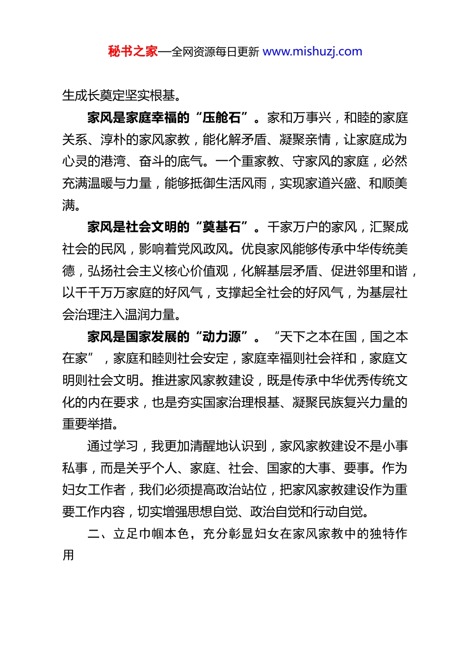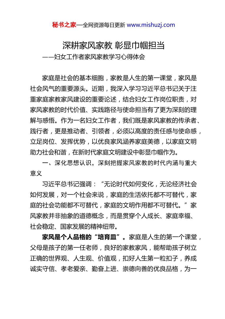 秘书之家—全网资源每日更新 www.mishuzj.com深耕家风家教 彰显巾帼担当——妇女工作者家风家教学习心得体会家庭是社会的基本细胞,家教是人生的第一课堂,家风是社会风气的重要源头。近期,我深入学习习近平总书记关于注重家庭家教家风建设的重要论述,结合妇女工作岗位职责,对家风家教的时代价值、实践路径与使命担当有了更为深刻的理解与感悟。作为一名妇女工作者,我们既是家风家教的传承者、践行者,更是推动者、引领者,必须以高度的责任感与使命感,立足岗位、发挥优势,以优良家风涵养家庭美德,以家庭文明助力社会和谐,在新时代家庭文明建设中彰显巾帼作为。一、深化思想认识,深刻把握家风家教的时代内涵与重大意义习近平总书记强调:“无论时代如何变化,无论经济社会如何发展,对一个社会来说,家庭的生活依托都不可替代,家庭的社会功能都不可替代,家庭的文明作用都不可替代。”家风家教并非抽象的道德概念,而是贯穿个人成长、家庭幸福、社会稳定、国家发展的精神纽带。家风是个人品格的“培育皿”。家庭是人生的第一个课堂,父母是孩子的第一任老师,良好的家教家风,能帮助孩子树立正确的世界观、人生观、价值观,扣好人生第一粒扣子,养成诚实守信、孝老爱亲、勤奋上进、崇德向善的优良品格,为一秘书之家—全网资源每日更新 www.mishuzj.com生成长奠定坚实根基。家风是家庭幸福的“压舱石”。家和万事兴,和睦的家庭关系、淳朴的家风家教,能化解矛盾、凝聚亲情,让家庭成为心灵的港湾、奋斗的底气。一个重家教、守家风的家庭,必然充满温暖与力量,能够抵御生活风雨,实现家道兴盛、和顺美满。家风是社会文明的“奠基石”。千家万户的家风,汇聚成社会的民风,影响着党风政风。优良家风能够传承中华传统美德,弘扬社会主义核心价值观,化解基层矛盾、促进邻里和谐,以千千万万家庭的好风气,支撑起全社会的好风气,为基层社会治理注入温润力量。家风是国家发展的“动力源”。“天下之本在国,国之本在家”,家庭和睦则社会安定,家庭幸福则社会祥和,家庭文明则社会文明。推进家风家教建设,既是传承中华优秀传统文化的内在要求,也是夯实国家治理根基、凝聚民族复兴力量的重要举措。通过学习,我更加清醒地认识到,家风家教建设不是小事私事,而是关乎个人、家庭、社会、国家的大事、要事。作为妇女工作者,我们必须提高政治站位,把家风家教建设作为重要工作内容,切实增强思想自觉、政治自觉和行动自觉。二、立足巾帼本色,充分彰显妇女在家风家教中的独特作用秘书之家—全网资源每日更新 www.mishuzj.com习近平总书记多次强调,要注重发挥妇女在社会生活和家庭生活中的独特作用,发挥妇女在弘扬中华民族家庭美德、树立良好家风方面的独特作用。妇女作为家庭的重要成员,是母亲、是妻子、是女儿,在家庭中扮演着不可替代的角色,是家风家教的直接传承者、生动践行者、关键引领者。妇女是家庭美德的“传承者”。中华优秀传统家风中的孝老爱亲、勤俭持家、邻里团结、诚实守信等美德,大多通过女性的言传身教代代相传。妇女以细腻、温柔、坚韧的特质,将道德规范、行为准则融入日常生活,在点滴中滋养家庭品格,让优良家风生生不息、薪火相传。妇女是家庭教育的“引路人”。母亲是孩子最亲近的陪伴者,妇女的言行举止对子女有着潜移默化、深远持久的影响。从日常起居的习惯养成,到品德修养的培育塑造,再到理想信念的引导树立,妇女始终站在家教一线,用爱心、耐心与责任心,守护孩子成长,培育时代新人。妇女是清廉家风的“守护者”。妇女在家庭中扮演着“廉内助”“贤内助”的重要角色,能够引导家庭成员明大德、守公德、严私德,自觉抵制歪风邪气、弘扬清风正气,筑牢家庭廉洁防线,以清廉家风涵养清朗党风政风、淳朴社风民风。作为妇女工作者,我们更要以身作则、率先垂范,自觉做优良家风的践行者和示范者。在家庭中,孝老爱亲、勤俭持家,用自身言行影响家人;在工作中,坚守初心、廉洁自律,以优秘书之家—全网资源每日更新 www.mishuzj.com良作风树立形象,以自身小家带动千家万户,让优良家风在新时代绽放新光彩。三、坚守岗位使命,推动家风...