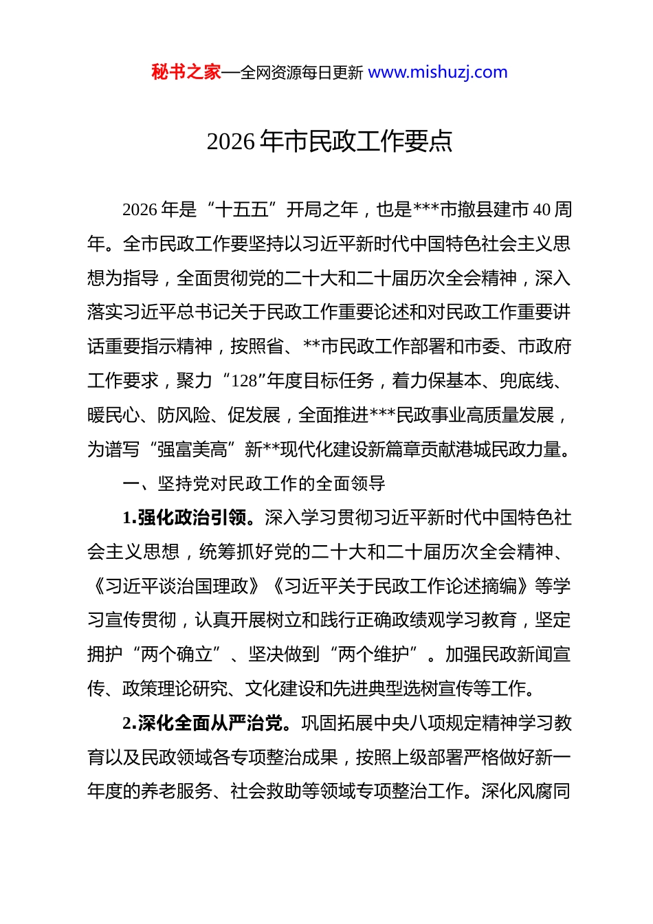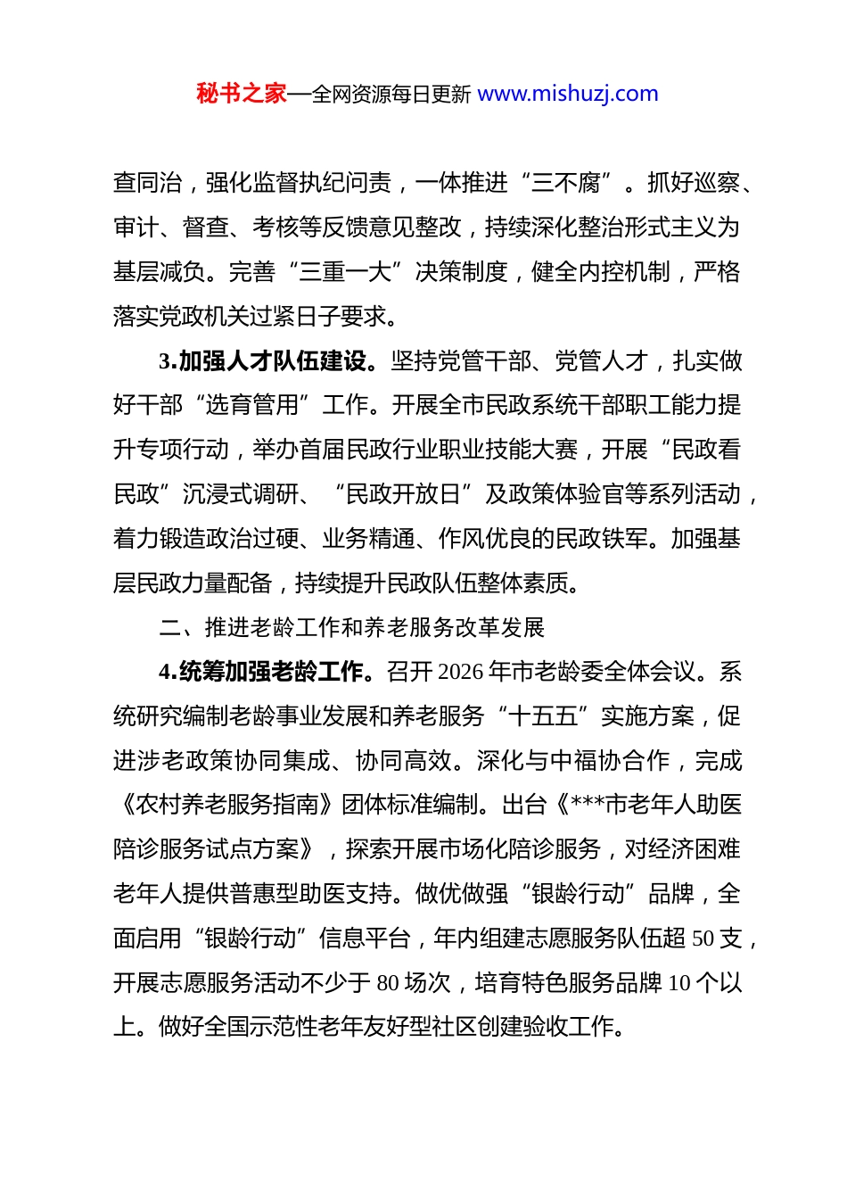 秘书之家—全网资源每日更新 www.mishuzj.com2026 年市民政工作要点 2026 年是“十五五”开局之年,也是***市撤县建市 40 周年。全市民政工作要坚持以习近平新时代中国特色社会主义思想为指导,全面贯彻党的二十大和二十届历次全会精神,深入落实习近平总书记关于民政工作重要论述和对民政工作重要讲话重要指示精神,按照省、**市民政工作部署和市委、市政府工作要求,聚力“128”年度目标任务,着力保基本、兜底线、暖民心、防风险、促发展,全面推进***民政事业高质量发展,为谱写“强富美高”新**现代化建设新篇章贡献港城民政力量。一、坚持党对民政工作的全面领导1.强化政治引领。深入学习贯彻习近平新时代中国特色社会主义思想,统筹抓好党的二十大和二十届历次全会精神、《习近平谈治国理政》《习近平关于民政工作论述摘编》等学习宣传贯彻,认真开展树立和践行正确政绩观学习教育,坚定拥护“两个确立”、坚决做到“两个维护”。加强民政新闻宣传、政策理论研究、文化建设和先进典型选树宣传等工作。2.深化全面从严治党。巩固拓展中央八项规定精神学习教育以及民政领域各专项整治成果,按照上级部署严格做好新一年度的养老服务、社会救助等领域专项整治工作。深化风腐同秘书之家—全网资源每日更新 www.mishuzj.com查同治,强化监督执纪问责,一体推进“三不腐”。抓好巡察、审计、督查、考核等反馈意见整改,持续深化整治形式主义为基层减负。完善“三重一大”决策制度,健全内控机制,严格落实党政机关过紧日子要求。3.加强人才队伍建设。坚持党管干部、党管人才,扎实做好干部“选育管用”工作。开展全市民政系统干部职工能力提升专项行动,举办首届民政行业职业技能大赛,开展“民政看民政”沉浸式调研、“民政开放日”及政策体验官等系列活动,着力锻造政治过硬、业务精通、作风优良的民政铁军。加强基层民政力量配备,持续提升民政队伍整体素质。二、推进老龄工作和养老服务改革发展4.统筹加强老龄工作。召开 2026 年市老龄委全体会议。系统研究编制老龄事业发展和养老服务“十五五”实施方案,促进涉老政策协同集成、协同高效。深化与中福协合作,完成《农村养老服务指南》团体标准编制。出台《***市老年人助医陪诊服务试点方案》,探索开展市场化陪诊服务,对经济困难老年人提供普惠型助医支持。做优做强“银龄行动”品牌,全面启用“银龄行动”信息平台,年内组建志愿服务队伍超 50 支,开展志愿服务活动不少于 80 场次,培育特色服务品牌 10 个以上。做好全国示范性老年友好型社区创建验收工作。秘书之家—全网资源每日更新 www.mishuzj.com5.丰富养老服务内涵。完善市、镇、村三级养老服务网络,织密“15 分钟”居家社区养老服务圈。健全失能老年人照护服务体系,全市养老机构护理型床位占比超 71%。完善普惠支持型养老机构政策体系,全市普惠养老机构占比不少于 12%。深化医养结合,提升一批养老机构认知障碍照护服务专区。落实养老护理员“新八级工”制度,推动养老护理职称体系改革,开展养老护理员职业技能培训。规范实施向中度以上失能老年人发放养老服务消费补贴项目,重点培育失能老年人照护、康复护理等市场化专业服务项目。纵深推进养老服务突出问题专项整治。开展养老机构安全管理强基固本三年行动,落实养老机构服务质量基本规范等强制性标准。6.培育壮大银发经济。探索具有港城特色的“养老+金融”服务模式,与***农村商业银行深化合作,开发适老化金融产品,推进银行网点适老化改造,建设养老综合服务平台。充分激发社区养老活力,支持社会餐饮企业参与老年助餐服务,延伸服务链条。支持连锁化、品牌化养老企业参与运营,推动养老服务产业规模化、集群化发展。三、完善精准高效的社会救助体系7.健全分层分类社会救助体系。贯彻落实《关于进一步完善困难群众综合帮扶的若干措施》,加强排查巡访和关爱帮扶。秘书之家—全网资源每日更新 www.mishuzj.com落实救助保障标准动态调整机制,6 月底前完成标准调整。完善社会救助主动发现机制,将相对低收入人口、支出型困难家庭纳入常态化监测与帮扶体系。强化临时救助“救急难”...