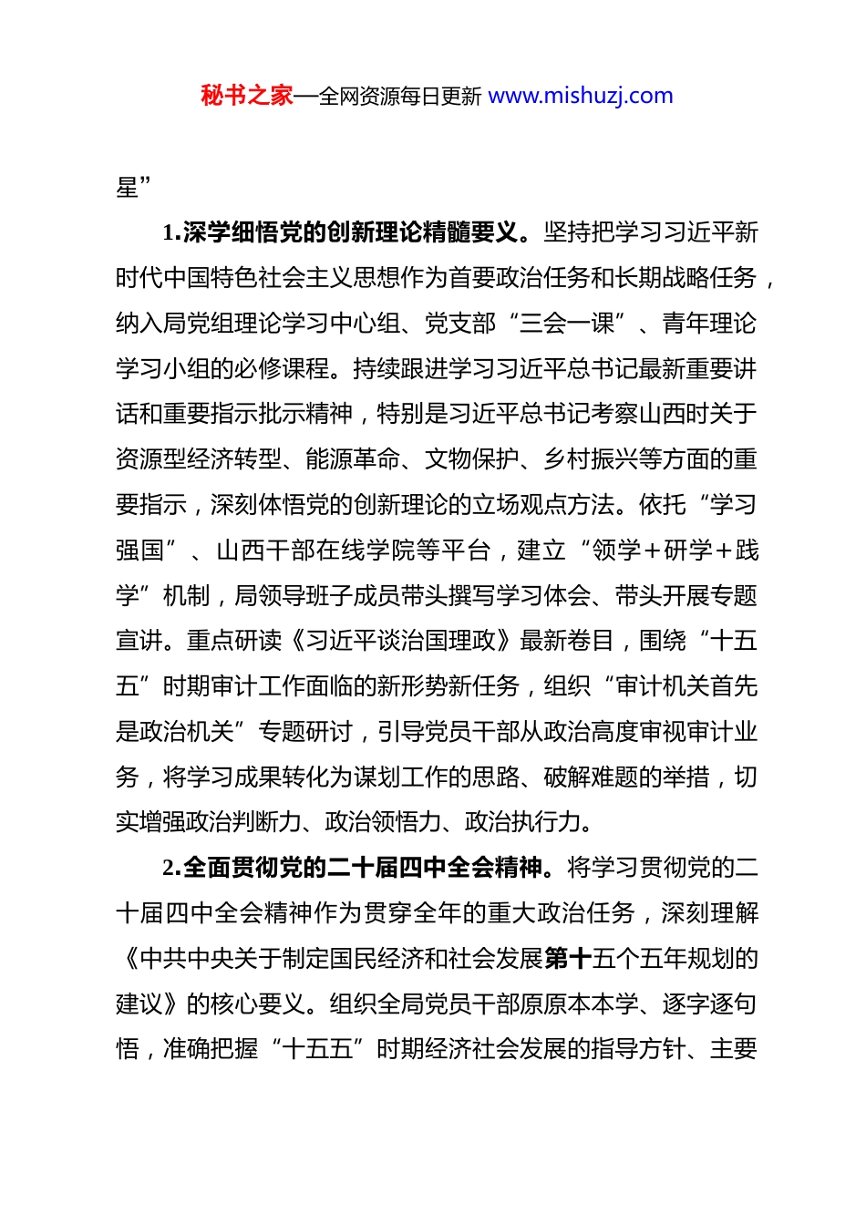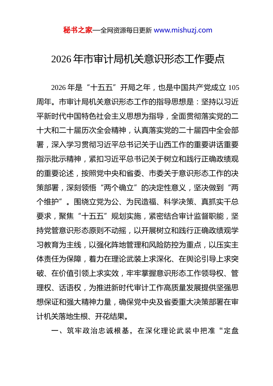 秘书之家—全网资源每日更新 www.mishuzj.com2026 年市审计局机关意识形态工作要点 2026 年是“十五五”开局之年,也是中国共产党成立 105周年。市审计局机关意识形态工作的指导思想是:坚持以习近平新时代中国特色社会主义思想为指导,全面贯彻落实党的二十大和二十届历次全会精神,认真落实党的二十届四中全会部署,深入学习贯彻习近平总书记关于山西工作的重要讲话重要指示批示精神,紧扣习近平总书记关于树立和践行正确政绩观的重要论述,按照党中央和省委、市委关于意识形态工作的决策部署,深刻领悟“两个确立”的决定性意义,坚决做到“两个维护”。围绕立党为公、为民造福、科学决策、真抓实干总要求,聚焦“十五五”规划实施,紧密结合审计监督职能,坚持党管意识形态原则不动摇,以开展树立和践行正确政绩观学习教育为主线,以强化阵地管理和风险防控为重点,以压实主体责任为保障,着力在理论武装上求深化、在舆论引导上求突破、在价值引领上求实效,牢牢掌握意识形态工作领导权、管理权、话语权,为推进新时代审计工作高质量发展提供坚强思想保证和强大精神力量,确保党中央及省委重大决策部署在审计机关落地生根、开花结果。一、筑牢政治忠诚根基,在深化理论武装中把准“定盘秘书之家—全网资源每日更新 www.mishuzj.com星”1.深学细悟党的创新理论精髓要义。坚持把学习习近平新时代中国特色社会主义思想作为首要政治任务和长期战略任务,纳入局党组理论学习中心组、党支部“三会一课”、青年理论学习小组的必修课程。持续跟进学习习近平总书记最新重要讲话和重要指示批示精神,特别是习近平总书记考察山西时关于资源型经济转型、能源革命、文物保护、乡村振兴等方面的重要指示,深刻体悟党的创新理论的立场观点方法。依托“学习强国”、山西干部在线学院等平台,建立“领学+研学+践学”机制,局领导班子成员带头撰写学习体会、带头开展专题宣讲。重点研读《习近平谈治国理政》最新卷目,围绕“十五五”时期审计工作面临的新形势新任务,组织“审计机关首先是政治机关”专题研讨,引导党员干部从政治高度审视审计业务,将学习成果转化为谋划工作的思路、破解难题的举措,切实增强政治判断力、政治领悟力、政治执行力。2.全面贯彻党的二十届四中全会精神。将学习贯彻党的二十届四中全会精神作为贯穿全年的重大政治任务,深刻理解《中共中央关于制定国民经济和社会发展第十五个五年规划的建议》的核心要义。组织全局党员干部原原本本学、逐字逐句悟,准确把握“十五五”时期经济社会发展的指导方针、主要秘书之家—全网资源每日更新 www.mishuzj.com目标和战略任务,特别是关于完善党和国家监督体系、发挥审计监督职能作用的重要部署。邀请市委宣讲团成员或党校教授进行专题辅导,开展“聚焦十五五、审计怎么干”全员大讨论,引导审计干部深刻认识审计工作在服务保障经济社会发展大局中的职责定位。围绕全会提出的建设现代化产业体系、加快高水平科技自立自强等战略部署,找准审计监督的切入点和着力点,把全会精神转化为推动政策落实、规范资金使用、防范化解风险的具体行动。3.深入贯彻中央纪委五次全会精神。认真学习领会习近平总书记在二十届中央纪委五次全会上的重要讲话精神,贯彻落实全会公报各项要求。深刻把握全面从严治党首先要从政治上看的重要论断,清醒认识反腐败斗争的严峻性复杂性,始终保持“赶考”的清醒和坚定。将全会精神纳入审计职业道德教育和廉政警示教育内容,组织观看警示教育片,通报审计系统违纪违法典型案例,用身边事教育身边人。结合审计工作特点,深入研讨“风腐同查同治”在审计实践中的运用路径,教育引导审计干部在监督别人的同时更要管好自己,在纪律规矩面前知敬畏、存戒惧、守底线,切实筑牢拒腐防变的思想堤坝。4.精准落实习近平总书记关于审计工作的重要论述。系统梳理习近平总书记关于审计工作的重要讲话和重要指示批示精秘书之家—全网资源每日更新 www.mishuzj.com神,特别是关于“如臂使指、如影随形、如雷贯耳”的重要要求,开展专题学习月活动。组织编写《审计干部政治理论学习读本》,收录习近平总书记对本部门...
