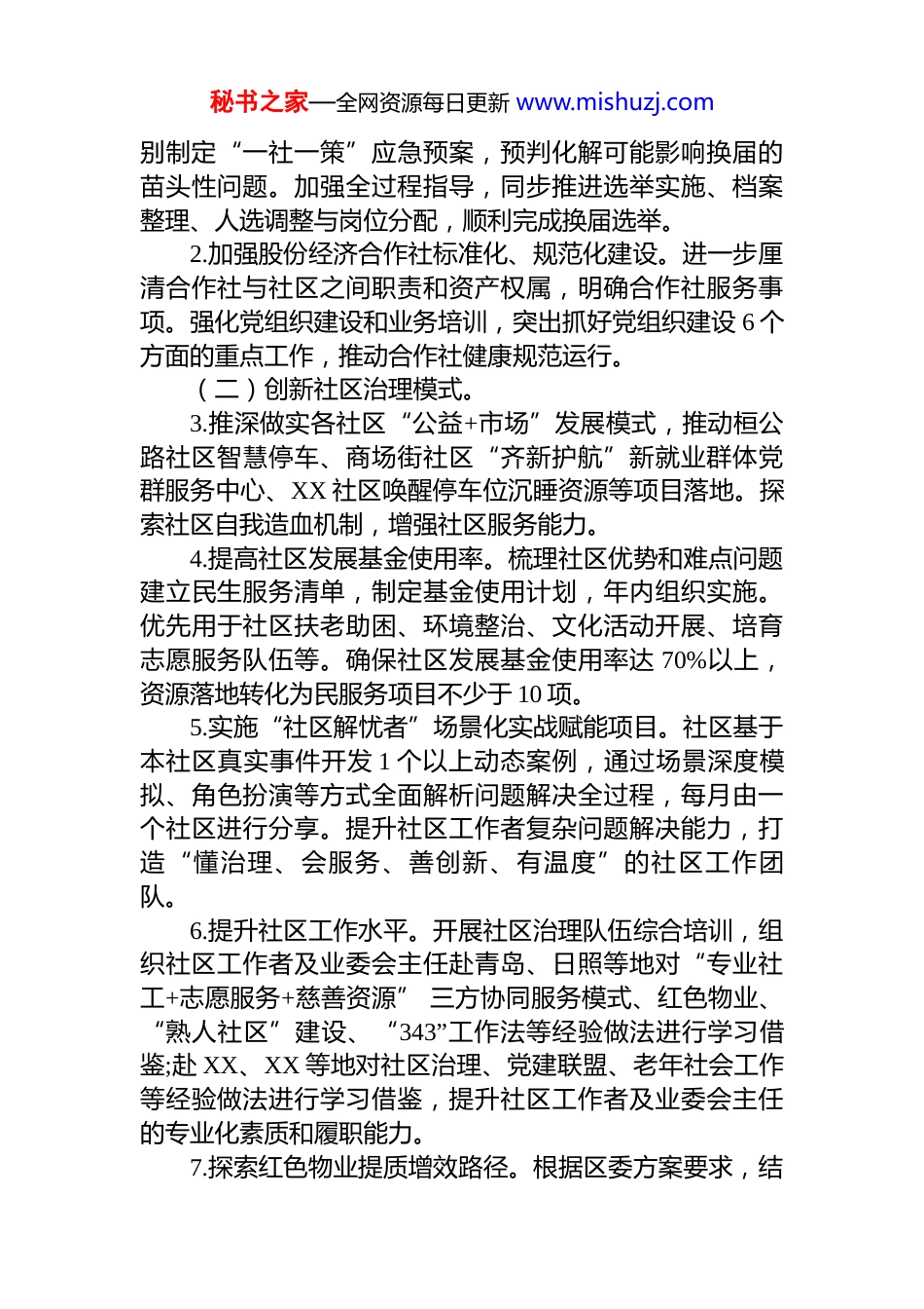 秘书之家—全网资源每日更新 www.mishuzj.comXX 街道 2026 年度工作要点XX 街道 2026 年工作总体思路是:主动融入全区“五大战略”“五城联建”总体部署,围绕“幸福 Xx”建设,推动经济社会高质量发展新跨越。经济发展方面,聚焦“实力强”,推动工业向绿色化、智能化、高端化转型;依托城区商圈,繁荣商贸服务业,培育特色街区与夜间经济,提振消费。基层治理方面,紧扣“高效能”,抓好社区工作者队伍建设,以党建引领深化“红色物业”服务,整合资源提升精细化、现代化治理水平。民生与城市建设方面,围绕“群众富、城市美”,优化公共服务,升级就业创业服务,加强城市更新与生态养护,建设整洁宜居、功能完善的生活空间。2026 年工作目标是:(一)经济发展:全力实现主要经济指标稳步增长,其中规上工业企业总产值增长 5%,限上批发业销售额增长 8%,限上零售业销售额增长 5%,限上住宿业、餐饮业营业额增长 10%,规上服务业营业收入年均增长 5%。确保新建项目按时开工。(二)基层治理:高效完成 2026 年民生实事,建强基层组织队伍,推动集体经济组织规范运行,增强社区自我造血与服务能力,提高社区发展基金使用效能,提升整体物业服务与社区治理水平。(三)民生攻坚:完成堠皋 XX 临园棚改安置任务;基本化解大顺胜利花园不动产登记历史遗留问题;取得上地广场办证工作实质性进展。一、深化基层治理创新,全面建强组织队伍(—)分实组织建设基础。1.高标准、高质量完成社区及股份经济合作社换届工作。成立换届工作专班,针对重难点社区及经济合作社分秘书之家—全网资源每日更新 www.mishuzj.com别制定“一社一策”应急预案,预判化解可能影响换届的苗头性问题。加强全过程指导,同步推进选举实施、档案整理、人选调整与岗位分配,顺利完成换届选举。2.加强股份经济合作社标准化、规范化建设。进一步厘清合作社与社区之间职责和资产权属,明确合作社服务事项。强化党组织建设和业务培训,突出抓好党组织建设 6 个方面的重点工作,推动合作社健康规范运行。(二)创新社区治理模式。3.推深做实各社区“公益+市场”发展模式,推动桓公路社区智慧停车、商场街社区“齐新护航”新就业群体党群服务中心、XX 社区唤醒停车位沉睡资源等项目落地。探索社区自我造血机制,增强社区服务能力。4.提高社区发展基金使用率。梳理社区优势和难点问题建立民生服务清单,制定基金使用计划,年内组织实施。优先用于社区扶老助困、环境整治、文化活动开展、培育志愿服务队伍等。确保社区发展基金使用率达 70%以上,资源落地转化为民服务项目不少于 10 项。5.实施“社区解忧者”场景化实战赋能项目。社区基于本社区真实事件开发 1 个以上动态案例,通过场景深度模拟、角色扮演等方式全面解析问题解决全过程,每月由一个社区进行分享。提升社区工作者复杂问题解决能力,打造“懂治理、会服务、善创新、有温度”的社区工作团队。6.提升社区工作水平。开展社区治理队伍综合培训,组织社区工作者及业委会主任赴青岛、日照等地对“专业社工+志愿服务+慈善资源” 三方协同服务模式、红色物业、“熟人社区”建设、“343”工作法等经验做法进行学习借鉴;赴 XX、XX 等地对社区治理、党建联盟、老年社会工作等经验做法进行学习借鉴,提升社区工作者及业委会主任的专业化素质和履职能力。7.探索红色物业提质增效路径。根据区委方案要求,结秘书之家—全网资源每日更新 www.mishuzj.com合街道实际探索物业提质增效路径,在试点小区取得基本成效的基础上,利用 1-2 年的时间,扩大红色物业覆盖面。使矛盾突出小区物业服务质效有明显提升,推进辖区物业服务效能整体提升。二、全力服务经济提振,持续激发市场活力(一)多措并举提振消费市场。8.推 XXx 购物广场、茂业广场等商业综合体健康发展。全力保障 XXX 购物广场开业运营,持续跟进茂业广场招商情况,及时传达上级促消费政策,协助商业项目做好招商和政策申报工作,激发商圈消费活力。9.积极盘活上地广场等闲置商业综合体资源。主动对接资源,引进优质商业项目,推动辖区闲置商业载体有效利用,优化商业布局。10.实施“烟火...