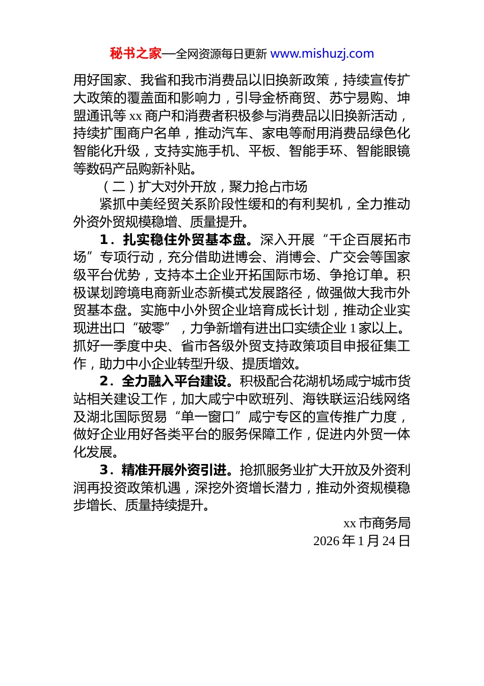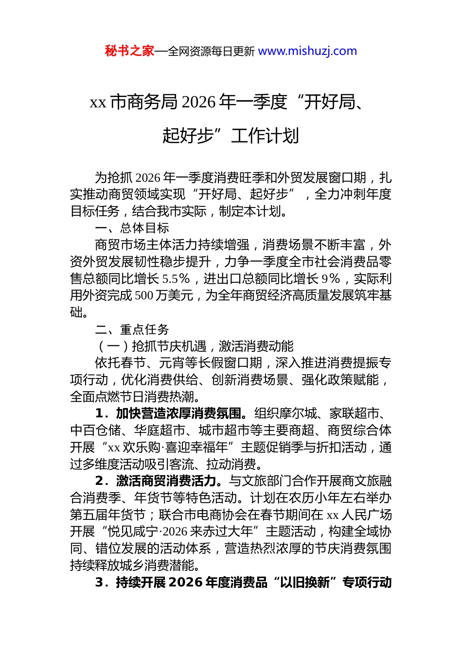 秘书之家—全网资源每日更新 www.mishuzj.comxx 市商务局 2026 年一季度“开好局、起好步”工作计划为抢抓 2026 年一季度消费旺季和外贸发展窗口期,扎实推动商贸领域实现“开好局、起好步”,全力冲刺年度目标任务,结合我市实际,制定本计划。一、总体目标商贸市场主体活力持续增强,消费场景不断丰富,外资外贸发展韧性稳步提升,力争一季度全市社会消费品零售总额同比增长 5.5%,进出口总额同比增长 9%,实际利用外资完成 500 万美元,为全年商贸经济高质量发展筑牢基础。二、重点任务(一)抢抓节庆机遇,激活消费动能依托春节、元宵等长假窗口期,深入推进消费提振专项行动,优化消费供给、创新消费场景、强化政策赋能,全面点燃节日消费热潮。1.加快营造浓厚消费氛围。组织摩尔城、家联超市、中百仓储、华庭超市、城市超市等主要商超、商贸综合体开展“xx 欢乐购·喜迎幸福年”主题促销季与折扣活动,通过多维度活动吸引客流、拉动消费。2.激活商贸消费活力。与文旅部门合作开展商文旅融合消费季、年货节等特色活动。计划在农历小年左右举办第五届年货节;联合市电商协会在春节期间在 xx 人民广场开展“悦见咸宁·2026 来赤过大年”主题活动,构建全域协同、错位发展的活动体系,营造热烈浓厚的节庆消费氛围持续释放城乡消费潜能。3.持续开展 2026 年度消费品“以旧换新”专项行动秘书之家—全网资源每日更新 www.mishuzj.com用好国家、我省和我市消费品以旧换新政策,持续宣传扩大政策的覆盖面和影响力,引导金桥商贸、苏宁易购、坤盟通讯等 xx 商户和消费者积极参与消费品以旧换新活动,持续扩围商户名单,推动汽车、家电等耐用消费品绿色化智能化升级,支持实施手机、平板、智能手环、智能眼镜等数码产品购新补贴。(二)扩大对外开放,聚力抢占市场紧抓中美经贸关系阶段性缓和的有利契机,全力推动外资外贸规模稳增、质量提升。1.扎实稳住外贸基本盘。深入开展“千企百展拓市场”专项行动,充分借助进博会、消博会、广交会等国家级平台优势,支持本土企业开拓国际市场、争抢订单。积极谋划跨境电商新业态新模式发展路径,做强做大我市外贸基本盘。实施中小外贸企业培育成长计划,推动企业实现进出口“破零”,力争新增有进出口实绩企业 1 家以上。抓好一季度中央、省市各级外贸支持政策项目申报征集工作,助力中小企业转型升级、提质增效。2.全力融入平台建设。积极配合花湖机场咸宁城市货站相关建设工作,加大咸宁中欧班列、海铁联运沿线网络及湖北国际贸易“单一窗口”咸宁专区的宣传推广力度,做好企业用好各类平台的服务保障工作,促进内外贸一体化发展。3.精准开展外资引进。抢抓服务业扩大开放及外资利润再投资政策机遇,深挖外资增长潜力,推动外资规模稳步增长、质量持续提升。xx 市商务局2026 年 1 月 24 日