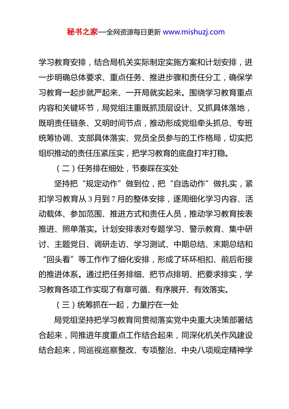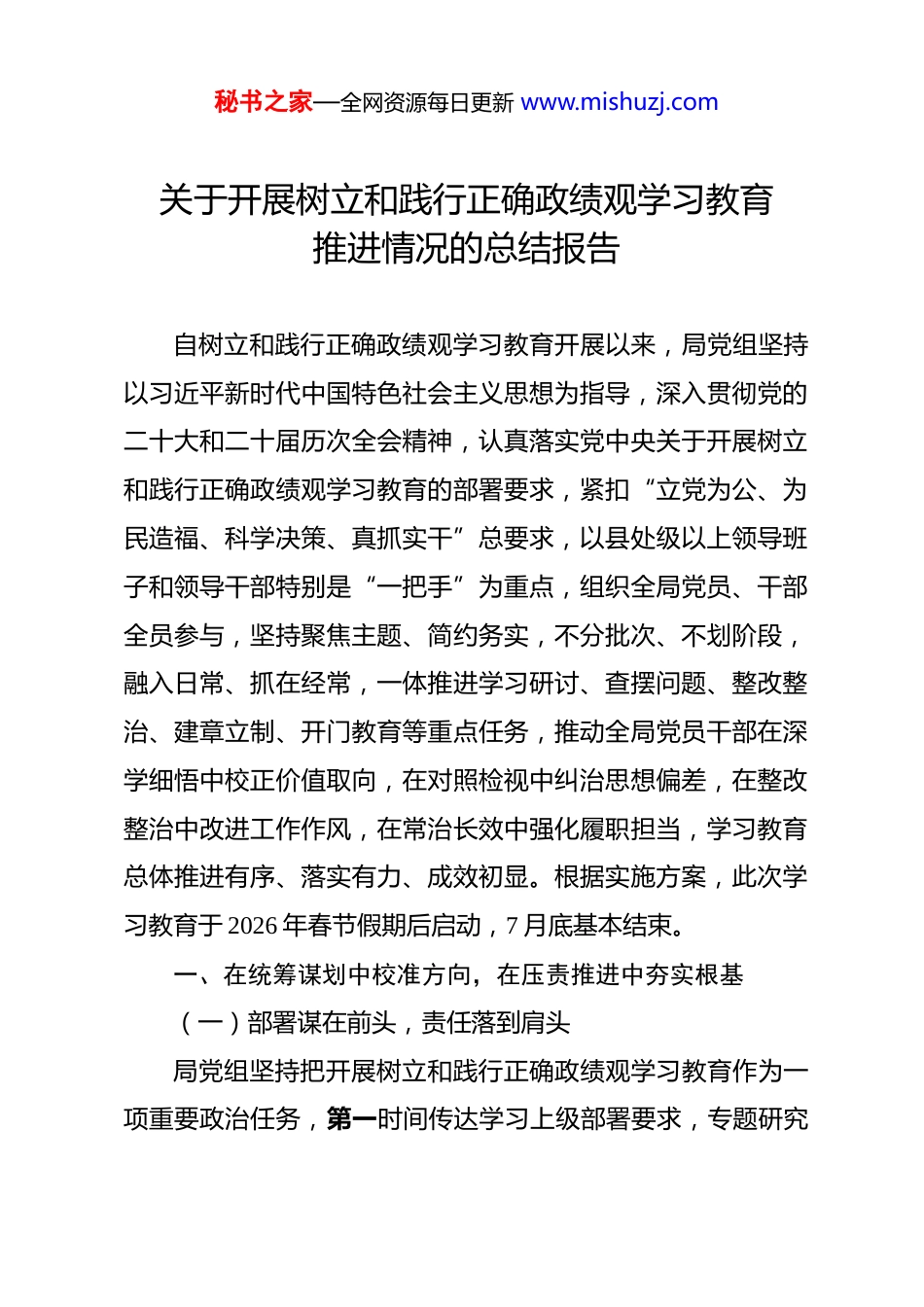 秘书之家—全网资源每日更新 www.mishuzj.com关于开展树立和践行正确政绩观学习教育推进情况的总结报告 自树立和践行正确政绩观学习教育开展以来,局党组坚持以习近平新时代中国特色社会主义思想为指导,深入贯彻党的二十大和二十届历次全会精神,认真落实党中央关于开展树立和践行正确政绩观学习教育的部署要求,紧扣“立党为公、为民造福、科学决策、真抓实干”总要求,以县处级以上领导班子和领导干部特别是“一把手”为重点,组织全局党员、干部全员参与,坚持聚焦主题、简约务实,不分批次、不划阶段,融入日常、抓在经常,一体推进学习研讨、查摆问题、整改整治、建章立制、开门教育等重点任务,推动全局党员干部在深学细悟中校正价值取向,在对照检视中纠治思想偏差,在整改整治中改进工作作风,在常治长效中强化履职担当,学习教育总体推进有序、落实有力、成效初显。根据实施方案,此次学习教育于 2026 年春节假期后启动,7 月底基本结束。一、在统筹谋划中校准方向,在压责推进中夯实根基(一)部署谋在前头,责任落到肩头局党组坚持把开展树立和践行正确政绩观学习教育作为一项重要政治任务,第一时间传达学习上级部署要求,专题研究秘书之家—全网资源每日更新 www.mishuzj.com学习教育安排,结合局机关实际制定实施方案和计划安排,进一步明确总体要求、重点任务、推进步骤和责任分工,确保学习教育一起步就严起来、一开局就实起来。围绕学习教育重点内容和关键环节,局党组注重既抓顶层设计、又抓具体落地,既明责任链条、又明时间节点,推动形成党组牵头抓总、专班统筹协调、支部具体落实、党员全员参与的工作格局,切实把组织推动的责任压紧压实,把学习教育的底盘打牢打稳。(二)任务排在细处,节奏踩在实处坚持把“规定动作”做到位,把“自选动作”做扎实,紧扣学习教育从 3 月到 7 月的整体安排,逐周细化学习内容、活动载体、参加范围、推进方式和责任人员,推动学习教育按表推进、照单落实。计划安排表对专题学习、警示教育、集中研讨、主题党日、调研走访、学习测试、中期总结、末期总结和“回头看”等工作作了细化安排,形成了环环相扣、前后衔接的推进体系。通过把任务排细、把节点排明、把要求排实,学习教育各项工作实现了有章可循、有序展开、有效落实。(三)统筹抓在一起,力量拧在一处局党组坚持把学习教育同贯彻落实党中央重大决策部署结合起来,同推进年度重点工作结合起来,同深化机关作风建设结合起来,同巡视巡察整改、专项整治、中央八项规定精神学秘书之家—全网资源每日更新 www.mishuzj.com习教育整改等工作结合起来,做到一体谋划、一体部署、一体推进。注重防止“两张皮”,不搞空转、不做虚功,不把学习教育停留在会议上、文件上、表态上,而是把学习教育同转作风、提效能、抓落实贯通起来,切实把学习教育成果转化为干事创业的内在动力、解决问题的实际行动和推动工作的具体成效。二、在深学细悟中筑牢根脉,在对标对表中端正取向(一)原文学在深处,原理悟在心处局党组始终把理论学习作为首要任务,组织党员干部深入学习习近平总书记关于树立和践行正确政绩观的重要论述,深入学习《习近平关于树立和践行正确政绩观论述摘编》,同时结合“十五五”规划建议和本部门本领域重要讲话、重要指示精神,一体学习、一体领会、一体把握,教育引导广大党员干部深刻认识树立和践行正确政绩观的重大意义、核心要义和实践要求。实施方案明确,全局党员干部特别是副科级以上领导干部要把个人自学作为基本方式,党组理论学习中心组要定期开展专题研讨,推动学习教育从“全面学”向“深入悟”提升。(二)头雁飞在前头,群雁跟在后头坚持以上率下、示范带动,局领导班子成员带头参加专题学习、带头开展交流研讨、带头讲授专题党课、带头查摆整改秘书之家—全网资源每日更新 www.mishuzj.com问题,推动“关键少数”先学一步、学深一层、作出表率。各党支部依托“三会一课”、主题党日、青年理论学习小组等载体,组织党员干部系统学、跟进学、联系实际学,推动形成领导干部带头学、支部组织集中学、党员干部主动学的浓厚氛围。通过抓住...