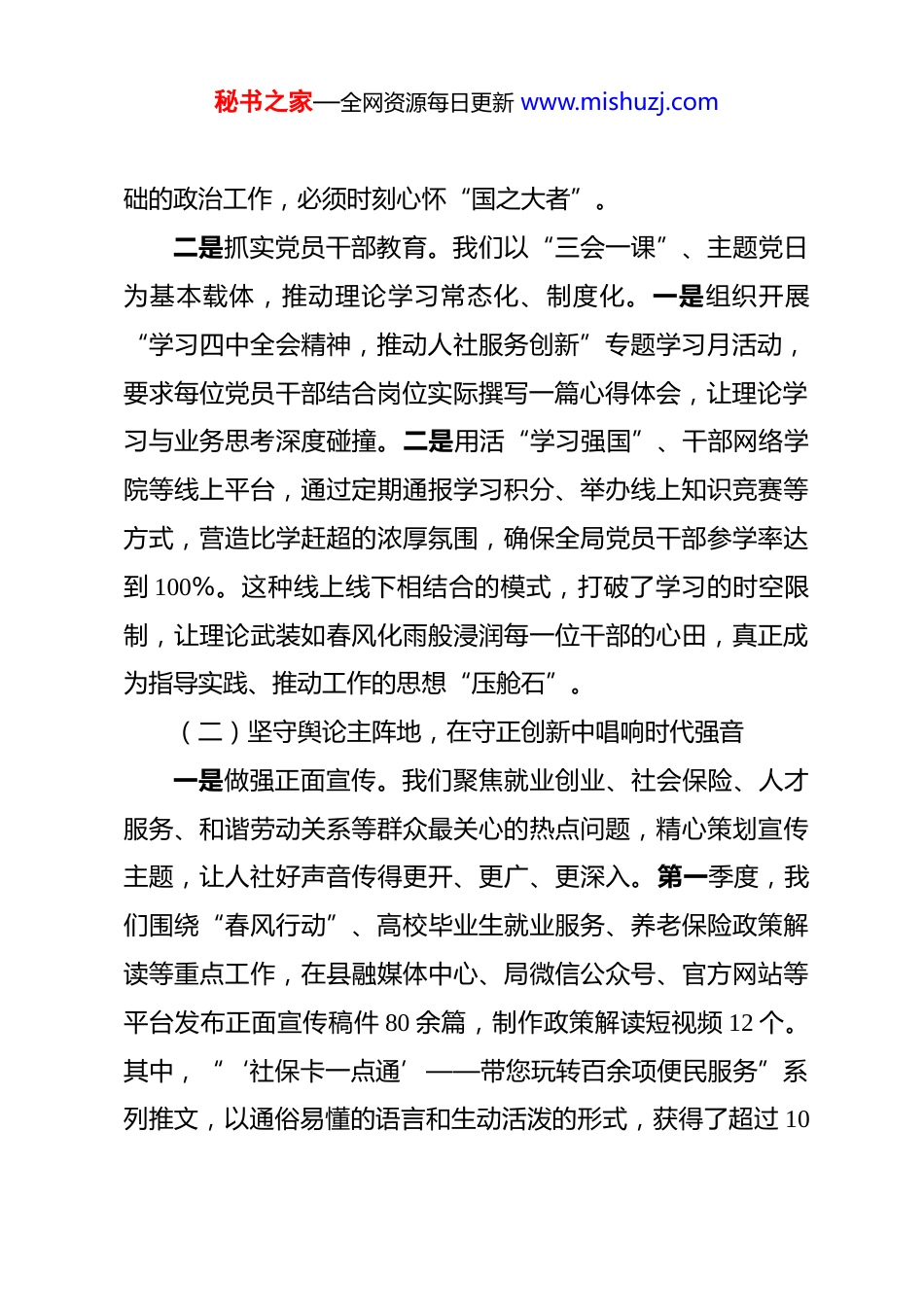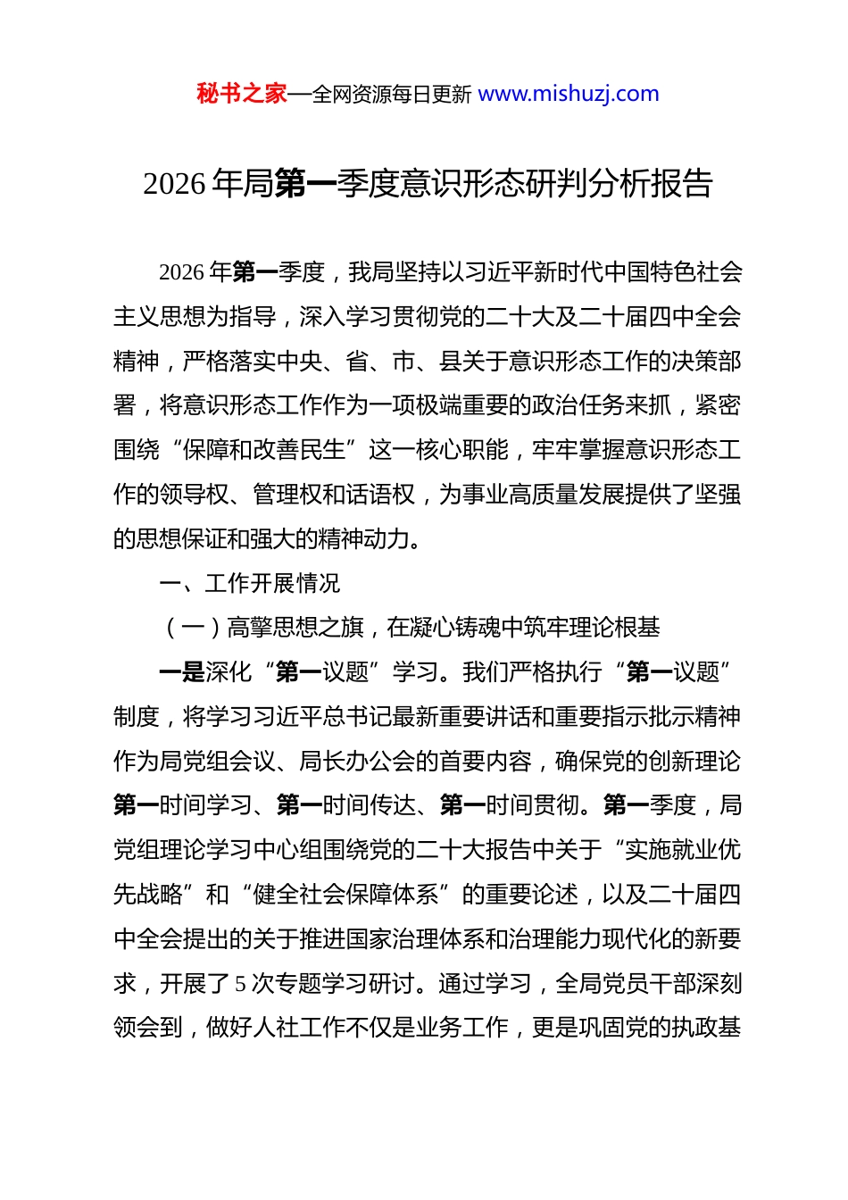 秘书之家—全网资源每日更新 www.mishuzj.com2026 年局第一季度意识形态研判分析报告 2026 年第一季度,我局坚持以习近平新时代中国特色社会主义思想为指导,深入学习贯彻党的二十大及二十届四中全会精神,严格落实中央、省、市、县关于意识形态工作的决策部署,将意识形态工作作为一项极端重要的政治任务来抓,紧密围绕“保障和改善民生”这一核心职能,牢牢掌握意识形态工作的领导权、管理权和话语权,为事业高质量发展提供了坚强的思想保证和强大的精神动力。一、工作开展情况(一)高擎思想之旗,在凝心铸魂中筑牢理论根基一是深化“第一议题”学习。我们严格执行“第一议题”制度,将学习习近平总书记最新重要讲话和重要指示批示精神作为局党组会议、局长办公会的首要内容,确保党的创新理论第一时间学习、第一时间传达、第一时间贯彻。第一季度,局党组理论学习中心组围绕党的二十大报告中关于“实施就业优先战略”和“健全社会保障体系”的重要论述,以及二十届四中全会提出的关于推进国家治理体系和治理能力现代化的新要求,开展了 5 次专题学习研讨。通过学习,全局党员干部深刻领会到,做好人社工作不仅是业务工作,更是巩固党的执政基秘书之家—全网资源每日更新 www.mishuzj.com础的政治工作,必须时刻心怀“国之大者”。二是抓实党员干部教育。我们以“三会一课”、主题党日为基本载体,推动理论学习常态化、制度化。一是组织开展“学习四中全会精神,推动人社服务创新”专题学习月活动,要求每位党员干部结合岗位实际撰写一篇心得体会,让理论学习与业务思考深度碰撞。二是用活“学习强国”、干部网络学院等线上平台,通过定期通报学习积分、举办线上知识竞赛等方式,营造比学赶超的浓厚氛围,确保全局党员干部参学率达到 100%。这种线上线下相结合的模式,打破了学习的时空限制,让理论武装如春风化雨般浸润每一位干部的心田,真正成为指导实践、推动工作的思想“压舱石”。(二)坚守舆论主阵地,在守正创新中唱响时代强音一是做强正面宣传。我们聚焦就业创业、社会保险、人才服务、和谐劳动关系等群众最关心的热点问题,精心策划宣传主题,让人社好声音传得更开、更广、更深入。第一季度,我们围绕“春风行动”、高校毕业生就业服务、养老保险政策解读等重点工作,在县融媒体中心、局微信公众号、官方网站等平台发布正面宣传稿件 80 余篇,制作政策解读短视频 12 个。其中,“‘社保卡一点通’——带您玩转百余项便民服务”系列推文,以通俗易懂的语言和生动活泼的形式,获得了超过 10秘书之家—全网资源每日更新 www.mishuzj.com万人次的阅读量,有效提升了政策的知晓度和群众的获得感。二是做优风险防控。我们坚持底线思维,建立了“横向到边、纵向到底”的意识形态风险排查网络,将风险防控责任压实到每个股室、每个窗口、每名干部。一是建立健全网络舆情监测与处置机制,指定专人每日对涉及我局的各类网络信息进行巡查,做到早发现、早研判、早处置。第一季度,共开展意识形态风险隐患排查 3 轮,成功化解了因个别参保人员对政策理解偏差可能引发的舆情风险 2 起。二是在涉及养老金调整、工伤认定等敏感业务的办理过程中,我们尤其注重加强与服务对象的沟通解释,变被动应付为主动引导,从源头上预防和减少了矛盾的产生。(三)紧扣民生主旋律,在服务大局中彰显人社担当一是以正确政绩观引领高质量就业。我们坚决贯彻“就业是最大民生”的理念,将稳就业、保就业作为检验意识形态工作成效的“试金石”。在工作中,我们摒弃了单纯追求数字的粗放式管理,转而更加注重就业的质量和稳定性。通过精准分析重点群体就业需求,我们成功举办了针对高校毕业生、退役军人和农民工的专场招聘会 6 场,提供岗位超过 3500 个。同时,我们大力宣传“劳动光荣、技能宝贵、创造伟大”的时代风尚,引导求职者树立正确的择业观,推动形成了人尽其才、才尽其秘书之家—全网资源每日更新 www.mishuzj.com用、用有所成的良好局面。二是以人民至上情怀织密社会保障网。我们深刻认识到,社保基金是人民群众的“养老钱”“保命钱”,管好用好每一分钱,就是最...