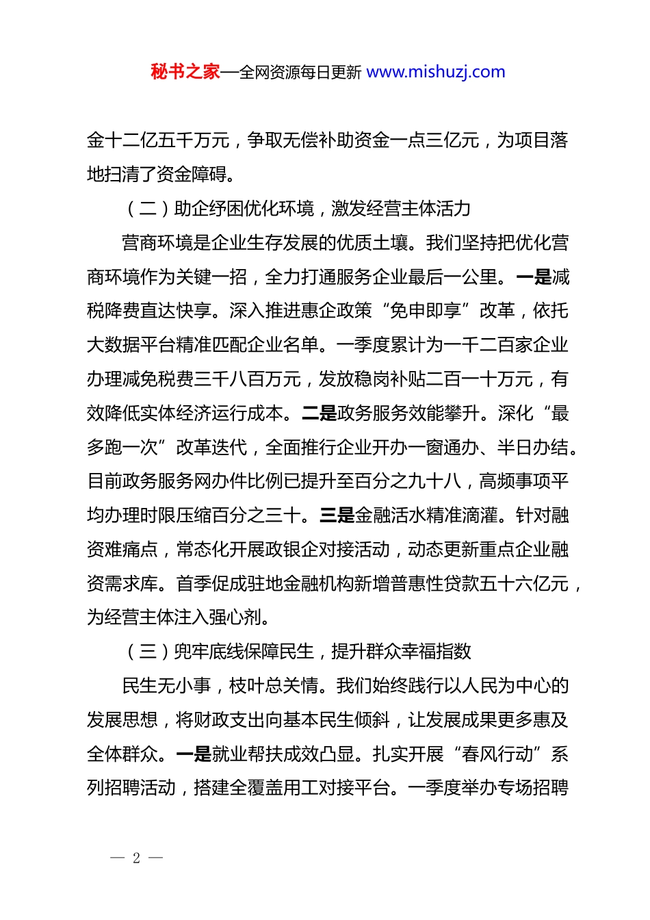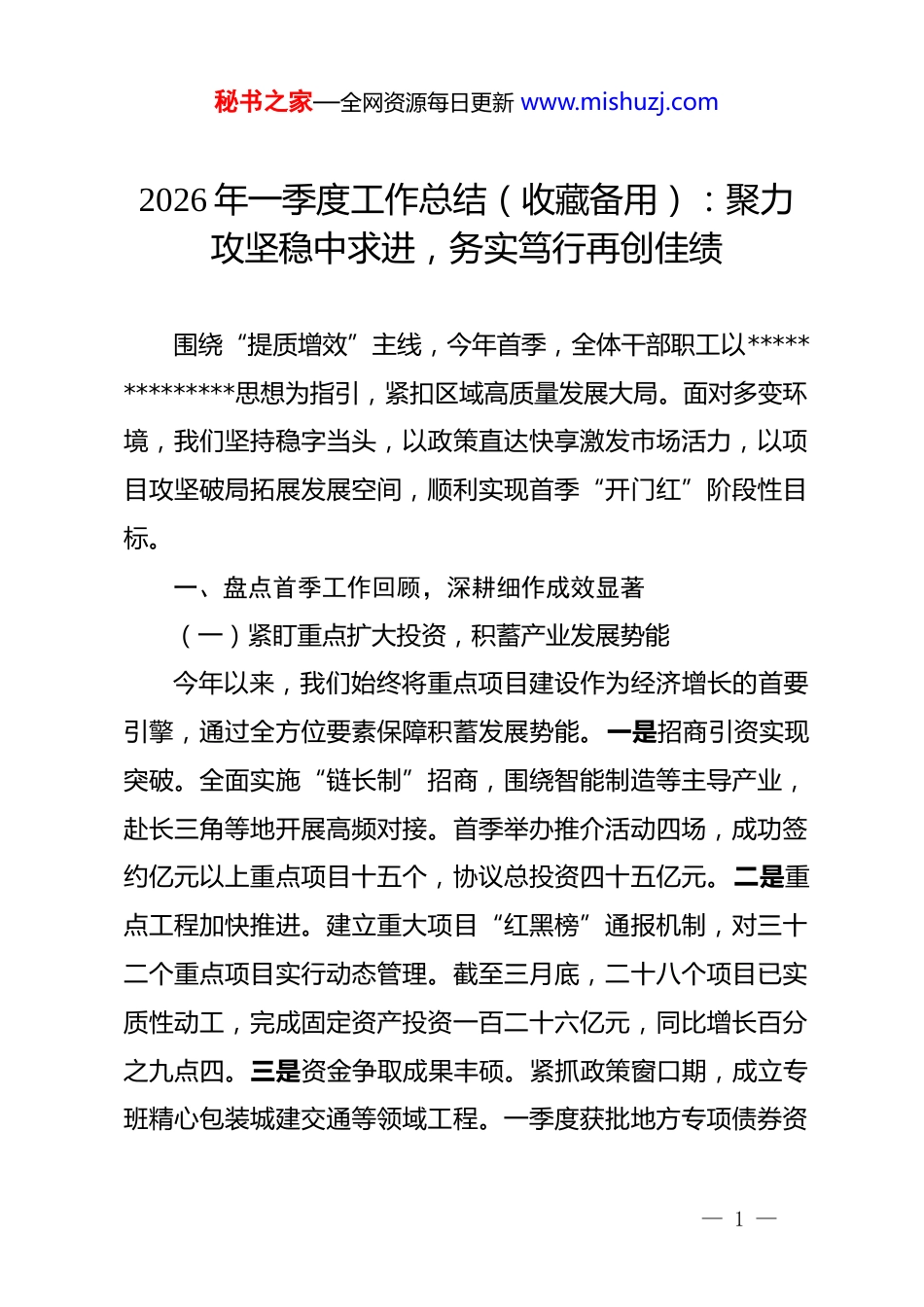 秘书之家—全网资源每日更新 www.mishuzj.com2026 年一季度工作总结(收藏备用):聚力攻坚稳中求进,务实笃行再创佳绩围绕“提质增效”主线,今年首季,全体干部职工以**************思想为指引,紧扣区域高质量发展大局。面对多变环境,我们坚持稳字当头,以政策直达快享激发市场活力,以项目攻坚破局拓展发展空间,顺利实现首季“开门红”阶段性目标。一、盘点首季工作回顾,深耕细作成效显著(一)紧盯重点扩大投资,积蓄产业发展势能今年以来,我们始终将重点项目建设作为经济增长的首要引擎,通过全方位要素保障积蓄发展势能。一是招商引资实现突破。全面实施“链长制”招商,围绕智能制造等主导产业,赴长三角等地开展高频对接。首季举办推介活动四场,成功签约亿元以上重点项目十五个,协议总投资四十五亿元。二是重点工程加快推进。建立重大项目“红黑榜”通报机制,对三十二个重点项目实行动态管理。截至三月底,二十八个项目已实质性动工,完成固定资产投资一百二十六亿元,同比增长百分之九点四。三是资金争取成果丰硕。紧抓政策窗口期,成立专班精心包装城建交通等领域工程。一季度获批地方专项债券资— 1 —秘书之家—全网资源每日更新 www.mishuzj.com金十二亿五千万元,争取无偿补助资金一点三亿元,为项目落地扫清了资金障碍。(二)助企纾困优化环境,激发经营主体活力营商环境是企业生存发展的优质土壤。我们坚持把优化营商环境作为关键一招,全力打通服务企业最后一公里。一是减税降费直达快享。深入推进惠企政策“免申即享”改革,依托大数据平台精准匹配企业名单。一季度累计为一千二百家企业办理减免税费三千八百万元,发放稳岗补贴二百一十万元,有效降低实体经济运行成本。二是政务服务效能攀升。深化“最多跑一次”改革迭代,全面推行企业开办一窗通办、半日办结。目前政务服务网办件比例已提升至百分之九十八,高频事项平均办理时限压缩百分之三十。三是金融活水精准滴灌。针对融资难痛点,常态化开展政银企对接活动,动态更新重点企业融资需求库。首季促成驻地金融机构新增普惠性贷款五十六亿元,为经营主体注入强心剂。(三)兜牢底线保障民生,提升群众幸福指数民生无小事,枝叶总关情。我们始终践行以人民为中心的发展思想,将财政支出向基本民生倾斜,让发展成果更多惠及全体群众。一是就业帮扶成效凸显。扎实开展“春风行动”系列招聘活动,搭建全覆盖用工对接平台。一季度举办专场招聘— 2 —秘书之家—全网资源每日更新 www.mishuzj.com会二十一场,提供优质岗位四千五百个,帮助一千八百名重点群体实现稳定就业,零就业家庭持续动态清零。二是公共服务稳步扩容。加快推进社区“微基建”项目建设,新建投入使用标准化*群服务中心十五个。启动三所城区老旧学校改造提升工程,新增普惠性托育点六个,缓解群众教育关切。三是社会救助日益完善。严格落实防返贫动态监测机制,聚焦低保户等特殊群体。一季度累计发放各类社会救助资金一千五百万元,惠及困难群众八千六百人次,兜住基本民生保障底线。(四)建章立制规范管理,筑牢安全维稳防线安全是发展的前提,发展是安全的保障。我们统筹发展与安全两件大事,以严密的日常监管牢牢守住社会安全稳定大局。一是安全生产平稳向好。聚焦道路交通、消防及建筑施工等高危领域,扎实开展隐患排查整治行动。一季度出动执法人员六百人次,检查生产经营单位四百五十家,闭环整改安全隐患三百四十处,坚决遏制重特大事故发生。二是基层治理提质增效。坚持和发展新时代“枫桥经验”,完善矛盾纠纷多元预防化解机制。充分发挥网格员前哨作用,累计排查调处各类矛盾纠纷两百八十起,当场调解成功率达百分之九十五,切实将隐患消除在萌芽状态。三是应急处突全面加强。修订区级突发公共事件应急预案,充实物资储备库,组建三支常态化综合应急救援— 3 —秘书之家—全网资源每日更新 www.mishuzj.com突击队。首季组织开展应急演练五次,提升抢险协同作战水平。二、检视当前存在问题,直面短板瓶颈突出(一)要素保障尚显滞后,项目推进存在梗阻在推进经济回升向好进程中,资源要素制约瓶颈日益凸显直接影...
