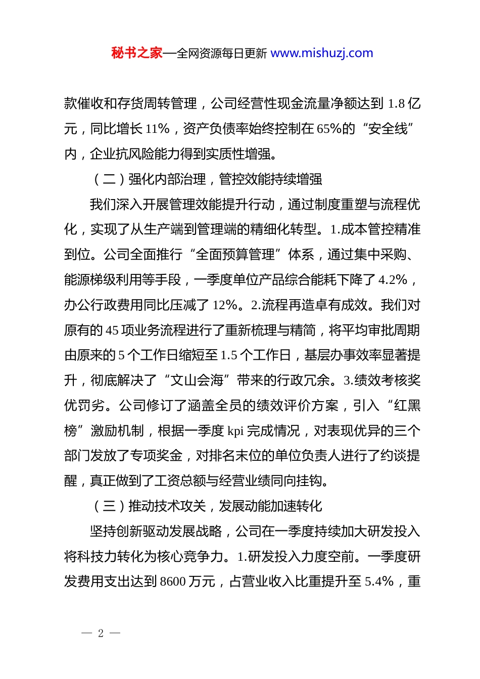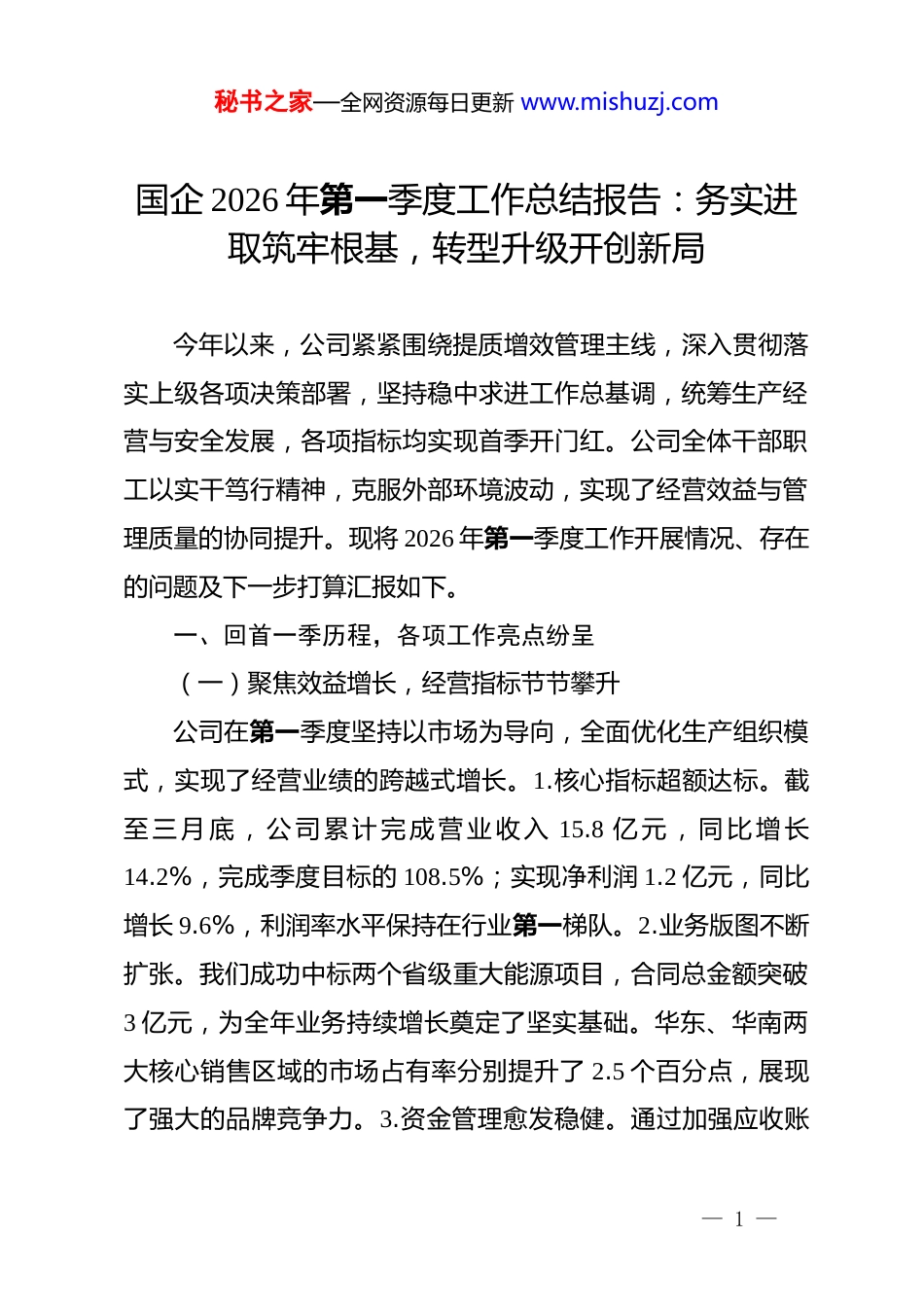 秘书之家—全网资源每日更新 www.mishuzj.com国企 2026 年第一季度工作总结报告:务实进取筑牢根基,转型升级开创新局今年以来,公司紧紧围绕提质增效管理主线,深入贯彻落实上级各项决策部署,坚持稳中求进工作总基调,统筹生产经营与安全发展,各项指标均实现首季开门红。公司全体干部职工以实干笃行精神,克服外部环境波动,实现了经营效益与管理质量的协同提升。现将 2026 年第一季度工作开展情况、存在的问题及下一步打算汇报如下。一、回首一季历程,各项工作亮点纷呈(一)聚焦效益增长,经营指标节节攀升公司在第一季度坚持以市场为导向,全面优化生产组织模式,实现了经营业绩的跨越式增长。1.核心指标超额达标。截至 三 月 底 , 公 司 累 计 完 成 营 业 收 入 15.8 亿 元 , 同 比 增 长14.2%,完成季度目标的 108.5%;实现净利润 1.2 亿元,同比增长 9.6%,利润率水平保持在行业第一梯队。2.业务版图不断扩张。我们成功中标两个省级重大能源项目,合同总金额突破3 亿元,为全年业务持续增长奠定了坚实基础。华东、华南两大核心销售区域的市场占有率分别提升了 2.5 个百分点,展现了强大的品牌竞争力。3.资金管理愈发稳健。通过加强应收账— 1 —秘书之家—全网资源每日更新 www.mishuzj.com款催收和存货周转管理,公司经营性现金流量净额达到 1.8 亿元,同比增长 11%,资产负债率始终控制在 65%的“安全线”内,企业抗风险能力得到实质性增强。(二)强化内部治理,管控效能持续增强我们深入开展管理效能提升行动,通过制度重塑与流程优化,实现了从生产端到管理端的精细化转型。1.成本管控精准到位。公司全面推行“全面预算管理”体系,通过集中采购、能源梯级利用等手段,一季度单位产品综合能耗下降了 4.2%,办公行政费用同比压减了 12%。2.流程再造卓有成效。我们对原有的 45 项业务流程进行了重新梳理与精简,将平均审批周期由原来的 5 个工作日缩短至 1.5 个工作日,基层办事效率显著提升,彻底解决了“文山会海”带来的行政冗余。3.绩效考核奖优罚劣。公司修订了涵盖全员的绩效评价方案,引入“红黑榜”激励机制,根据一季度 kpi 完成情况,对表现优异的三个部门发放了专项奖金,对排名末位的单位负责人进行了约谈提醒,真正做到了工资总额与经营业绩同向挂钩。(三)推动技术攻关,发展动能加速转化坚持创新驱动发展战略,公司在一季度持续加大研发投入将科技力转化为核心竞争力。1.研发投入力度空前。一季度研发费用支出达到 8600 万元,占营业收入比重提升至 5.4%,重— 2 —秘书之家—全网资源每日更新 www.mishuzj.com点支持了三项国家级科研项目的攻关。2.专利成果密集涌现。公司申报发明专利 12 项、实用新型专利 25 项,其中“高精度智能控制系统”成功突破了长期困扰行业的关键技术,填补了国内市场空白。3.数字化转型提质加速。我们完成了生产线自动化改造的第二阶段任务,数字车间覆盖率达到 80%以上。通过部署智能 erp 系统,实现了生产数据实时采集与分析,生产异常响应时间缩短了 35%,企业正在从传统制造向“智慧制造”加速迈进。(四)夯实 dj 引领,企业文化深植人心公司*委严格执行政治理论学习制度,将 dj 工作深度融合到生产经营各环节。1.思想武装成效显著。坚持把学习**************思想作为“第一议题”,一季度累计组织*委会学习 6次、中心组专题研讨 3 次,确保企业发展始终保持正确方向。2.基层组织充满活力。通过开展“*员示范岗”创建活动,评选出一季度先锋*员 15 名,在生产一线组建了 5 支*员攻坚队,成功解决了生产工艺中的“硬骨头”问题,实现了 dj 与业务的“双向奔赴”。3.文化凝聚人心力量。我们组织了“春季健步走”及“最美一线员工”摄影展,丰富了职工精神文化生活。通过持续优化职工食堂环境及宿舍条件,员工满意度调查得分创新高,形成了“企业爱员工、员工爱企业”的和谐氛围。— 3 —秘书之家—全网资源每日更新 www.mishuzj.com二、正视当前困难,发展短板不容忽视(一)市场竞争加剧,业务拓展面临瓶颈在第一季度的运行过...