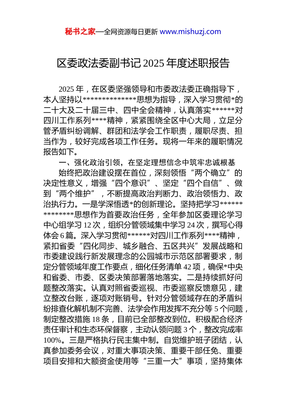 秘书之家—全网资源每日更新 www.mishuzj.com区委政法委副书记 2025 年度述职报告2025 年,在区委坚强领导和市委政法委正确指导下,本人坚持以**************思想为指导,深入学习贯彻*的二十大及二十届三中、四中全会精神,认真落实******对四川工作系列****精神,紧紧围绕全区中心大局,立足分管矛盾纠纷调解、群团和法学会工作职责,履职尽责、担当作为,较好完成各项工作任务。现将一年来的履职情况报告如下。一、强化政治引领,在坚定理想信念中筑牢忠诚根基始终把政治建设摆在首位,深刻领悟“两个确立”的决定性意义,增强“四个意识”、坚定“四个自信”、做到“两个维护”,不断提高政治判断力、政治领悟力、政治执行力。一是学深悟透*的创新理论。坚持把学习**************思想作为首要政治任务,全年参加区委理论学习中心组学习 12 次,组织分管领域集中学习 24 次,撰写心得体会 6 篇。深入学习贯彻******对四川工作系列****精神,紧扣省委“四化同步、城乡融合、五区共兴”发展战略和市委建设践行新发展理念的公园城市示范区部署要求,制定分管领域年度工作要点,细化任务清单 42 项,确保*中央和省委、市委、区委决策部署落地落实。二是持续抓好问题整改落实。认真对照省委巡视、市委巡察反馈意见,建立整改台账,逐项对账销号。针对分管领域存在的矛盾纠纷排查化解机制不完善、法学会作用发挥不充分等 5 个问题,制定整改措施 18 条,目前已全部整改到位。积极配合经济责任审计和生态环保督察,主动认领问题 3 个,整改完成率100%。三是严格执行民主集中制。自觉维护班子团结,认真参加委务会议,对重大事项决策、重要干部任免、重要项目安排和大额资金使用等“三重一大”事项,坚持集体秘书之家—全网资源每日更新 www.mishuzj.com讨论、民主决策。全年参加委务会议 28 次,发表意见建议56 条,推动形成科学决策、民主决策的良好氛围。四是严守政治纪律和政治规矩。认真贯彻《中国共产*政法工作条例》,严格执行重大事项请示报告制度,全年向区委和市委政法委请示报告重大事项 18 次。自觉在思想上政治上行动上同以***同志为核心的*中央保持高度一致,做到*中央提倡的坚决响应、*中央决定的坚决执行、*中央禁止的坚决不做。二、践行正确政绩观,在服务人民群众中彰显初心使命牢固树立以人民为中心的发展思想,坚持把为民造福作为最大政绩,用心用情用力解决群众急难愁盼问题。一是深入践行“四下基层”制度。坚持每月下沉基层一线不少于 4 次,全年深入街道(镇)、社区(村)调研指导 52次,走访群众 380 余人次,收集意见建议 67 条,推动解决群众反映强烈的停车难、噪音扰民等实际问题 23 个。建立分管领域民情日记制度,记录民情信息 156 条,做到件件有回音、事事有着落。二是扎实推进矛盾纠纷多元化解。坚持和发展新时代“枫桥经验”,健全完善矛盾纠纷排查预警、多元化解、跟踪回访三项机制。全年累计排查各类矛盾纠纷 2486 件,化解 2451 件,化解率达 98.59%,其中重大疑难纠纷 43 件全部化解。推动建立“一站式”矛盾纠纷调处中心,整合人民调解、行政调解、司法调解资源,实现群众诉求“一窗口受理、一站式服务、一揽子解决”。创新推行“首席法律咨询专家”制度,选聘 12 名资深法律专家参与疑难复杂纠纷化解,成功化解涉法涉诉信访积案 8件。三是依法做好信访维稳工作。严格落实领导包案制度全年包案化解信访案件 15 件,按期办结率 100%。稳妥处置群体性事件苗头 9 起,有效维护了社会和谐稳定。在重要节假日和敏感节点期间,组织开展矛盾纠纷专项排查 6 轮次,排查隐患 87 个,全部落实化解稳控措施。秘书之家—全网资源每日更新 www.mishuzj.com三、聚焦高质量发展,在服务中心大局中展现担当作为围绕区委“先进制造业高地、现代化品质城区”建设目标,找准政法工作服务大局的切入点和着力点。一是服务保障成渝地区双城经济圈建设。主动融入区域协调发展战略,与重庆**区政法系统建立协作机制,在矛盾纠纷跨区域联调、法治宣传联建、执法司法联动等方面开展合作共同化解跨区域纠纷 12 ...