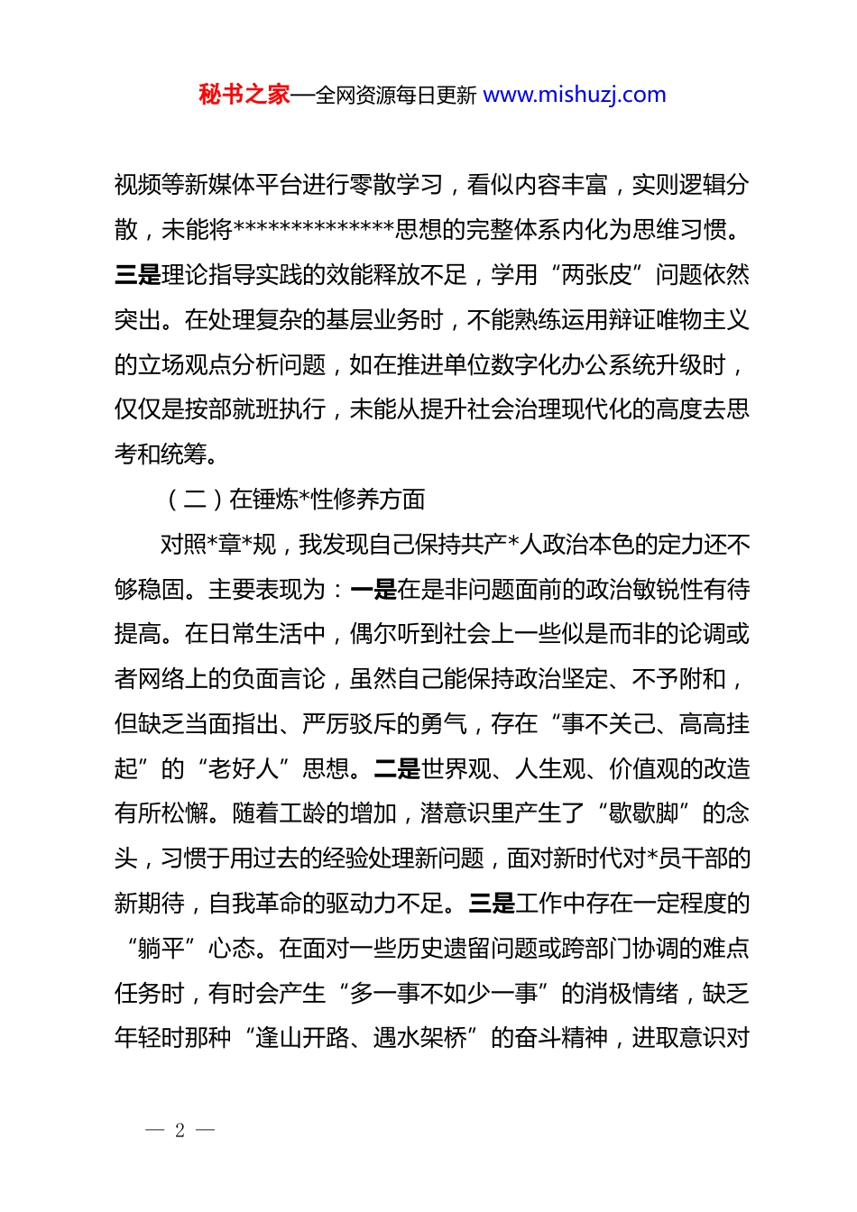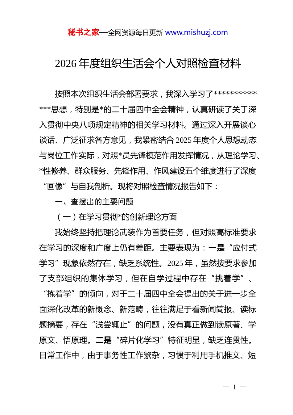 秘书之家—全网资源每日更新 www.mishuzj.com2026 年度组织生活会个人对照检查材料按照本次组织生活会部署要求,我深入学习了**************思想,特别是*的二十届四中全会精神,认真研读了关于深入贯彻中央八项规定精神的相关学习材料。通过深入开展谈心谈话、广泛征求各方意见,我紧密结合 2025 年度个人思想动态与岗位工作实际,对照*员先锋模范作用发挥情况,从理论学习、*性修养、群众服务、先锋作用、作风建设五个维度进行了深度“画像”与自我剖析。现将对照检查情况报告如下:一、查摆出的主要问题(一)在学习贯彻*的创新理论方面我始终坚持把理论武装作为首要任务,但对照高标准要求在学习的深度和广度上仍有差距。主要表现为:一是“应付式学习”现象依然存在,缺乏系统性。2025 年,虽然按要求参加了支部组织的集体学习,但在自学过程中存在“挑着学”、“拣着学”的倾向,对于二十届四中全会提出的关于进一步全面深化改革的新概念、新范畴,往往满足于看新闻简报、读标题摘要,存在“浅尝辄止”的问题,没有真正做到读原著、学原文、悟原理。二是“碎片化学习”特征明显,缺乏连贯性。日常工作中,由于事务性工作繁杂,习惯于利用手机推文、短— 1 —秘书之家—全网资源每日更新 www.mishuzj.com视频等新媒体平台进行零散学习,看似内容丰富,实则逻辑分散,未能将**************思想的完整体系内化为思维习惯。三是理论指导实践的效能释放不足,学用“两张皮”问题依然突出。在处理复杂的基层业务时,不能熟练运用辩证唯物主义的立场观点分析问题,如在推进单位数字化办公系统升级时,仅仅是按部就班执行,未能从提升社会治理现代化的高度去思考和统筹。(二)在锤炼*性修养方面对照*章*规,我发现自己保持共产*人政治本色的定力还不够稳固。主要表现为:一是在是非问题面前的政治敏锐性有待提高。在日常生活中,偶尔听到社会上一些似是而非的论调或者网络上的负面言论,虽然自己能保持政治坚定、不予附和,但缺乏当面指出、严厉驳斥的勇气,存在“事不关己、高高挂起”的“老好人”思想。二是世界观、人生观、价值观的改造有所松懈。随着工龄的增加,潜意识里产生了“歇歇脚”的念头,习惯于用过去的经验处理新问题,面对新时代对*员干部的新期待,自我革命的驱动力不足。三是工作中存在一定程度的“躺平”心态。在面对一些历史遗留问题或跨部门协调的难点任务时,有时会产生“多一事不如少一事”的消极情绪,缺乏年轻时那种“逢山开路、遇水架桥”的奋斗精神,进取意识对— 2 —秘书之家—全网资源每日更新 www.mishuzj.com比入*初心有所弱化。(三)在联系服务群众方面全心全意为人民服务的宗旨意识在执行层面还不够彻底,服务群众的质量有待提升。主要表现为:一是主动倾听群众呼声的自觉性不高。在日常岗位上,往往是群众找上门来才解决问题,很少主动深入基层一线开展调研。比如,在 2025 年开展的“我为群众办实事”活动中,我参与的调研项目大多是坐在办公室里看材料、听汇报,真正到田间地头、车间班组与群众面对面交流少,导致制定的服务措施不够精准。二是服务群众的耐心和细致度有所欠缺。在处理政务咨询或窗口事务时,面对群众反复询问同一政策,偶尔会表现出不耐烦的情绪,语言表达不够亲和,存在“门好进、脸好看、事难办”的隐性变异现象。三是解决群众“急难愁盼”问题的韧劲不足。对于一些短期内难以解决的复杂诉求,往往以“政策不符”或“部门职能有限”为由简单回复,没有从群众的角度出发去寻找替代方案或提供更深层次的引导服务。(四)在发挥先锋模范作用方面对照*员先锋模范标准,我在岗位履职中还存在不少短板。主要表现为:一是在急难险重任务面前的冲锋意识不够强。2025 年单位承接一项紧急的重大项目攻关任务时,我虽然按时— 3 —秘书之家—全网资源每日更新 www.mishuzj.com完成了分配的工作,但在主动领任务、挑大梁方面表现不突出,更多是处于“随大流”状态,缺乏“舍我其谁”的责任感。二是在日常本职岗位上业务精湛度不够。随着业务领域的不断拓展,自己对新知识、新技能的学习感到吃力,在处理一些涉及跨学科...