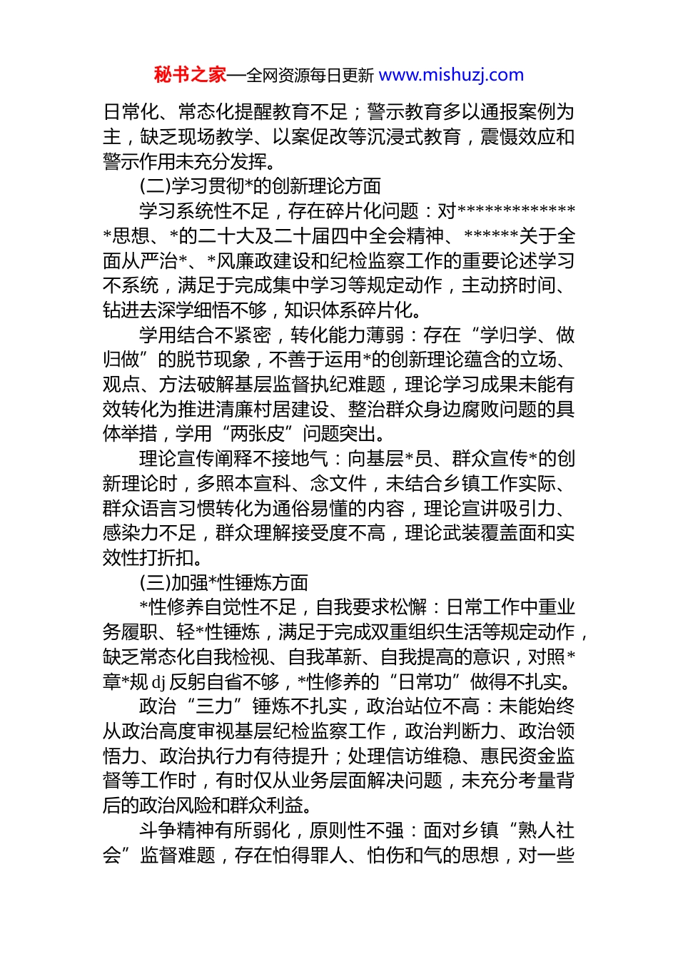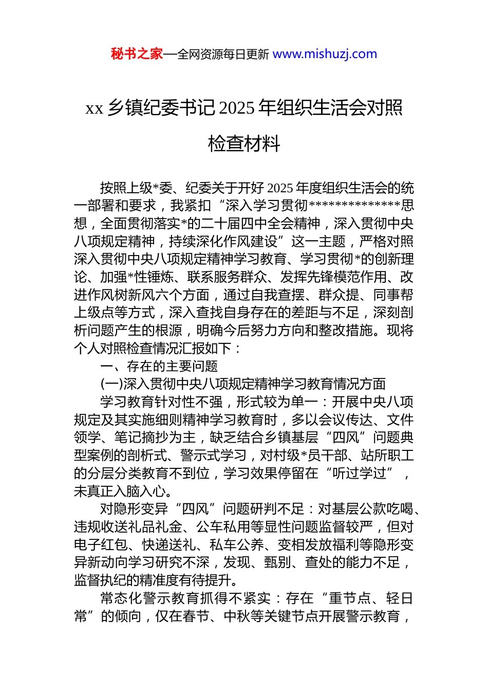 秘书之家—全网资源每日更新 www.mishuzj.comxx 乡镇纪委书记 2025 年组织生活会对照检查材料按照上级*委、纪委关于开好 2025 年度组织生活会的统一部署和要求,我紧扣“深入学习贯彻**************思想,全面贯彻落实*的二十届四中全会精神,深入贯彻中央八项规定精神,持续深化作风建设”这一主题,严格对照深入贯彻中央八项规定精神学习教育、学习贯彻*的创新理论、加强*性锤炼、联系服务群众、发挥先锋模范作用、改进作风树新风六个方面,通过自我查摆、群众提、同事帮上级点等方式,深入查找自身存在的差距与不足,深刻剖析问题产生的根源,明确今后努力方向和整改措施。现将个人对照检查情况汇报如下:一、存在的主要问题(一)深入贯彻中央八项规定精神学习教育情况方面学习教育针对性不强,形式较为单一:开展中央八项规定及其实施细则精神学习教育时,多以会议传达、文件领学、笔记摘抄为主,缺乏结合乡镇基层“四风”问题典型案例的剖析式、警示式学习,对村级*员干部、站所职工的分层分类教育不到位,学习效果停留在“听过学过”,未真正入脑入心。对隐形变异“四风”问题研判不足:对基层公款吃喝、违规收送礼品礼金、公车私用等显性问题监督较严,但对电子红包、快递送礼、私车公养、变相发放福利等隐形变异新动向学习研究不深,发现、甄别、查处的能力不足,监督执纪的精准度有待提升。常态化警示教育抓得不紧实:存在“重节点、轻日常”的倾向,仅在春节、中秋等关键节点开展警示教育,秘书之家—全网资源每日更新 www.mishuzj.com日常化、常态化提醒教育不足;警示教育多以通报案例为主,缺乏现场教学、以案促改等沉浸式教育,震慑效应和警示作用未充分发挥。(二)学习贯彻*的创新理论方面学习系统性不足,存在碎片化问题:对**************思想、*的二十大及二十届四中全会精神、******关于全面从严治*、*风廉政建设和纪检监察工作的重要论述学习不系统,满足于完成集中学习等规定动作,主动挤时间、钻进去深学细悟不够,知识体系碎片化。学用结合不紧密,转化能力薄弱:存在“学归学、做归做”的脱节现象,不善于运用*的创新理论蕴含的立场、观点、方法破解基层监督执纪难题,理论学习成果未能有效转化为推进清廉村居建设、整治群众身边腐败问题的具体举措,学用“两张皮”问题突出。理论宣传阐释不接地气:向基层*员、群众宣传*的创新理论时,多照本宣科、念文件,未结合乡镇工作实际、群众语言习惯转化为通俗易懂的内容,理论宣讲吸引力、感染力不足,群众理解接受度不高,理论武装覆盖面和实效性打折扣。(三)加强*性锤炼方面*性修养自觉性不足,自我要求松懈:日常工作中重业务履职、轻*性锤炼,满足于完成双重组织生活等规定动作,缺乏常态化自我检视、自我革新、自我提高的意识,对照*章*规 dj 反躬自省不够,*性修养的“日常功”做得不扎实。政治“三力”锤炼不扎实,政治站位不高:未能始终从政治高度审视基层纪检监察工作,政治判断力、政治领悟力、政治执行力有待提升;处理信访维稳、惠民资金监督等工作时,有时仅从业务层面解决问题,未充分考量背后的政治风险和群众利益。斗争精神有所弱化,原则性不强:面对乡镇“熟人社会”监督难题,存在怕得罪人、怕伤和气的思想,对一些秘书之家—全网资源每日更新 www.mishuzj.com非原则性问题“高高举起、轻轻放下”,批评与自我批评“辣味”不足,敢于较真碰硬、一查到底的斗争精神欠缺。(四)联系服务群众方面下基层走访调研不深入:存在“机关化”倾向,下村入户多是陪同检查、完成任务,主动沉到田间地头、群众家中倾听诉求不够,走访存在走马观花、蜻蜓点水的情况对群众急难愁盼问题掌握不全面、不精准。解决群众信访诉求效率不高:对群众反映的惠农补贴、村级财务、征地拆迁等信访问题,存在重受理、轻督办的现象,跟踪问效、闭环管理不到位,部分问题办理周期长反馈不及时,群众满意度有待提升。整治群众身边腐败力度不足:聚焦民生领域、乡村振兴项目、惠民资金等群众关心的重点领域监督不够深入,对村级“微权力”运行监督存在漏洞,对优亲厚友、吃拿卡要、虚报冒领等微腐败问题查处不及时,...