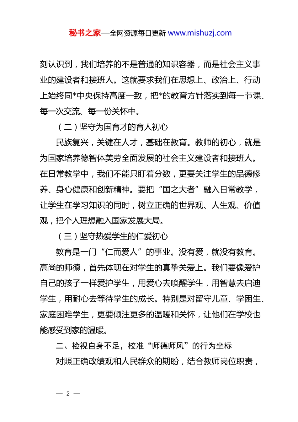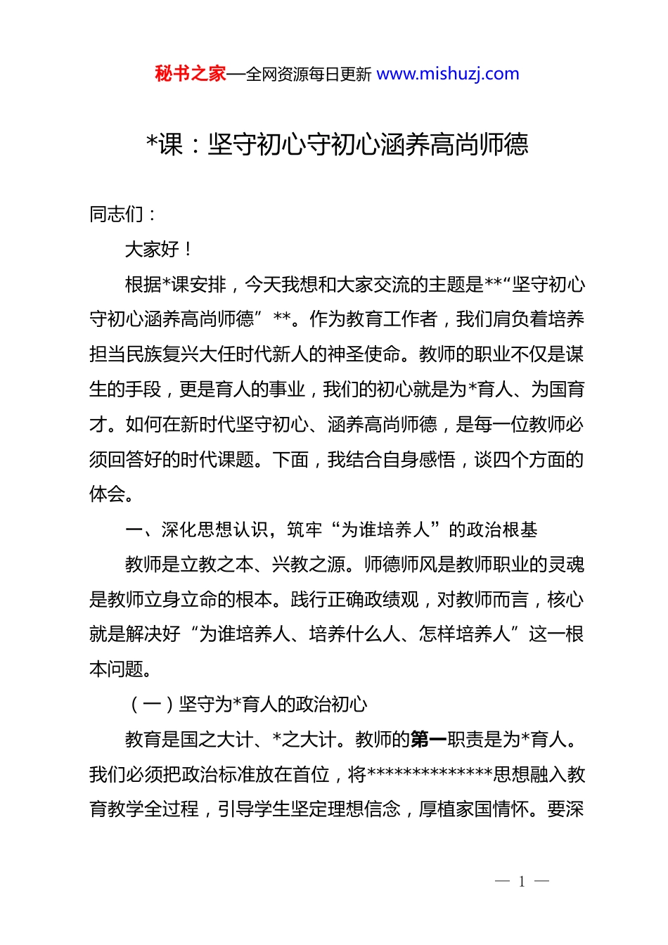 秘书之家—全网资源每日更新 www.mishuzj.com*课:坚守初心守初心涵养高尚师德同志们:大家好!根据*课安排,今天我想和大家交流的主题是**“坚守初心守初心涵养高尚师德”**。作为教育工作者,我们肩负着培养担当民族复兴大任时代新人的神圣使命。教师的职业不仅是谋生的手段,更是育人的事业,我们的初心就是为*育人、为国育才。如何在新时代坚守初心、涵养高尚师德,是每一位教师必须回答好的时代课题。下面,我结合自身感悟,谈四个方面的体会。一、深化思想认识,筑牢“为谁培养人”的政治根基教师是立教之本、兴教之源。师德师风是教师职业的灵魂是教师立身立命的根本。践行正确政绩观,对教师而言,核心就是解决好“为谁培养人、培养什么人、怎样培养人”这一根本问题。(一)坚守为*育人的政治初心教育是国之大计、*之大计。教师的第一职责是为*育人。我们必须把政治标准放在首位,将**************思想融入教育教学全过程,引导学生坚定理想信念,厚植家国情怀。要深— 1 —秘书之家—全网资源每日更新 www.mishuzj.com刻认识到,我们培养的不是普通的知识容器,而是社会主义事业的建设者和接班人。这就要求我们在思想上、政治上、行动上始终同*中央保持高度一致,把*的教育方针落实到每一节课、每一次交流、每一份关怀中。(二)坚守为国育才的育人初心民族复兴,关键在人才,基础在教育。教师的初心,就是为国家培养德智体美劳全面发展的社会主义建设者和接班人。在日常教学中,我们不能只盯着分数,更要关注学生的品德修养、身心健康和创新精神。要把“国之大者”融入日常教学,让学生在学习知识的同时,树立正确的世界观、人生观、价值观,把个人理想融入国家发展大局。(三)坚守热爱学生的仁爱初心教育是一门“仁而爱人”的事业。没有爱,就没有教育。高尚的师德,首先体现在对学生的真挚关爱上。我们要像爱护自己的孩子一样爱护学生,用爱心去唤醒学生,用智慧去启迪学生,用耐心去等待学生的成长。特别是对留守儿童、学困生、家庭困难学生,更要倾注更多的温暖和关怀,让他们在学校也能感受到家的温暖。二、检视自身不足,校准“师德师风”的行为坐标对照正确政绩观和人民群众的期盼,结合教师岗位职责,— 2 —秘书之家—全网资源每日更新 www.mishuzj.com我也清醒地看到自身在师德师风方面还存在一些需要改进的地方。(一)检视是否存在“重教书、轻育人”的倾向有时在工作中,过于关注教学成绩、分数排名,而对学生的思想动态、心理情绪关注不够。面对学生的错误或不足,有时缺乏耐心,批评教育方式简单粗暴,没有真正做到“润物细无声”,没有完全体现出“育人”的温度。(二)检视是否存在“重名利、轻奉献”的心态在职称评定、评优评先等利益面前,有时会产生患得患失的心理,缺乏“甘为人梯、乐于奉献”的教育家情怀。面对繁重的工作任务,偶尔会有抱怨情绪,缺乏“功成不必在我,功成必定有我”的境界。(三)检视是否存在“固步自封、缺乏创新”的状态面对教育改革的新形势、新课标、新要求,有时存在畏难情绪,习惯于按老经验办事,不愿主动学习新知识、掌握新技能,难以适应新时代教育发展的需求,在教学创新和课堂改革上进展不大。三、聚焦主责主业,探索“涵养师德”的实践路径树立和践行正确师德观,最终要落实到行动上,体现在教书育人的具体成效中。我将从以下三个方面努力,做一名新时— 3 —秘书之家—全网资源每日更新 www.mishuzj.com代的优秀教师。(一)在理论学习中强*性,做政治上的“明白人”理论上的清醒是政治坚定的前提。我将坚持把学习作为一种生活态度、一种工作责任,深入学习*的二十大精神和******关于教育的重要论述。坚持每周学习制度,利用“学习强国”、线上研修等平台,不断提升政治素养和理论水平。同时,把理论学习成果转化为教学动力,在课堂上讲好*的故事、革命的故事、英雄的故事,引导学生听*话、跟*走。(二)在履职尽责中强本领,做业务上的“带头人”教师的核心职责是教书育人。我将以“工匠精神”钻研业务,不断提升专业素养。一是备好每一节课。深入钻研教材教法,精心设计教学环节,运用多媒体、大数...