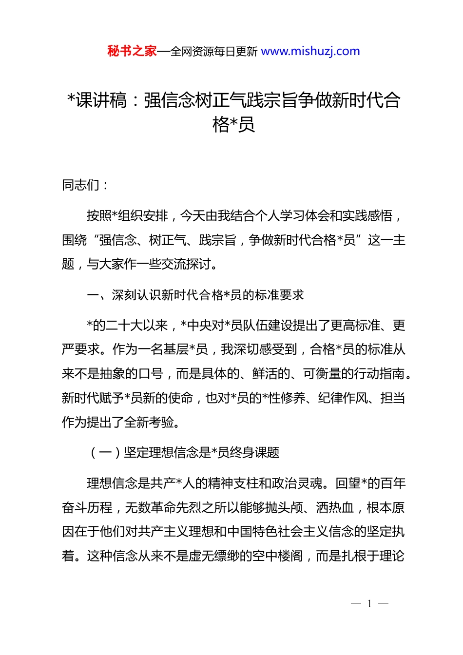 秘书之家—全网资源每日更新 www.mishuzj.com*课讲稿:强信念树正气践宗旨争做新时代合格*员同志们:按照*组织安排,今天由我结合个人学习体会和实践感悟,围绕“强信念、树正气、践宗旨,争做新时代合格*员”这一主题,与大家作一些交流探讨。一、深刻认识新时代合格*员的标准要求*的二十大以来,*中央对*员队伍建设提出了更高标准、更严要求。作为一名基层*员,我深切感受到,合格*员的标准从来不是抽象的口号,而是具体的、鲜活的、可衡量的行动指南。新时代赋予*员新的使命,也对*员的*性修养、纪律作风、担当作为提出了全新考验。(一)坚定理想信念是*员终身课题理想信念是共产*人的精神支柱和政治灵魂。回望*的百年奋斗历程,无数革命先烈之所以能够抛头颅、洒热血,根本原因在于他们对共产主义理想和中国特色社会主义信念的坚定执着。这种信念从来不是虚无缥缈的空中楼阁,而是扎根于理论— 1 —秘书之家—全网资源每日更新 www.mishuzj.com学习的深厚土壤、生长于实践锤炼的丰富养料之中。从个人成长经历来看,我深切体会到,理想信念的坚定需要持续不断的学习积累。学习**************思想,不能停留在读几本书、听几次报告的层面,必须真正入脑入心、触及灵魂。每当我系统研读*的创新理论,都会对*的初心使命有新的体悟,对*员的责任担当有新的认识。理论学习的过程,本质上是不断校准思想坐标、筑牢信仰根基的过程。理想信念的坚定还需要在实践中反复检验。工作中遇到的困难挫折、生活中经历的考验磨砺,都是检验理想信念坚定程度的试金石。记得刚入职时,面对繁重的工作任务和复杂的工作环境,我一度产生过畏难情绪。后来通过深入学习*的奋斗历史,认识到革命先辈在艰苦卓绝的环境中依然坚守信念、矢志不渝,我的思想受到了极大震撼。正是这种对照学习,让我逐渐学会在困难面前保持定力、在挫折面前坚定信心。(二)增强“四个意识”是基本政治要求政治意识、大局意识、核心意识、看齐意识,是*员必须具备的政治品质。这“四个意识”不是空洞的政治口号,而是具体的行动准则,渗透在日常工作和生活的方方面面。— 2 —秘书之家—全网资源每日更新 www.mishuzj.com增强政治意识,就要始终保持清醒的政治头脑和政治定力在大是大非面前旗帜鲜明,在风浪考验面前无所畏惧,在各种诱惑面前立场坚定。增强大局意识,就要自觉把本职工作放在*和国家事业发展全局中去思考、去谋划,正确处理局部与整体、当前与长远的关系。增强核心意识,就要坚决维护*中央权威和集中统一领导,自觉在思想上政治上行动上同*中央保持高度一致。增强看齐意识,就要经常主动向*中央看齐、向*的理论和路线方针政策看齐、向*中央决策部署看齐。我在工作中深刻体会到,“四个意识”的增强需要落实到具体行动中。每当重大决策部署出台,首先要学习领会精神实质,把握核心要义;每当工作中遇到矛盾问题,首先要从政治高度分析判断,把握正确方向。这种政治敏感性和政治判断力,需要在日常实践中不断培养锻炼。(三)严守纪律规矩是底线要求d 的纪律和规矩是*的各级组织和全体*员必须遵守的行为准则。政治纪律和政治规矩是最根本、最重要的纪律规矩,是维护*的团结统一、保持*的先进性和纯洁性的根本保证。严守纪律规矩,首先要对*章*规 dj 有全面系统的了解。*— 3 —秘书之家—全网资源每日更新 www.mishuzj.com章是*的根本大法,是全*必须遵循的总规矩。作为一名*员,必须把*章作为必读书、案头书,反复学习、深刻领会。各项*内法规,是对*章的具体化、细化,是规范*员行为的具体遵循。严守纪律规矩,核心在于做到心有所畏、言有所戒、行有所止。要时刻保持对纪律规矩的敬畏之心,把纪律规矩作为不可逾越的红线、不可触碰的底线。在日常生活中,要管好自己的言行,不该说的话不说、不该做的事不做。在工作交往中,要坚持原则、守住底线,不搞团团伙伙、不搞亲亲疏疏。严守纪律规矩,关键在于自觉接受监督。权力必须在阳光下运行,*员必须习惯在监督下工作生活。主动接受组织监督、群众监督、舆论监督,把监督作为对自己的爱护和保护。(四)践行根本宗旨是价值追求全心全意为人民服务是...