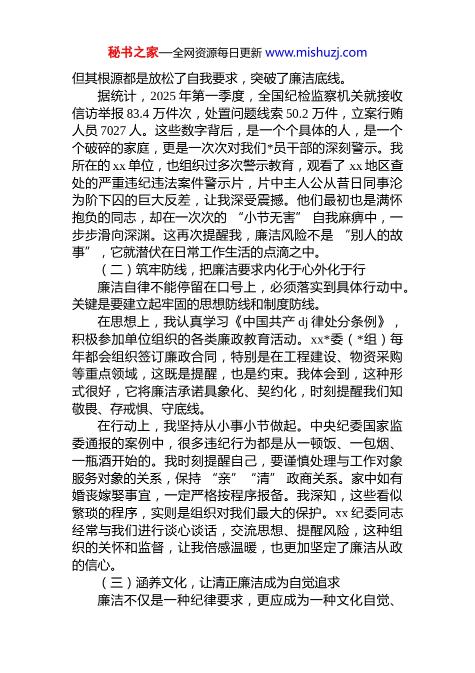 秘书之家—全网资源每日更新 www.mishuzj.com坚守初心担使命 严守纪律作表率 —— 关于廉洁自律、规矩纪律、奉献担当的*课讲稿同志们:今天我们齐聚一堂,围绕廉洁自律、规矩纪律、奉献担当三个主题进行学习交流。作为一名*员,我深感这三者相辅相成,共同构成了我们立身、立业、立言、立德的基石。下面,我结合近期学习的体会和思考,与大家作一汇报。一、坚守廉洁自律底线,永葆共产*人政治本色廉洁自律是*员干部的立身之本,更是我们*的光荣传统和独特优势。古往今来,多少历史人物因清正廉洁而流芳百世,也有因贪腐堕落而遗臭万年。对于我们共产*人来说,廉洁自律绝非个人的小事、私事,而是关系到*的肌体健康、关系到民心向背、关系到事业成败的大事、要事。我时常扪心自问:面对形形色色的诱惑,能否守住底线?答案只有一个,那就是必须守住,而且要一以贯之、持之以恒地守住。这既是对组织负责,也是对自己和家庭负责。(一)以案为鉴,深刻认识廉洁风险无时不在近年来,全面从严治*取得了历史性成就,但反腐败斗争形势依然严峻复杂。中央纪委国家监委持续公开通报违反中央八项规定精神的典型案例,这些案例就发生在我们身边,令人警醒。比如,有的干部在工程建设领域,利用项目审批、招投标等环节谋取私利;有的在国有企业,内外勾结、侵吞国有资产;有的在机关单位,公款吃喝、收受礼品礼金。这些行为,看似发生在特定领域、特定环节秘书之家—全网资源每日更新 www.mishuzj.com但其根源都是放松了自我要求,突破了廉洁底线。据统计,2025 年第一季度,全国纪检监察机关就接收信访举报 83.4 万件次,处置问题线索 50.2 万件,立案行贿人员 7027 人。这些数字背后,是一个个具体的人,是一个个破碎的家庭,更是一次次对我们*员干部的深刻警示。我所在的 xx 单位,也组织过多次警示教育,观看了 xx 地区查处的严重违纪违法案件警示片,片中主人公从昔日同事沦为阶下囚的巨大反差,让我深受震撼。他们最初也是满怀抱负的同志,却在一次次的 “小节无害” 自我麻痹中,一步步滑向深渊。这再次提醒我,廉洁风险不是 “别人的故事”,它就潜伏在日常工作生活的点滴之中。(二)筑牢防线,把廉洁要求内化于心外化于行廉洁自律不能停留在口号上,必须落实到具体行动中。关键是要建立起牢固的思想防线和制度防线。在思想上,我认真学习《中国共产 dj 律处分条例》,积极参加单位组织的各类廉政教育活动。xx*委(*组)每年都会组织签订廉政合同,特别是在工程建设、物资采购等重点领域,这既是提醒,也是约束。我体会到,这种形式很好,它将廉洁承诺具象化、契约化,时刻提醒我们知敬畏、存戒惧、守底线。在行动上,我坚持从小事小节做起。中央纪委国家监委通报的案例中,很多违纪行为都是从一顿饭、一包烟、一瓶酒开始的。我时刻提醒自己,要谨慎处理与工作对象服务对象的关系,保持 “亲”“清” 政商关系。家中如有婚丧嫁娶事宜,一定严格按程序报备。我深知,这些看似繁琐的程序,实则是组织对我们最大的保护。xx 纪委同志经常与我们进行谈心谈话,交流思想、提醒风险,这种组织的关怀和监督,让我倍感温暖,也更加坚定了廉洁从政的信心。(三)涵养文化,让清正廉洁成为自觉追求廉洁不仅是一种纪律要求,更应成为一种文化自觉、秘书之家—全网资源每日更新 www.mishuzj.com一种生活方式。新时代廉洁文化建设三年行动计划正在深入推进,我所在的 xx 社区也打造了廉政文化教育基地,组织*员干部分期分批参观学习。通过观看廉政文化展览、参与家风体验活动,我更加深刻地认识到,廉洁家风是抵御腐败的重要防线。很多案例表明,“一人不廉,全家不圆”,*员干部的家风,不是个人小事、家庭私事,而是作风的重要表现。我坚持与家人共同学习廉洁理念,传承中华民族传统美德,让家庭成为清正廉洁的港湾。在 xx 单位,我们积极营造风清气正的工作氛围,同事之间相互提醒、相互监督让廉洁成为共同的价值取向和行为准则。我相信,当廉洁成为每个人的自觉追求,我们就一定能筑牢拒腐防变的铜墙铁壁。二、严守规矩纪律,始终做到对*忠诚老实规矩纪律是*的生命...