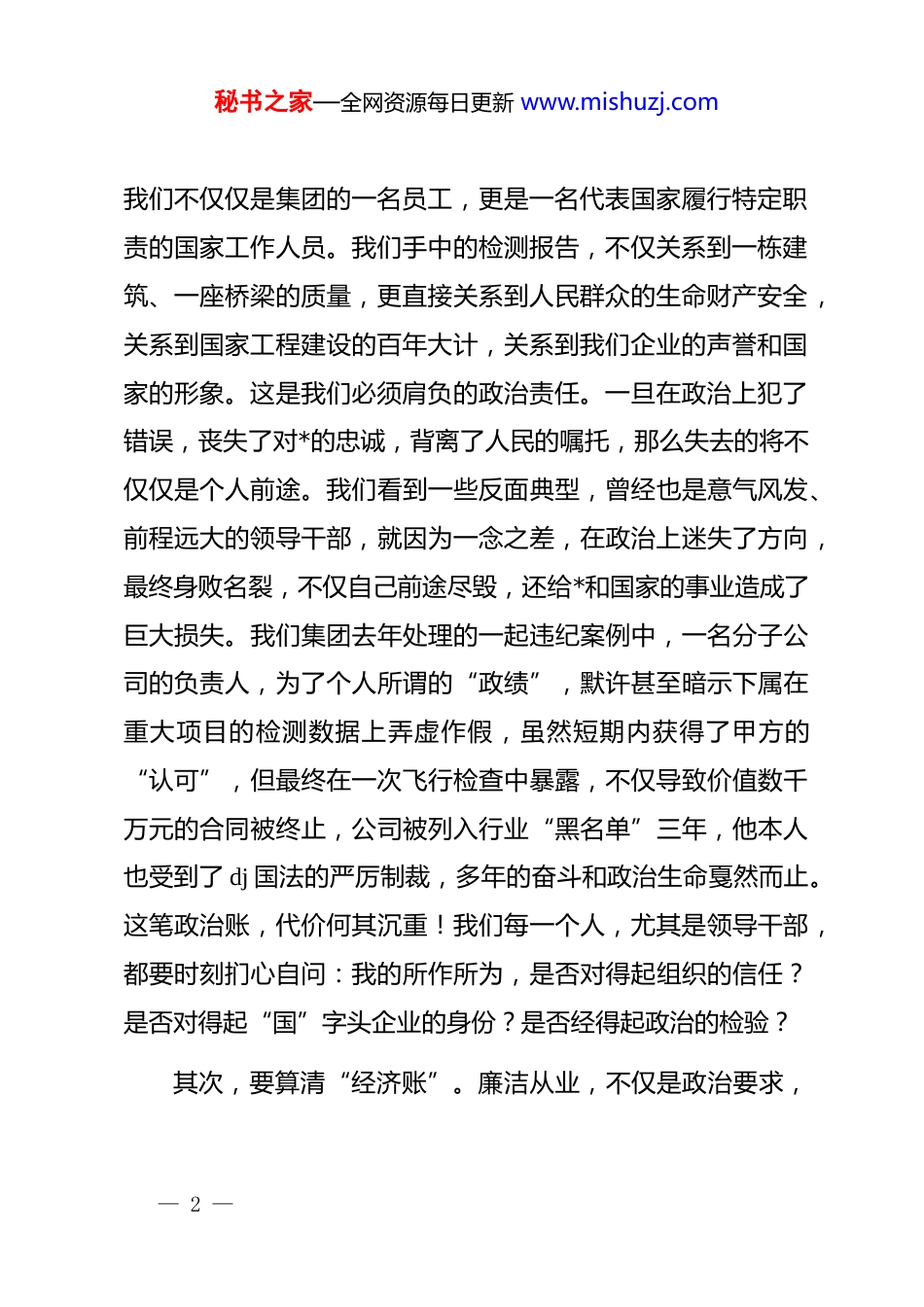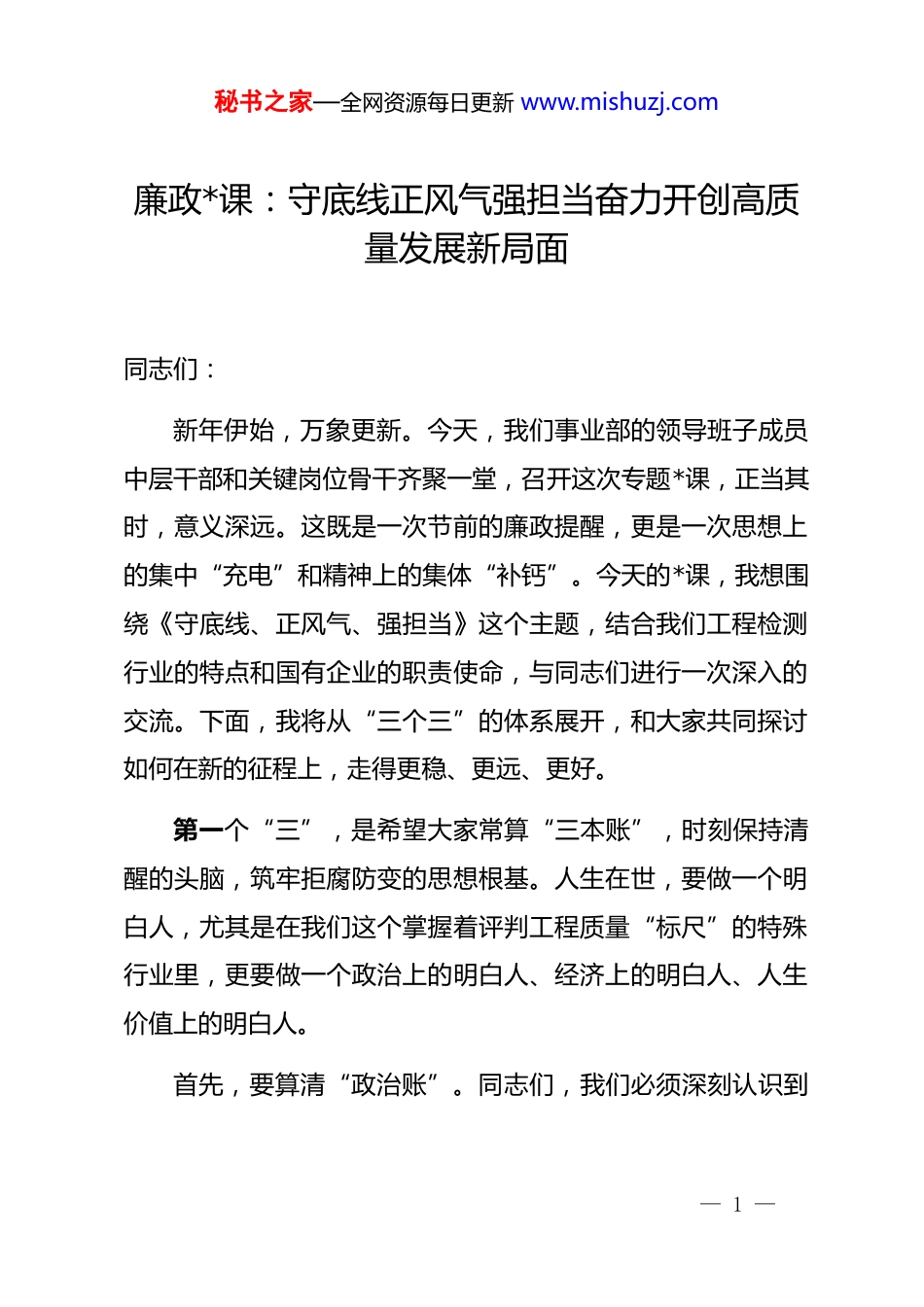 秘书之家—全网资源每日更新 www.mishuzj.com廉政*课:守底线正风气强担当奋力开创高质量发展新局面同志们:新年伊始,万象更新。今天,我们事业部的领导班子成员中层干部和关键岗位骨干齐聚一堂,召开这次专题*课,正当其时,意义深远。这既是一次节前的廉政提醒,更是一次思想上的集中“充电”和精神上的集体“补钙”。今天的*课,我想围绕《守底线、正风气、强担当》这个主题,结合我们工程检测行业的特点和国有企业的职责使命,与同志们进行一次深入的交流。下面,我将从“三个三”的体系展开,和大家共同探讨如何在新的征程上,走得更稳、更远、更好。第一个“三”,是希望大家常算“三本账”,时刻保持清醒的头脑,筑牢拒腐防变的思想根基。人生在世,要做一个明白人,尤其是在我们这个掌握着评判工程质量“标尺”的特殊行业里,更要做一个政治上的明白人、经济上的明白人、人生价值上的明白人。首先,要算清“政治账”。同志们,我们必须深刻认识到— 1 —秘书之家—全网资源每日更新 www.mishuzj.com我们不仅仅是集团的一名员工,更是一名代表国家履行特定职责的国家工作人员。我们手中的检测报告,不仅关系到一栋建筑、一座桥梁的质量,更直接关系到人民群众的生命财产安全,关系到国家工程建设的百年大计,关系到我们企业的声誉和国家的形象。这是我们必须肩负的政治责任。一旦在政治上犯了错误,丧失了对*的忠诚,背离了人民的嘱托,那么失去的将不仅仅是个人前途。我们看到一些反面典型,曾经也是意气风发、前程远大的领导干部,就因为一念之差,在政治上迷失了方向,最终身败名裂,不仅自己前途尽毁,还给*和国家的事业造成了巨大损失。我们集团去年处理的一起违纪案例中,一名分子公司的负责人,为了个人所谓的“政绩”,默许甚至暗示下属在重大项目的检测数据上弄虚作假,虽然短期内获得了甲方的“认可”,但最终在一次飞行检查中暴露,不仅导致价值数千万元的合同被终止,公司被列入行业“黑名单”三年,他本人也受到了 dj 国法的严厉制裁,多年的奋斗和政治生命戛然而止。这笔政治账,代价何其沉重!我们每一个人,尤其是领导干部,都要时刻扪心自问:我的所作所为,是否对得起组织的信任?是否对得起“国”字头企业的身份?是否经得起政治的检验?其次,要算清“经济账”。廉洁从业,不仅是政治要求,— 2 —秘书之家—全网资源每日更新 www.mishuzj.com也是最直接、最现实的经济考量。一笔不义之财,可能会带来一生的经济枷锁。我们不妨算一算,一个干部成长起来,国家和企业投入了多少培养成本?我们个人通过辛勤工作获得的稳定收入、福利待遇、养老保障,这些加起来是一笔巨大的财富。而那些企图通过权力寻租、利益输送换来的“快钱”,背后隐藏的风险和成本是无法估量的。根据最新的司法解释,一些关键领域的商业贿赂,起刑点已经大幅降低,量刑标准则显著提高。去年,在建筑领域,全国因质量检测数据造假等问题开出的罚单总额高达 28.7 亿元,其中涉及我们同行业的企业就有上百家。试想,为了一点蝇头小利,收受几万、几十万的贿赂,一旦东窗事发,不仅所有非法所得要被悉数追缴,个人还将面临高额的罚金,甚至被判处没收全部个人财产。更重要的是,工作丢了,养老金没了,家庭生活水平一落千丈,甚至会拖累子女的前途。我们集团一位曾经的业务骨干,就是因为在一个项目中收受了施工方价值不过十余万元的“好处费”,为其出具了不合格的检测报告。最终,该项目出现严重质量问题,倒查追责,他不仅被开除公职,判处有期徒刑三年,还被处以 50万元的罚金。他原本安逸富足的家庭,瞬间陷入了困境。这笔经济账,交易的另一端是万丈深渊,谁都输不起。— 3 —秘书之家—全网资源每日更新 www.mishuzj.com最后,也是最重要的一点,要算清“人生账”。人生最宝贵的是什么?是自由、是亲情、是名誉、是内心的安宁。这些,是再多金钱也换不来的。那些落马的腐败分子,在忏悔录中说得最多的一句话就是:“我想回家,我想念和家人在一起的平凡日子。”高墙之内,方知自由可贵;众叛亲离,才懂亲情无价;声名扫地,方晓清白之重。我们作为工程技术人员,...