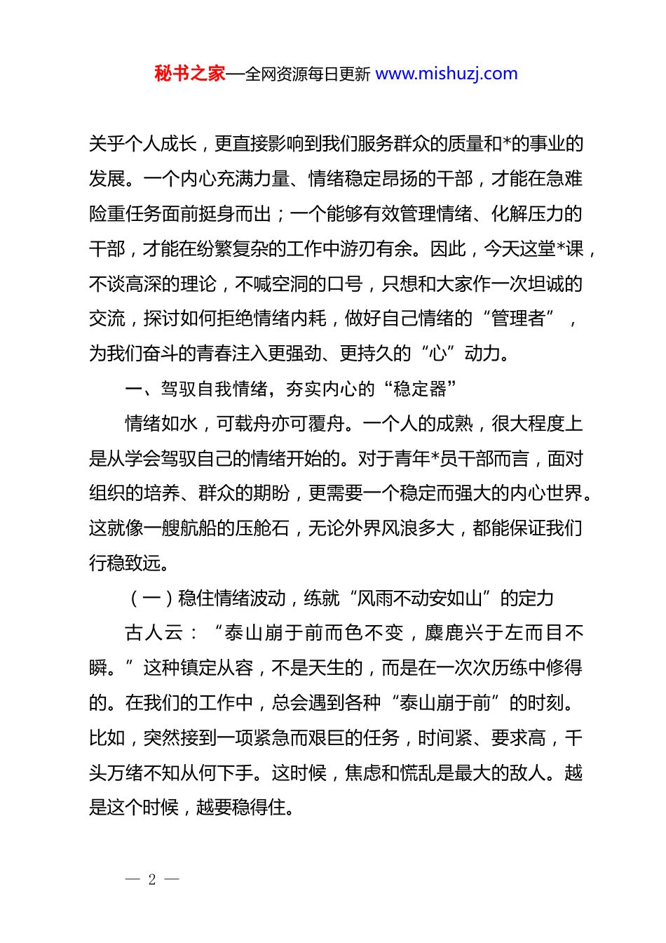 秘书之家—全网资源每日更新 www.mishuzj.com青年*员干部情绪管理专题*课讲稿各位青年同志们:大家好!今天,很高兴能和我们单位最富有朝气、最具活力的青年*员同志们相聚一堂。在准备这次*课的时候,我一直在思考一个问题:在 2026 年这个充满机遇与挑战的时代,我们青年*员干部面临的最普遍、最深刻的困扰是什么?是繁重的工作任务,是复杂的人际关系,还是对未来的迷茫?我想,这些都对,但它们背后可能都指向一个共同的词——“情绪内耗”。它像一个看不见的“精神跑步机”,让我们身心俱疲、原地踏步。或许你也有过这样的体验:为一件还没发生的事情反复忧虑、辗转难眠;因为别人不经意的一句话,在心里上演无数遍“内心戏”;明明计划满满,却迟迟无法开始行动,把大量的精力消耗在犹豫和自我怀疑中。这并非个例。近两年的社会心理健康报告显示,青年群体中感到“情绪内耗”的比例不容小觑,甚至有研究指出,高达 89%的职业发展瓶颈与“情绪内耗”直接相关。这说明,情绪问题已经成为我们成长道路上一道绕不开的坎。作为肩负着时代重任的青年*员干部,我们的内心状态不仅— 1 —秘书之家—全网资源每日更新 www.mishuzj.com关乎个人成长,更直接影响到我们服务群众的质量和*的事业的发展。一个内心充满力量、情绪稳定昂扬的干部,才能在急难险重任务面前挺身而出;一个能够有效管理情绪、化解压力的干部,才能在纷繁复杂的工作中游刃有余。因此,今天这堂*课,不谈高深的理论,不喊空洞的口号,只想和大家作一次坦诚的交流,探讨如何拒绝情绪内耗,做好自己情绪的“管理者”,为我们奋斗的青春注入更强劲、更持久的“心”动力。一、驾驭自我情绪,夯实内心的“稳定器”情绪如水,可载舟亦可覆舟。一个人的成熟,很大程度上是从学会驾驭自己的情绪开始的。对于青年*员干部而言,面对组织的培养、群众的期盼,更需要一个稳定而强大的内心世界。这就像一艘航船的压舱石,无论外界风浪多大,都能保证我们行稳致远。(一)稳住情绪波动,练就“风雨不动安如山”的定力古人云:“泰山崩于前而色不变,麋鹿兴于左而目不瞬。”这种镇定从容,不是天生的,而是在一次次历练中修得的。在我们的工作中,总会遇到各种“泰山崩于前”的时刻。比如,突然接到一项紧急而艰巨的任务,时间紧、要求高,千头万绪不知从何下手。这时候,焦虑和慌乱是最大的敌人。越是这个时候,越要稳得住。— 2 —秘书之家—全网资源每日更新 www.mishuzj.com思想上稳得住:用*的创新理论武装头脑,从**************思想中寻找破解难题的“金钥匙”。心态上稳得住:深刻认识到挑战的长期性和复杂性,做好打持久战的准备。行动上稳得住:学会科学地分解任务,把一个看似不可能完成的“大目标”,拆解成一个个可以实现、可以掌控的“小步骤”,逐一攻克。记得去年我们 xx 部门负责的一个重点项目,初期遇到了前所未有的技术瓶颈,团队里一些年轻同志压力巨大,甚至有人开始怀疑项目能否成功。当时的项目负责人,一位经验丰富的老*员,没有急于指责,而是组织大家静下心来,把整个流程图铺在桌上,一点点地梳理,将最难的环节细分为十几个更小的节点,分配给不同的小组去研究。正是这种冷静和稳健,让大家从慌乱中找到了焦点,最终成功突破了难关。这种在关键时刻稳住阵脚的能力,就是我们必须修炼的内功。(二)听进逆耳之言,涵养“从善如流纳百川”的胸襟“三人行,必有我师焉。”青年干部有激情、有想法,但也容易有“少年意气”,听不进不同意见。然而,真正的智慧,恰恰蕴藏在那些不同的声音里。多听群众的“牢骚话”:要大兴调查研究之风,走出办公— 3 —秘书之家—全网资源每日更新 www.mishuzj.com室,走进田间地头、企业车间,坐到群众的炕头、板凳上,真心实意地听他们讲讲烦心事、说说心里话。群众的“牢骚”里,往往藏着我们工作的短板和改进的方向。多听同事的“真心话”:在一个团队里,意见碰撞是常态也是好事。要以实事求是的态度对待同事的不同看法,多交流、多碰撞,在思想的火花中找到最优解,确保决策的科学性。多听下属的“实在话”:要主动与一线的同志们沟通,他们离实际...
