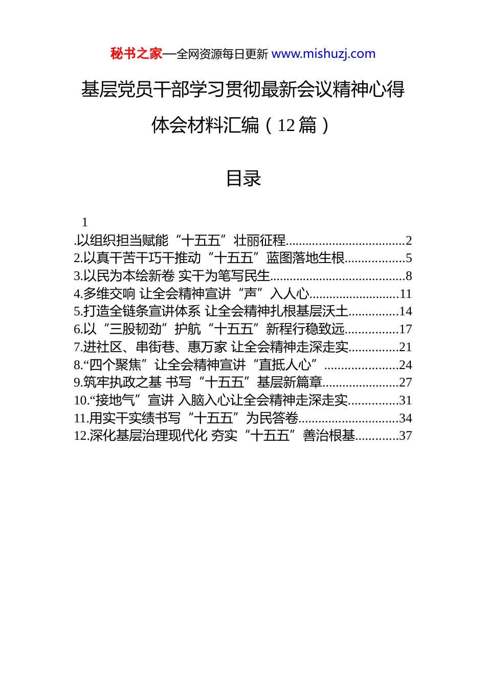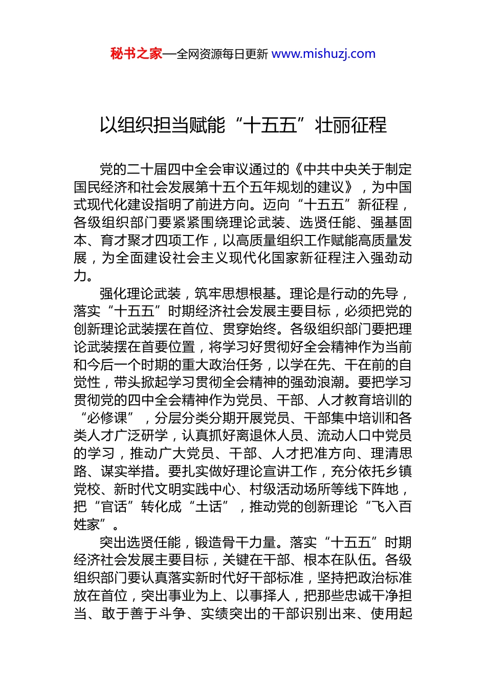 秘书之家—全网资源每日更新 www.mishuzj.com基层党员干部学习贯彻最新会议精神心得体会材料汇编(12 篇)目录1.以组织担当赋能“十五五”壮丽征程....................................22.以真干苦干巧干推动“十五五”蓝图落地生根..................53.以民为本绘新卷 实干为笔写民生.........................................84.多维交响 让全会精神宣讲“声”入人心...........................115.打造全链条宣讲体系 让全会精神扎根基层沃土...............146.以“三股韧劲”护航“十五五”新程行稳致远................177.进社区、串街巷、惠万家 让全会精神走深走实...............218.“四个聚焦”让全会精神宣讲“直抵人心”......................249.筑牢执政之基 书写“十五五”基层新篇章.......................2710.“接地气”宣讲 入脑入心让全会精神走深走实...............3111.用实干实绩书写“十五五”为民答卷..............................3412.深化基层治理现代化 夯实“十五五”善治根基.............37秘书之家—全网资源每日更新 www.mishuzj.com以组织担当赋能“十五五”壮丽征程党的二十届四中全会审议通过的《中共中央关于制定国民经济和社会发展第十五个五年规划的建议》,为中国式现代化建设指明了前进方向。迈向“十五五”新征程,各级组织部门要紧紧围绕理论武装、选贤任能、强基固本、育才聚才四项工作,以高质量组织工作赋能高质量发展,为全面建设社会主义现代化国家新征程注入强劲动力。强化理论武装,筑牢思想根基。理论是行动的先导,落实“十五五”时期经济社会发展主要目标,必须把党的创新理论武装摆在首位、贯穿始终。各级组织部门要把理论武装摆在首要位置,将学习好贯彻好全会精神作为当前和今后一个时期的重大政治任务,以学在先、干在前的自觉性,带头掀起学习贯彻全会精神的强劲浪潮。要把学习贯彻党的四中全会精神作为党员、干部、人才教育培训的“必修课”,分层分类分期开展党员、干部集中培训和各类人才广泛研学,认真抓好离退休人员、流动人口中党员的学习,推动广大党员、干部、人才把准方向、理清思路、谋实举措。要扎实做好理论宣讲工作,充分依托乡镇党校、新时代文明实践中心、村级活动场所等线下阵地,把“官话”转化成“土话”,推动党的创新理论“飞入百姓家”。突出选贤任能,锻造骨干力量。落实“十五五”时期经济社会发展主要目标,关键在干部、根本在队伍。各级组织部门要认真落实新时代好干部标准,坚持把政治标准放在首位,突出事业为上、以事择人,把那些忠诚干净担当、敢于善于斗争、实绩突出的干部识别出来、使用起秘书之家—全网资源每日更新 www.mishuzj.com来,尤其是在“十五五”的关键领域和攻坚一线考察识别干部。要进一步健全完善干部考核评价机制,强化干部教育培训和实践锻炼,提高队伍现代化建设本领,坚持严管厚爱结合、确保把人考准察实。要严格执行领导干部能上能下规定,畅通“下”的渠道,完善“出”的机制,推动形成能者上、优者奖、庸者下、劣者汰的良性循环。坚持强基固本,夯实基层基础。基层党组织是落实“十五五”时期经济社会发展主要目标的坚强战斗堡垒。各级组织部门要以增强党组织政治功能和组织功能为核心,系统化推进基层党组织标准化、规范化建设,持续深化新兴领域“两个覆盖”工作,确保党的组织体系经脉畅通、活力充沛。要认真抓好村(社区)“两委”换届工作,选优配强政治坚定、作风优良、群众公认的基层党组织带头人队伍,不断增强基层党组织的凝聚力、战斗力和创造力。要健全基层治理责任落实机制,推动基层党组织与各类治理力量深度融合,持续减负赋能解决“小马拉大车”难题,将组织优势转化为治理效能。要充分发挥党员先锋模范作用,让党员在科技创新、乡村振兴、民生服务等岗位上亮身份、作表率,筑牢推动发展的“战斗堡垒”。聚焦育才聚才,凝聚创新动能。人才是落实“十五五”时期经济社会发展主要目标的重要因素和关键变量。各级组织部门要把人才工作摆在战略位置,重点围绕“十五五”规划的重大战略、重大工程、重大项目,建立“产业需求+人...