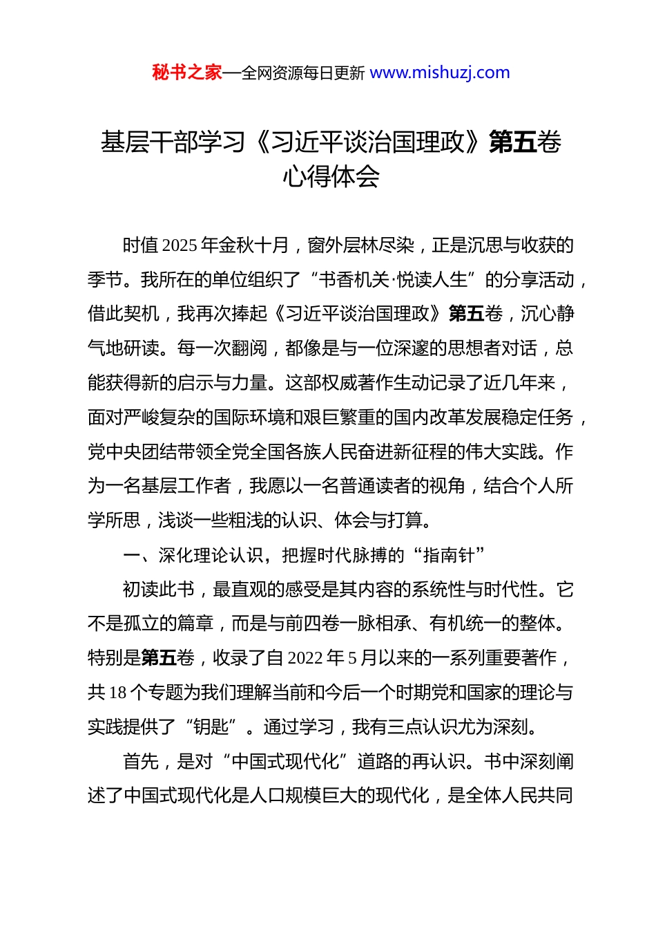 秘书之家—全网资源每日更新 www.mishuzj.com基层干部学习《习近平谈治国理政》第五卷心得体会 时值 2025 年金秋十月,窗外层林尽染,正是沉思与收获的季节。我所在的单位组织了“书香机关·悦读人生”的分享活动,借此契机,我再次捧起《习近平谈治国理政》第五卷,沉心静气地研读。每一次翻阅,都像是与一位深邃的思想者对话,总能获得新的启示与力量。这部权威著作生动记录了近几年来,面对严峻复杂的国际环境和艰巨繁重的国内改革发展稳定任务,党中央团结带领全党全国各族人民奋进新征程的伟大实践。作为一名基层工作者,我愿以一名普通读者的视角,结合个人所学所思,浅谈一些粗浅的认识、体会与打算。一、深化理论认识,把握时代脉搏的“指南针”初读此书,最直观的感受是其内容的系统性与时代性。它不是孤立的篇章,而是与前四卷一脉相承、有机统一的整体。特别是第五卷,收录了自 2022 年 5 月以来的一系列重要著作,共 18 个专题为我们理解当前和今后一个时期党和国家的理论与实践提供了“钥匙”。通过学习,我有三点认识尤为深刻。首先,是对“中国式现代化”道路的再认识。书中深刻阐述了中国式现代化是人口规模巨大的现代化,是全体人民共同秘书之家—全网资源每日更新 www.mishuzj.com富裕的现代化,是物质文明和精神文明相协调的现代化,是人与自然和谐共生的现代化,是走和平发展道路的现代化。这超越了西方以资本为中心的传统现代化模式,为人类对更好社会制度的探索提供了中国方案。书中“中国式现代化,民生为大”的论断让我深刻理解到,这条道路的出发点和落脚点始终是人民。它不是冰冷的理论构建,而是与每个人的生活息息相关的温暖实践。其次,是对“以人民为中心”发展思想的再认识。这一思想如一条红线,贯穿全书始终。从“人民对美好生活的向往就是我们的奋斗目标”的庄严承诺,到具体政策的落地实施,无不彰显着深厚的为民情怀。这让我认识到,治国理政的根本逻辑,就是让人民过上好日子。这并非一句口号,而是体现在一系列扎实的民生保障举措中。国家财政支出持续向民生领域倾斜构建起世界上规模最大的社会保障体系在教育、医疗、住房等领域持续发力。近一亿农村贫困人口实现脱贫的历史性成就更是这一思想的伟大实践。这些事实让我明白,无论身处何种岗位,都必须将人民的利益放在最高位置,用心用情去解决群众关心的实际问题。最后,是对“高质量发展”与“文化自信”的再认识。高质量发展是全面建设社会主义现代化国家的首要任务。书中关秘书之家—全网资源每日更新 www.mishuzj.com于贯彻新发展理念、构建新发展格局、推动高质量发展的论述,特别是创造性地提出新质生产力等概念,为经济社会发展指明了方向。这意味着发展的核心逻辑已从追求速度和规模,转向更加注重质量和效益的提升。与此同时,书中强调在新的起点上继续推动文化繁荣、建设文化强国、建设中华民族现代文明的新时代文化使命,让我深刻感悟到文化是一个国家、一个民族的灵魂。坚定文化自信,不仅是传承历史,更是开创未来的精神动力。二、结合身边体会,感受思想伟力的“温度”理论的光辉,最终要照进现实。学习《习近平谈治国理政》第五卷,我不仅在思想上受到洗礼,更在情感上产生了强烈的共鸣。因为书中所擘画的宏伟蓝图,正以肉眼可见的速度,悄然改变着我们身边的世界,让我真切地感受到了思想的“温度”。我体会到的是民生改善的“获得感”。书中的民生篇章,并非遥不可及的宏大叙事,而是与我及家人、朋友生活紧密相连的日常。这些具体而微的变化,让我深刻体会到,“民生为大”不是一句空话,而是实实在在的幸福感、安全感。我体会到的是高质量发展的“新动能”。现在,通过学习我更关注发展的“含金量”。“十四五”规划中淡化了 GDP 增秘书之家—全网资源每日更新 www.mishuzj.com长的具体量化指标,转而强调“保持在合理区间”这本身就是一种发展理念的深刻变革。这让我真切地感受到,创新正成为驱动发展的第一动力,经济的肌体正变得更加健康、更具韧性。我体会到的是文化传承的“生命力”。书中关于文化建设的论述,让我对身边的文化现象有了新的审视。...