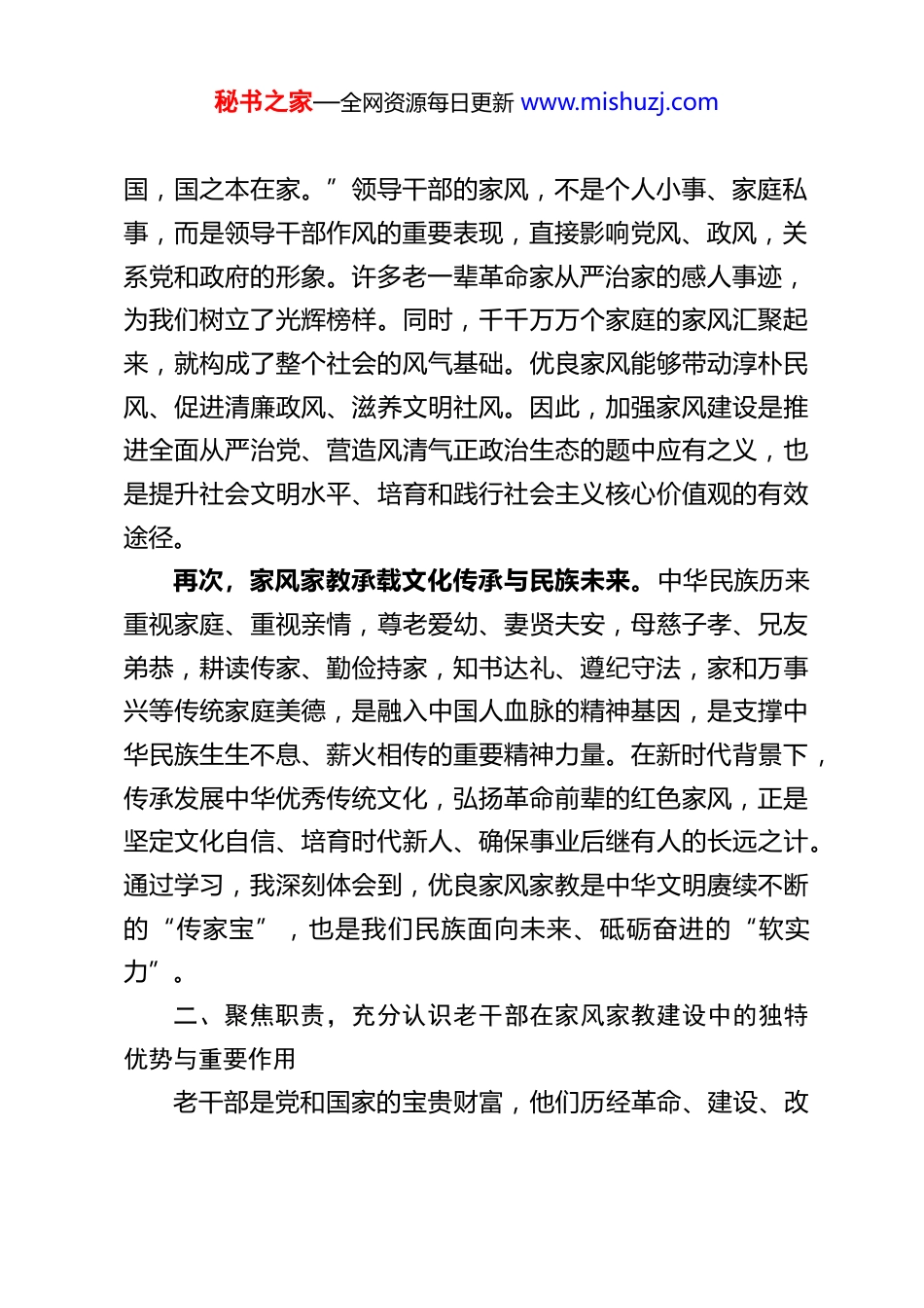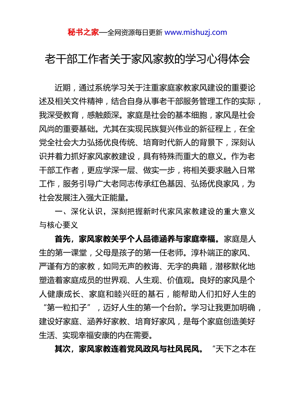 秘书之家—全网资源每日更新 www.mishuzj.com老干部工作者关于家风家教的学习心得体会近期,通过系统学习关于注重家庭家教家风建设的重要论述及相关文件精神,结合自身从事老干部服务管理工作的实际,我深受教育,感触颇深。家庭是社会的基本细胞,家风是社会风尚的重要基础。尤其在实现民族复兴伟业的新征程上,在全党全社会大力弘扬优良传统、培育时代新人的背景下,深刻认识并着力抓好家风家教建设,具有特殊而重大的意义。作为老干部工作者,更应学深一层、做实一步,将相关要求融入日常工作,服务引导广大老同志传承红色基因、弘扬优良家风,为社会发展注入强大正能量。一、深化认识,深刻把握新时代家风家教建设的重大意义与核心要义首先,家风家教关乎个人品德涵养与家庭幸福。家庭是人生的第一课堂,父母是孩子的第一任老师。淳朴端正的家风、严谨有方的家教,如同无声的教诲、无字的典籍,潜移默化地塑造着家庭成员的世界观、人生观、价值观。良好的家风是个人健康成长、家庭和睦兴旺的基石,能帮助人们扣好人生的“第一粒扣子”,迈好人生的第一个台阶。学习让我更加明确,建设好家庭、涵养好家教、培育好家风,是每个家庭创造美好生活、实现幸福安康的内在需要。其次,家风家教连着党风政风与社风民风。“天下之本在秘书之家—全网资源每日更新 www.mishuzj.com国,国之本在家。”领导干部的家风,不是个人小事、家庭私事,而是领导干部作风的重要表现,直接影响党风、政风,关系党和政府的形象。许多老一辈革命家从严治家的感人事迹,为我们树立了光辉榜样。同时,千千万万个家庭的家风汇聚起来,就构成了整个社会的风气基础。优良家风能够带动淳朴民风、促进清廉政风、滋养文明社风。因此,加强家风建设是推进全面从严治党、营造风清气正政治生态的题中应有之义,也是提升社会文明水平、培育和践行社会主义核心价值观的有效途径。再次,家风家教承载文化传承与民族未来。中华民族历来重视家庭、重视亲情,尊老爱幼、妻贤夫安,母慈子孝、兄友弟恭,耕读传家、勤俭持家,知书达礼、遵纪守法,家和万事兴等传统家庭美德,是融入中国人血脉的精神基因,是支撑中华民族生生不息、薪火相传的重要精神力量。在新时代背景下,传承发展中华优秀传统文化,弘扬革命前辈的红色家风,正是坚定文化自信、培育时代新人、确保事业后继有人的长远之计。通过学习,我深刻体会到,优良家风家教是中华文明赓续不断的“传家宝”,也是我们民族面向未来、砥砺奋进的“软实力”。二、聚焦职责,充分认识老干部在家风家教建设中的独特优势与重要作用老干部是党和国家的宝贵财富,他们历经革命、建设、改秘书之家—全网资源每日更新 www.mishuzj.com革的长期考验,具有丰富的政治智慧、工作经验、人生阅历和崇高的精神风范。在家庭家教家风建设中,他们具有不可替代的独特优势。一是政治优势与信仰坚定。广大老干部对党怀有深厚感情,对党的事业无限忠诚,政治立场坚定,大局意识强。他们的言传身教,是引导子孙后代坚定理想信念、爱党爱国爱社会主义的最生动教材。将红色基因融入家风传承,是老同志们的政治责任,也是其独特魅力所在。二是经验优势与智慧丰厚。老同志们在长期工作中积累了治家、育人、处世、干事的丰富经验,其中蕴含的勤俭节约、艰苦奋斗、诚信友善、敬业奉献等宝贵品质,是家风建设的核心内容。他们的“传家训”“立家规”,往往朴实无华却切中要害,对于女后代的成长成才具有重要的指导意义。三是威望优势与示范性强。老干部在家庭和社会中普遍享有较高威望,他们的言行举止对家庭成员、邻里社区具有天然的感染力和号召力。一个老同志带头树立良好家风,不仅能福泽自家,还能辐射周边,带动更多家庭见贤思齐,起到“家风正,则民风淳”的示范效应。四是时空优势与陪伴引导。许多老同志退出工作岗位后,有更多时间与孙辈相处,在隔代教育中发挥着重要作用。他们可以将优良传统、革命故事、做人道理,通过日常陪伴、点滴浸润的方式传递给下一代,这种“润物细无声”的教导,效果秘书之家—全网资源每日更新 www.mishuzj.com往往更为持久深刻。作为老干部工作者,我们必...