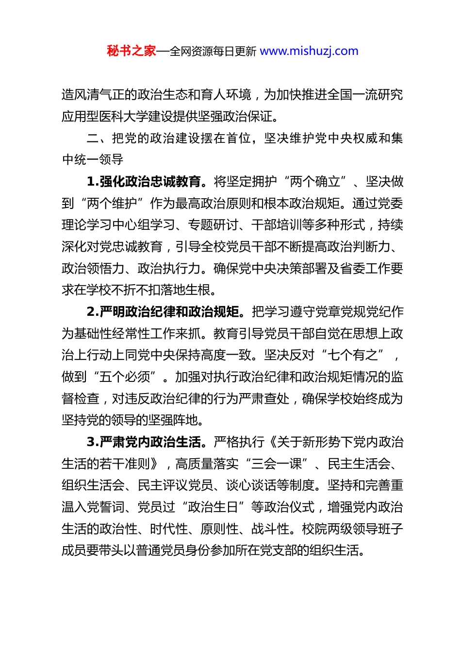 秘书之家—全网资源每日更新 www.mishuzj.comXX 大学 2026 年全面从严治党工作要点2026 年是“十五五”规划的开局之年,也是我校实现“双一流”攻坚突破、全面建成区域领先研究应用型医科大学的关键之年。深入推进全面从严治党,对于确保学校始终成为坚持党的领导的坚强阵地、落实立德树人根本任务、保障各项事业高质量发展具有极端重要性。为深入贯彻落实党的二十大及二十届历次全会精神,全面落实习近平总书记在二十届中央纪委五次全会上的重要讲话和对山西工作的重要讲话重要指示精神,根据中央及省委关于全面从严治党的新部署新要求,结合学校实际,现制定 XX 大学 2026 年全面从严治党工作要点如下:一、总体要求坚持以习近平新时代中国特色社会主义思想为指导,全面贯彻落实党的二十大和二十届二中、三中、四中全会精神,深入学习贯彻习近平总书记关于党的自我革命的重要思想,深刻领悟“两个确立”的决定性意义,增强“四个意识”、坚定“四个自信”、做到“两个维护”。坚持稳中求进工作总基调,巩固拓展主题教育和教育整顿成果,紧紧围绕学校“十五五”开局和“双一流”攻坚目标,以“三个更加”重要要求为根本遵循,坚持严的基调、严的措施、严的氛围不动摇,健全全面从严治党体系,纵深推进党风廉政建设和反腐败斗争,持续营秘书之家—全网资源每日更新 www.mishuzj.com造风清气正的政治生态和育人环境,为加快推进全国一流研究应用型医科大学建设提供坚强政治保证。二、把党的政治建设摆在首位,坚决维护党中央权威和集中统一领导1.强化政治忠诚教育。将坚定拥护“两个确立”、坚决做到“两个维护”作为最高政治原则和根本政治规矩。通过党委理论学习中心组学习、专题研讨、干部培训等多种形式,持续深化对党忠诚教育,引导全校党员干部不断提高政治判断力、政治领悟力、政治执行力。确保党中央决策部署及省委工作要求在学校不折不扣落地生根。2.严明政治纪律和政治规矩。把学习遵守党章党规党纪作为基础性经常性工作来抓。教育引导党员干部自觉在思想上政治上行动上同党中央保持高度一致。坚决反对“七个有之”,做到“五个必须”。加强对执行政治纪律和政治规矩情况的监督检查,对违反政治纪律的行为严肃查处,确保学校始终成为坚持党的领导的坚强阵地。3.严肃党内政治生活。严格执行《关于新形势下党内政治生活的若干准则》,高质量落实“三会一课”、民主生活会、组织生活会、民主评议党员、谈心谈话等制度。坚持和完善重温入党誓词、党员过“政治生日”等政治仪式,增强党内政治生活的政治性、时代性、原则性、战斗性。校院两级领导班子成员要带头以普通党员身份参加所在党支部的组织生活。秘书之家—全网资源每日更新 www.mishuzj.com4.压实管党治党政治责任。坚持和完善党委领导下的校长负责制,严格落实《党委(党组)落实全面从严治党主体责任规定》。校党委切实履行主体责任,党委书记履行第一责任人责任,班子成员落实“一岗双责”。各级党组织要担负起主体责任,党组织书记要知责于心、担责于身、履责于行。分层级签订《全面从严治党党风廉政建设责任书》,构建起横向到边、纵向到底的责任落实体系。三、深化党的创新理论武装,筑牢信仰之基5.持续强化理论学习。坚持把学习习近平新时代中国特色社会主义思想作为首要政治任务,严格执行“第一议题”制度。深入学习贯彻习近平总书记关于教育、科技、人才的重要论述,特别是在二十届中央纪委五次全会上的重要讲话精神,深刻理解“三个更加”的丰富内涵和实践要求。制定并实施年度理论学习计划,通过专家辅导、集中研讨、个人自学相结合的方式,推动理论学习往深里走、往实里走、往心里走。6.巩固拓展主题教育成果。建立健全常态化长效化学习机制,把主题教育中形成的好经验好做法固化下来。持续做好党的创新理论的深化、内化、转化工作,引导党员干部从党的科学理论中悟规律、明方向、学方法、增智慧,切实把学习成果转化为坚定理想、锤炼党性和指导实践、推动工作的强大力量。7.加强意识形态阵地建设与管理。严格落实意识形态工作责任制,牢牢掌握意识形态工作的领导权、管理权、话语权。秘书之...