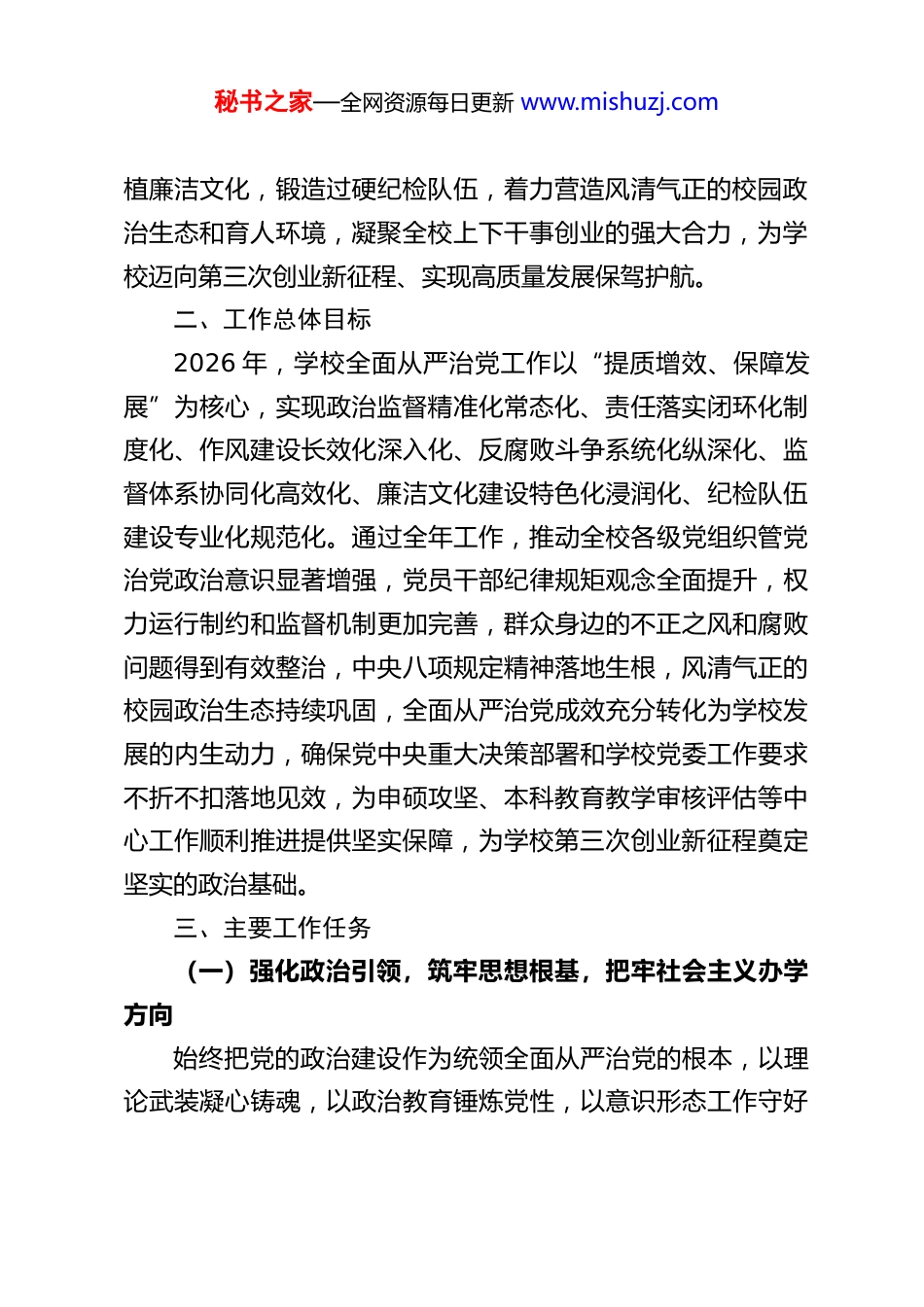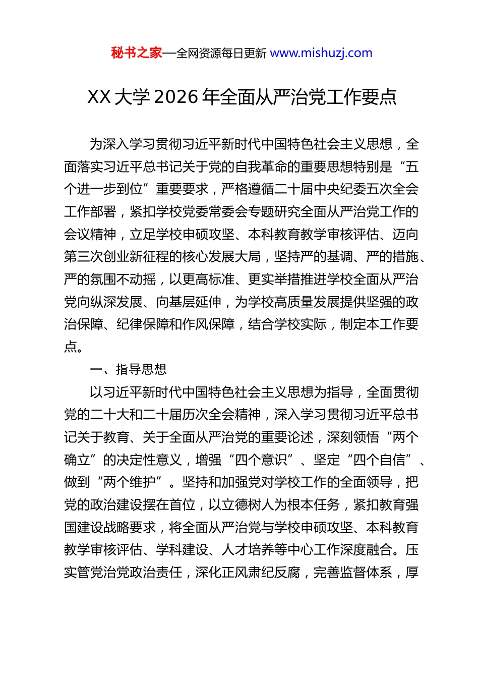 秘书之家—全网资源每日更新 www.mishuzj.comXX 大学 2026 年全面从严治党工作要点为深入学习贯彻习近平新时代中国特色社会主义思想,全面落实习近平总书记关于党的自我革命的重要思想特别是“五个进一步到位”重要要求,严格遵循二十届中央纪委五次全会工作部署,紧扣学校党委常委会专题研究全面从严治党工作的会议精神,立足学校申硕攻坚、本科教育教学审核评估、迈向第三次创业新征程的核心发展大局,坚持严的基调、严的措施、严的氛围不动摇,以更高标准、更实举措推进学校全面从严治党向纵深发展、向基层延伸,为学校高质量发展提供坚强的政治保障、纪律保障和作风保障,结合学校实际,制定本工作要点。一、指导思想以习近平新时代中国特色社会主义思想为指导,全面贯彻党的二十大和二十届历次全会精神,深入学习贯彻习近平总书记关于教育、关于全面从严治党的重要论述,深刻领悟“两个确立”的决定性意义,增强“四个意识”、坚定“四个自信”、做到“两个维护”。坚持和加强党对学校工作的全面领导,把党的政治建设摆在首位,以立德树人为根本任务,紧扣教育强国建设战略要求,将全面从严治党与学校申硕攻坚、本科教育教学审核评估、学科建设、人才培养等中心工作深度融合。压实管党治党政治责任,深化正风肃纪反腐,完善监督体系,厚秘书之家—全网资源每日更新 www.mishuzj.com植廉洁文化,锻造过硬纪检队伍,着力营造风清气正的校园政治生态和育人环境,凝聚全校上下干事创业的强大合力,为学校迈向第三次创业新征程、实现高质量发展保驾护航。二、工作总体目标2026 年,学校全面从严治党工作以“提质增效、保障发展”为核心,实现政治监督精准化常态化、责任落实闭环化制度化、作风建设长效化深入化、反腐败斗争系统化纵深化、监督体系协同化高效化、廉洁文化建设特色化浸润化、纪检队伍建设专业化规范化。通过全年工作,推动全校各级党组织管党治党政治意识显著增强,党员干部纪律规矩观念全面提升,权力运行制约和监督机制更加完善,群众身边的不正之风和腐败问题得到有效整治,中央八项规定精神落地生根,风清气正的校园政治生态持续巩固,全面从严治党成效充分转化为学校发展的内生动力,确保党中央重大决策部署和学校党委工作要求不折不扣落地见效,为申硕攻坚、本科教育教学审核评估等中心工作顺利推进提供坚实保障,为学校第三次创业新征程奠定坚实的政治基础。三、主要工作任务(一)强化政治引领,筑牢思想根基,把牢社会主义办学方向始终把党的政治建设作为统领全面从严治党的根本,以理论武装凝心铸魂,以政治教育锤炼党性,以意识形态工作守好秘书之家—全网资源每日更新 www.mishuzj.com阵地,确保学校始终坚持社会主义办学方向,始终与党中央保持高度一致。1.深化理论武装,抓实首要政治任务。严格执行“第一议题”制度,学校党委常委会、院级党组织理论学习中心组将学习习近平新时代中国特色社会主义思想、习近平总书记关于党的自我革命的重要思想、“五个进一步到位”重要要求以及二十届中央纪委五次全会精神作为首要内容,做到学深悟透、融会贯通。制定年度理论学习计划,通过专题学习、研讨交流、专家辅导、实地研学等形式,推动理论学习往深里走、往实里走、往心里走。充分发挥党支部“三会一课”、主题党日等基层学习阵地作用,推动理论学习覆盖全体党员,引导党员干部深刻把握全面从严治党的核心要义、实践要求,切实把学习成果转化为履职尽责、推动学校发展的实际行动。2.聚焦政治教育,提升党员政治能力。常态化开展政治忠诚教育、党性党风党纪教育,将全面从严治党相关内容纳入党员干部教育培训体系,作为新任干部、党务工作者培训的必修课,全年组织开展不少于 2 次的全校性政治教育专题活动。围绕“国之大者”,引导党员干部不断提高政治判断力、政治领悟力、政治执行力,深刻把握高等教育的政治属性,始终把立德树人作为根本任务,把服务教育强国建设作为重要使命,确保学校各项工作始终沿着正确政治方向推进。3.严守意识形态阵地,筑牢安全防线。严格落实意识形态秘书之家—全网资源每日更新 www.mishuzj.com工作责任制,学校党...