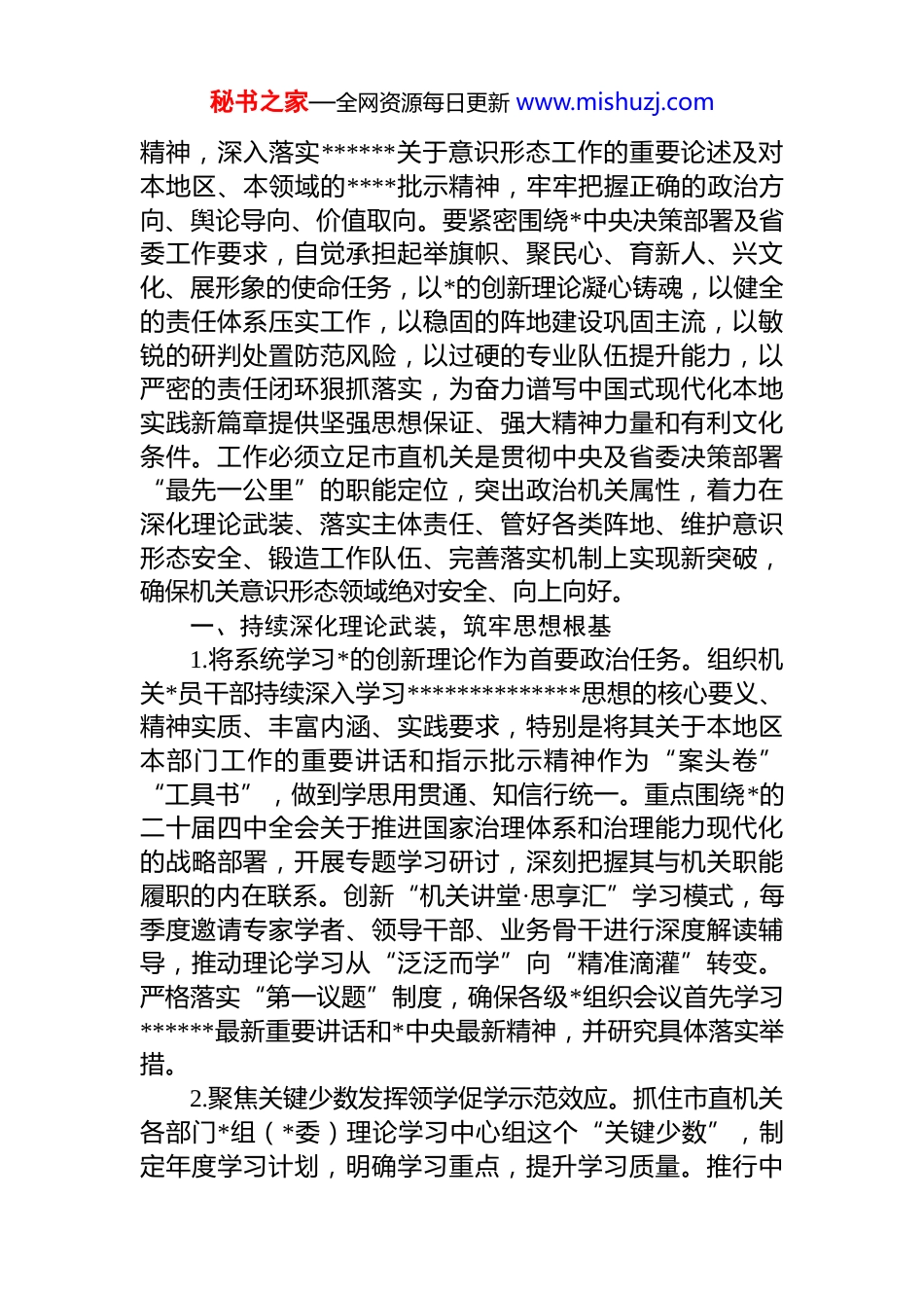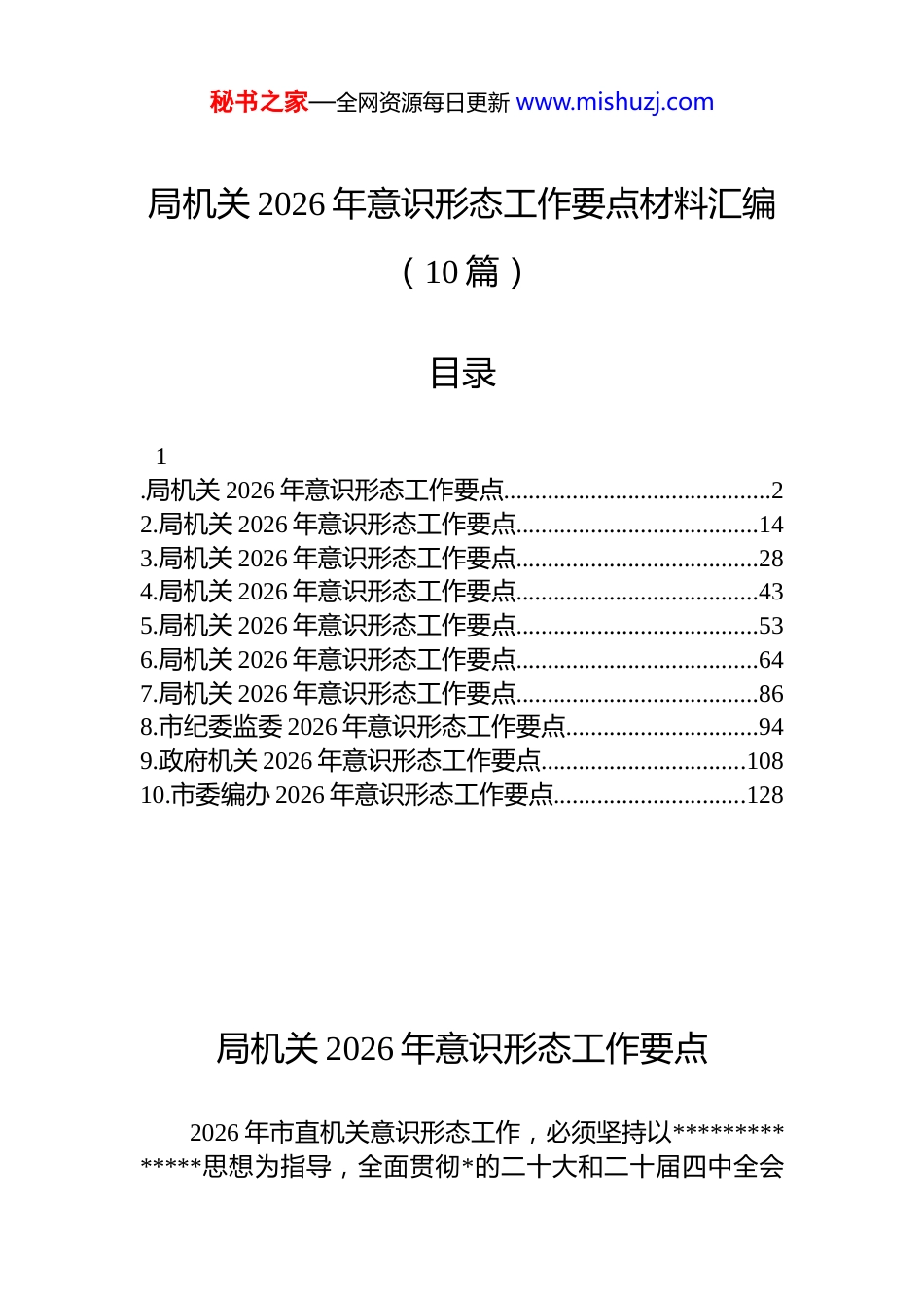 秘书之家—全网资源每日更新 www.mishuzj.com局机关 2026 年意识形态工作要点材料汇编(10 篇)目录1.局机关 2026 年意识形态工作要点...........................................22.局机关 2026 年意识形态工作要点.......................................143.局机关 2026 年意识形态工作要点.......................................284.局机关 2026 年意识形态工作要点.......................................435.局机关 2026 年意识形态工作要点.......................................536.局机关 2026 年意识形态工作要点.......................................647.局机关 2026 年意识形态工作要点.......................................868.市纪委监委 2026 年意识形态工作要点...............................949.政府机关 2026 年意识形态工作要点.................................10810.市委编办 2026 年意识形态工作要点...............................128局机关 2026 年意识形态工作要点2026 年市直机关意识形态工作,必须坚持以**************思想为指导,全面贯彻*的二十大和二十届四中全会秘书之家—全网资源每日更新 www.mishuzj.com精神,深入落实******关于意识形态工作的重要论述及对本地区、本领域的****批示精神,牢牢把握正确的政治方向、舆论导向、价值取向。要紧密围绕*中央决策部署及省委工作要求,自觉承担起举旗帜、聚民心、育新人、兴文化、展形象的使命任务,以*的创新理论凝心铸魂,以健全的责任体系压实工作,以稳固的阵地建设巩固主流,以敏锐的研判处置防范风险,以过硬的专业队伍提升能力,以严密的责任闭环狠抓落实,为奋力谱写中国式现代化本地实践新篇章提供坚强思想保证、强大精神力量和有利文化条件。工作必须立足市直机关是贯彻中央及省委决策部署“最先一公里”的职能定位,突出政治机关属性,着力在深化理论武装、落实主体责任、管好各类阵地、维护意识形态安全、锻造工作队伍、完善落实机制上实现新突破,确保机关意识形态领域绝对安全、向上向好。一、持续深化理论武装,筑牢思想根基1.将系统学习*的创新理论作为首要政治任务。组织机关*员干部持续深入学习**************思想的核心要义、精神实质、丰富内涵、实践要求,特别是将其关于本地区本部门工作的重要讲话和指示批示精神作为“案头卷”“工具书”,做到学思用贯通、知信行统一。重点围绕*的二十届四中全会关于推进国家治理体系和治理能力现代化的战略部署,开展专题学习研讨,深刻把握其与机关职能履职的内在联系。创新“机关讲堂·思享汇”学习模式,每季度邀请专家学者、领导干部、业务骨干进行深度解读辅导,推动理论学习从“泛泛而学”向“精准滴灌”转变。严格落实“第一议题”制度,确保各级*组织会议首先学习******最新重要讲话和*中央最新精神,并研究具体落实举措。2.聚焦关键少数发挥领学促学示范效应。抓住市直机关各部门*组(*委)理论学习中心组这个“关键少数”,制定年度学习计划,明确学习重点,提升学习质量。推行中秘书之家—全网资源每日更新 www.mishuzj.com心组学习巡听旁听制度,由机关工委牵头,对部分单位中心组学习情况进行现场指导与评估反馈。组织开展“一把手”谈意识形态工作、讲专题*课活动,推动领导干部带头撰写理论文章、调研报告,公开宣讲学习体会。建立领导干部理论学习考评档案,将学习情况、运用理论解决实际问题的能力作为干部考核评价的重要依据。举办“奋进新征程·机关作表率”领导干部读书班,围绕重大理论和现实问题进行封闭式学习研讨。3.拓展青年干部理论武装的深度与广度。针对机关青年干部思维活跃、可塑性强的特点,实施“青年理论提升工程”。组建跨部门、跨领域的“青年理论学习研习组”,定期举办“xx”理论沙龙、经典著作读书会、时政热点辩论赛等活动。开展“根在基层·心向*旗”青年干部主题调研实践,鼓励青年干部结合理论学习,深入基层一线了解市情民意,形成高质量调研成果。利用线上平台开设“青年大学习·机关篇”专栏,推送微*课、短视频、图解文章等符合青年特点的学...