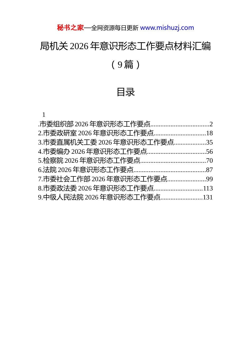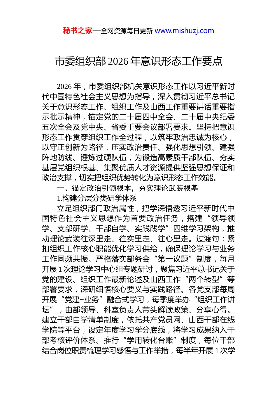 秘书之家—全网资源每日更新 www.mishuzj.com局机关 2026 年意识形态工作要点材料汇编(9 篇)目录1.市委组织部 2026 年意识形态工作要点...................................22.市委政研室 2026 年意识形态工作要点...............................183.市委直属机关工委 2026 年意识形态工作要点...................354.市委编办 2026 年意识形态工作要点...................................565.检察院 2026 年意识形态工作要点.......................................706.法院 2026 年意识形态工作要点...........................................877.市委社会工作部 2026 年意识形态工作要点.......................998.市委政法委 2026 年意识形态工作要点.............................1139.中级人民法院 2026 年意识形态工作要点.........................131秘书之家—全网资源每日更新 www.mishuzj.com市委组织部 2026 年意识形态工作要点2026 年,市委组织部机关意识形态工作以习近平新时代中国特色社会主义思想为指导,深入贯彻习近平总书记关于意识形态工作、组织工作及山西工作重要讲话重要指示批示精神,锚定党的二十届四中全会、二十届中央纪委五次全会及党中央、省委重要会议部署要求。坚持把意识形态工作贯穿组织工作全过程,以筑牢政治忠诚为核心,以守正创新为路径,压实政治责任、强化思想引领、建强阵地防线、锤炼过硬队伍,为锻造高素质干部队伍、夯实基层党组织根基、集聚优质人才资源提供坚强思想保证和政治支撑,切实把组织优势转化为意识形态工作效能。一、锚定政治引领根本,夯实理论武装根基1.构建分层分类研学体系立足组织部门政治属性,把学深悟透习近平新时代中国特色社会主义思想作为首要政治任务,搭建“领导领学、支部研学、干部自学、实践践学”四维学习架构,推动理论武装往深里走、往实里走、往心里走。过渡句:紧扣组织工作核心职能优化学习供给,确保理论学习与业务工作同频共振。严格落实部务会“第一议题”制度,每月开展 1 次理论学习中心组专题研讨,聚焦习近平总书记关于党的建设、组织工作最新论述及山西工作“两个转型”等部署要求,深研细悟核心要义与实践路径。各党支部每周开展“党建+业务”融合式学习,每季度举办“组织工作讲坛”,由部领导、科室负责人带头解读政策、分享心得。建立干部自学清单制度,依托共产党员网、山西干部在线学院等平台,设定年度学习学分底线,将学习成果纳入干部考核评价体系。推行“学用转化台账”制度,每位干部结合岗位职责梳理学习感悟与工作举措,每半年开展 1 次学秘书之家—全网资源每日更新 www.mishuzj.com用成效评估,倒逼理论学习从“被动接受”向“主动践行”转变,切实把学习成果转化为破解组织工作难题的实际能力。2.深化政策精神精准宣讲聚焦党中央和省委重要会议精神及习近平总书记重要指示批示精神,构建靶向式、全覆盖宣讲机制,推动政策精神在组织系统落地生根。过渡句:结合组织部门工作特点创新宣讲形式,增强政策解读的针对性和感染力。组建部机关“政策宣讲轻骑兵”,由业务骨干、年轻干部组成,围绕党的二十届四中全会关于意识形态建设、基层治理等部署,二十届中央纪委五次全会关于干部作风建设要求,开展“送学上门”活动,深入各县(市、区)组织部、基层党组织开展专题宣讲。创新宣讲载体,打造“微宣讲+实场景”模式,利用晨会、工间操等碎片化时间开展“一刻钟微宣讲”,结合干部考察、基层调研等工作,在一线解读政策、回应关切。建立宣讲反馈机制,通过问卷调查、座谈交流等方式收集基层对政策宣讲的需求建议,动态调整宣讲内容与形式。每季度编印《政策解读汇编》,聚焦组织工作重点领域,对干部选拔任用、基层党建、人才工作等政策进行精准阐释,为基层开展工作提供指导,切实打通政策宣讲“最后一公里”。3.强化政治忠诚教育淬炼以筑牢组织干部政治忠诚为核心,常态化开展政治教育、党性教育,不断提升干部政治判断力、政治领悟力、政治执行力。过渡句:把政治忠诚教育融入干部成长全周期,以严的标准锤炼过硬政治品格。开展“...