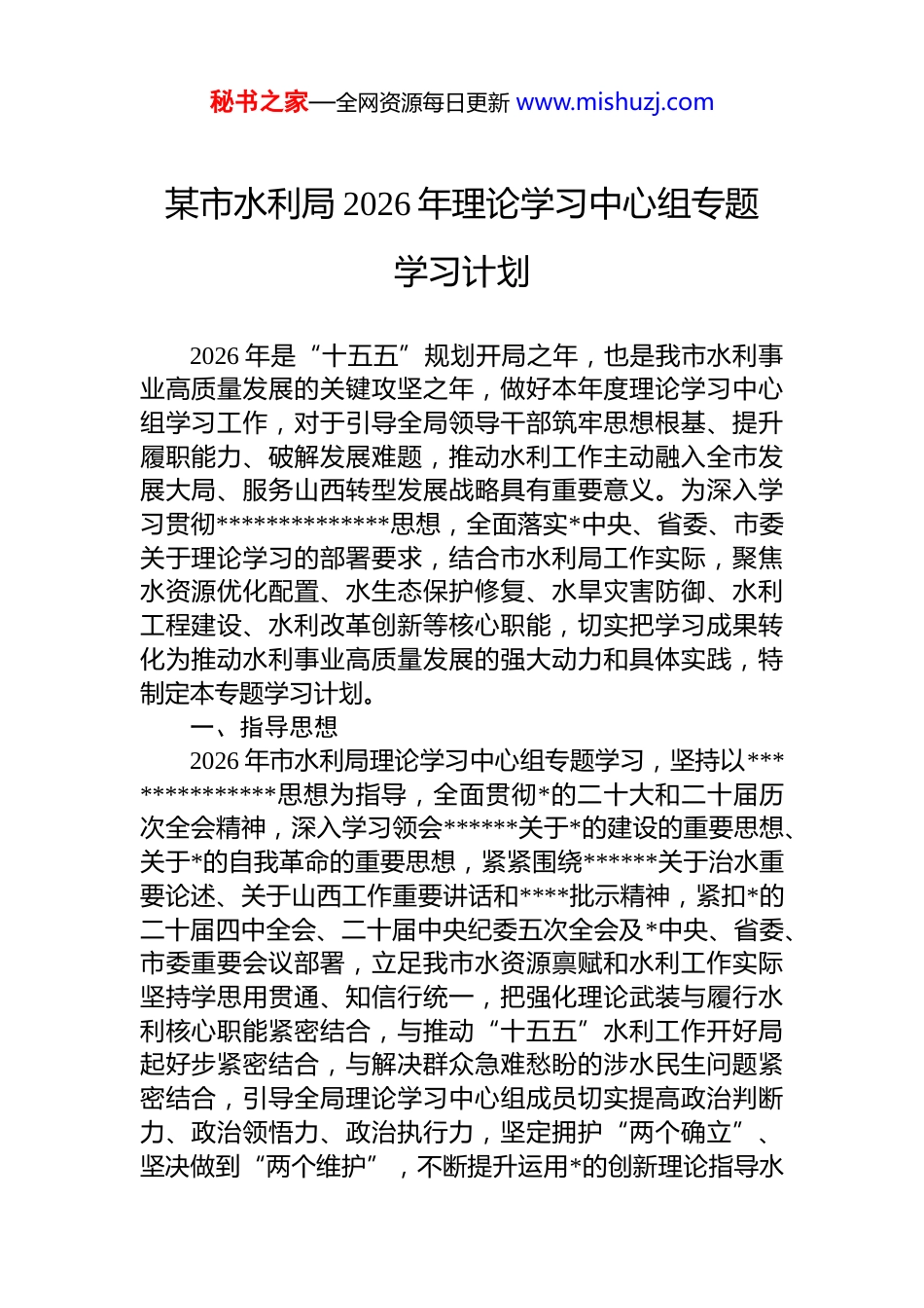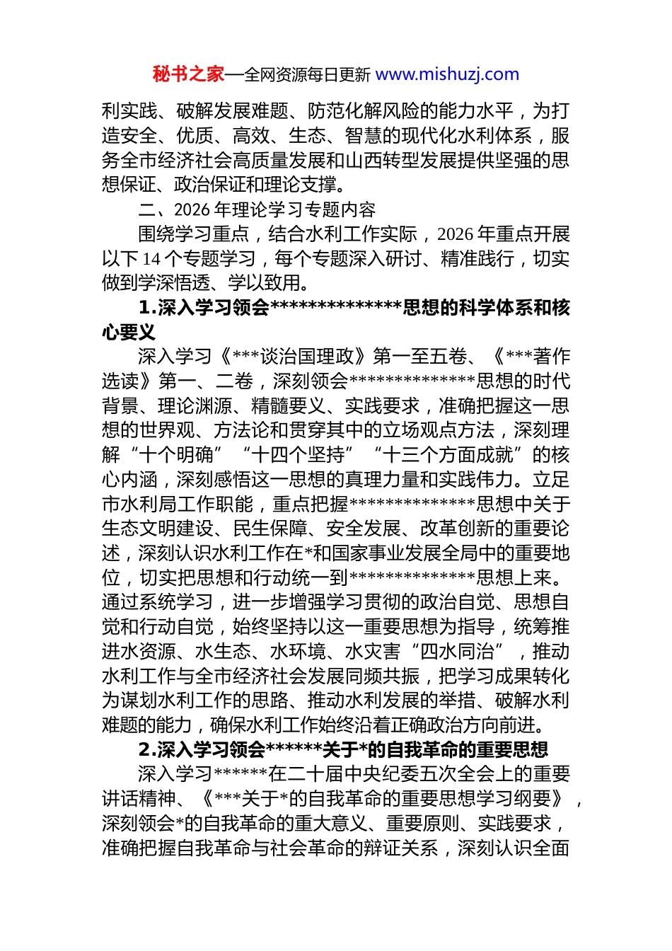 秘书之家—全网资源每日更新 www.mishuzj.com某市水利局 2026 年理论学习中心组专题学习计划2026 年是“十五五”规划开局之年,也是我市水利事业高质量发展的关键攻坚之年,做好本年度理论学习中心组学习工作,对于引导全局领导干部筑牢思想根基、提升履职能力、破解发展难题,推动水利工作主动融入全市发展大局、服务山西转型发展战略具有重要意义。为深入学习贯彻**************思想,全面落实*中央、省委、市委关于理论学习的部署要求,结合市水利局工作实际,聚焦水资源优化配置、水生态保护修复、水旱灾害防御、水利工程建设、水利改革创新等核心职能,切实把学习成果转化为推动水利事业高质量发展的强大动力和具体实践,特制定本专题学习计划。一、指导思想2026 年市水利局理论学习中心组专题学习,坚持以**************思想为指导,全面贯彻*的二十大和二十届历次全会精神,深入学习领会******关于*的建设的重要思想、关于*的自我革命的重要思想,紧紧围绕******关于治水重要论述、关于山西工作重要讲话和****批示精神,紧扣*的二十届四中全会、二十届中央纪委五次全会及*中央、省委、市委重要会议部署,立足我市水资源禀赋和水利工作实际坚持学思用贯通、知信行统一,把强化理论武装与履行水利核心职能紧密结合,与推动“十五五”水利工作开好局起好步紧密结合,与解决群众急难愁盼的涉水民生问题紧密结合,引导全局理论学习中心组成员切实提高政治判断力、政治领悟力、政治执行力,坚定拥护“两个确立”、坚决做到“两个维护”,不断提升运用*的创新理论指导水秘书之家—全网资源每日更新 www.mishuzj.com利实践、破解发展难题、防范化解风险的能力水平,为打造安全、优质、高效、生态、智慧的现代化水利体系,服务全市经济社会高质量发展和山西转型发展提供坚强的思想保证、政治保证和理论支撑。二、2026 年理论学习专题内容围绕学习重点,结合水利工作实际,2026 年重点开展以下 14 个专题学习,每个专题深入研讨、精准践行,切实做到学深悟透、学以致用。1.深入学习领会**************思想的科学体系和核心要义深入学习《***谈治国理政》第一至五卷、《***著作选读》第一、二卷,深刻领会**************思想的时代背景、理论渊源、精髓要义、实践要求,准确把握这一思想的世界观、方法论和贯穿其中的立场观点方法,深刻理解“十个明确”“十四个坚持”“十三个方面成就”的核心内涵,深刻感悟这一思想的真理力量和实践伟力。立足市水利局工作职能,重点把握**************思想中关于生态文明建设、民生保障、安全发展、改革创新的重要论述,深刻认识水利工作在*和国家事业发展全局中的重要地位,切实把思想和行动统一到**************思想上来。通过系统学习,进一步增强学习贯彻的政治自觉、思想自觉和行动自觉,始终坚持以这一重要思想为指导,统筹推进水资源、水生态、水环境、水灾害“四水同治”,推动水利工作与全市经济社会发展同频共振,把学习成果转化为谋划水利工作的思路、推动水利发展的举措、破解水利难题的能力,确保水利工作始终沿着正确政治方向前进。2.深入学习领会******关于*的自我革命的重要思想深入学习******在二十届中央纪委五次全会上的重要讲话精神、《***关于*的自我革命的重要思想学习纲要》,深刻领会*的自我革命的重大意义、重要原则、实践要求,准确把握自我革命与社会革命的辩证关系,深刻认识全面秘书之家—全网资源每日更新 www.mishuzj.com从严治*是新时代*的自我革命的伟大实践,是推进*的建设新的伟大工程的必然要求。结合市水利局工作实际,深刻认识水利系统全面从严治*的重要性和紧迫性,深刻把握水利领域*风廉政建设和反腐败工作的特点规律,切实把*的自我革命的重要思想融入水利工作全过程各方面。重点学习******关于从严管*治*、作风建设、纪律建设的重要论述,深刻汲取水利系统违纪违法典型案例教训,筑牢拒腐防变的思想防线和制度防线。通过学习,进一步强化管*治*政治责任,健全完善水利系统全面从严治*工作体系,加强*员干部教育管理监督,持之以恒正风肃纪,坚决纠治水利领域形式主义、官僚主义,着力打造忠...