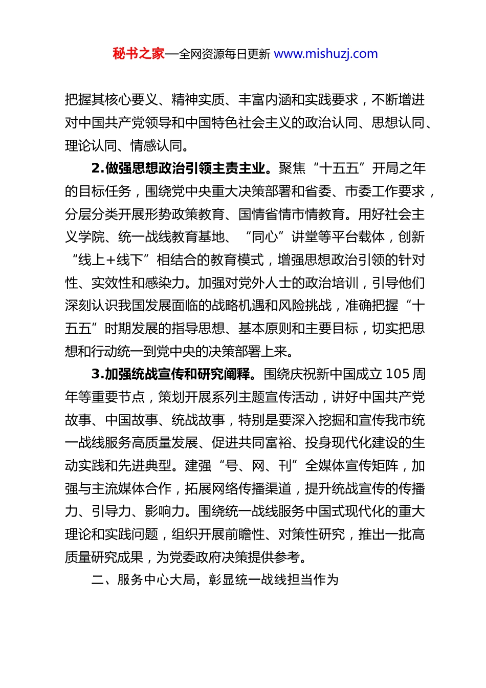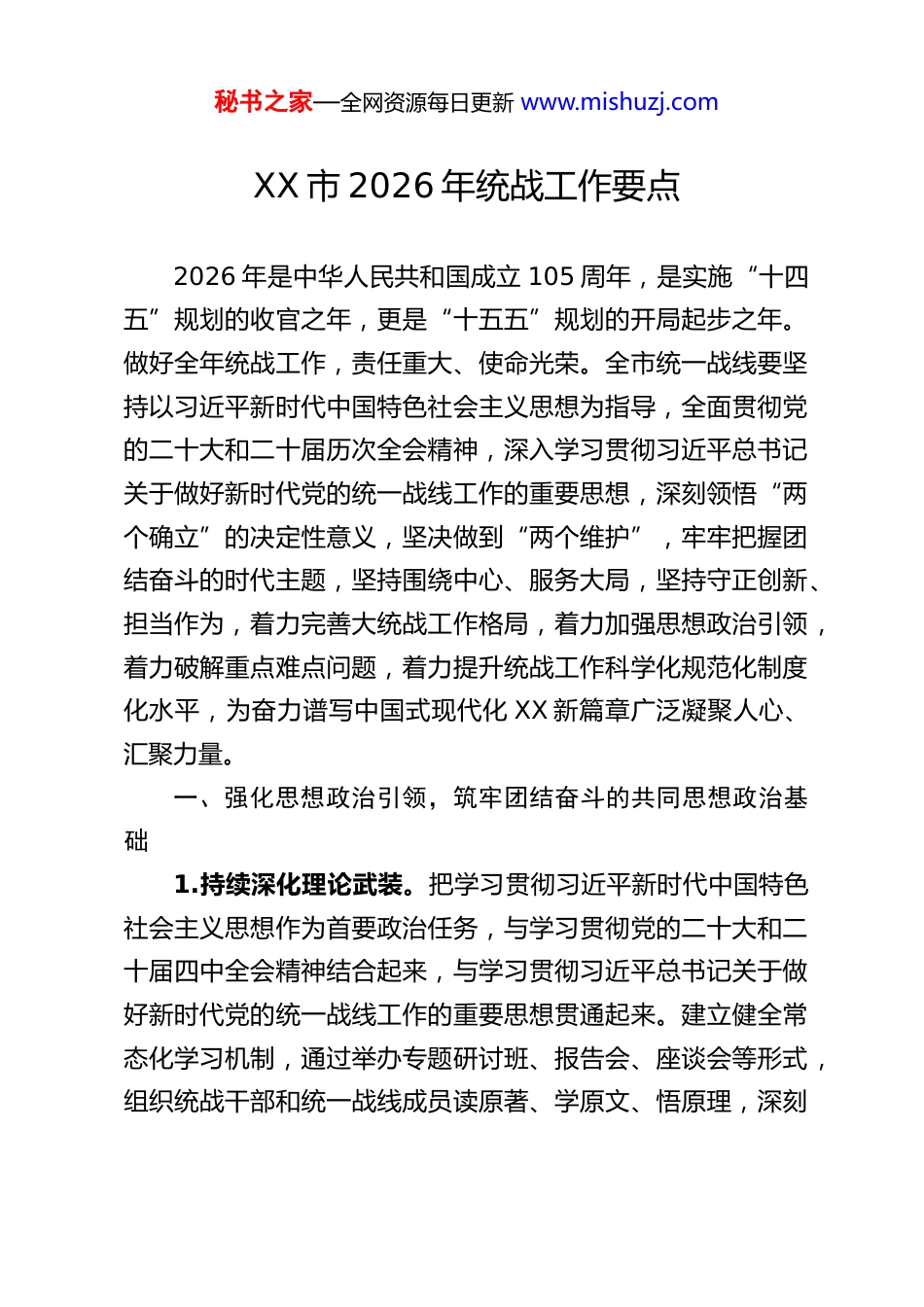 秘书之家—全网资源每日更新 www.mishuzj.comXX 市 2026 年统战工作要点2026 年是中华人民共和国成立 105 周年,是实施“十四五”规划的收官之年,更是“十五五”规划的开局起步之年。做好全年统战工作,责任重大、使命光荣。全市统一战线要坚持以习近平新时代中国特色社会主义思想为指导,全面贯彻党的二十大和二十届历次全会精神,深入学习贯彻习近平总书记关于做好新时代党的统一战线工作的重要思想,深刻领悟“两个确立”的决定性意义,坚决做到“两个维护”,牢牢把握团结奋斗的时代主题,坚持围绕中心、服务大局,坚持守正创新、担当作为,着力完善大统战工作格局,着力加强思想政治引领,着力破解重点难点问题,着力提升统战工作科学化规范化制度化水平,为奋力谱写中国式现代化 XX 新篇章广泛凝聚人心、汇聚力量。一、强化思想政治引领,筑牢团结奋斗的共同思想政治基础1.持续深化理论武装。把学习贯彻习近平新时代中国特色社会主义思想作为首要政治任务,与学习贯彻党的二十大和二十届四中全会精神结合起来,与学习贯彻习近平总书记关于做好新时代党的统一战线工作的重要思想贯通起来。建立健全常态化学习机制,通过举办专题研讨班、报告会、座谈会等形式,组织统战干部和统一战线成员读原著、学原文、悟原理,深刻秘书之家—全网资源每日更新 www.mishuzj.com把握其核心要义、精神实质、丰富内涵和实践要求,不断增进对中国共产党领导和中国特色社会主义的政治认同、思想认同、理论认同、情感认同。2.做强思想政治引领主责主业。聚焦“十五五”开局之年的目标任务,围绕党中央重大决策部署和省委、市委工作要求,分层分类开展形势政策教育、国情省情市情教育。用好社会主义学院、统一战线教育基地、“同心”讲堂等平台载体,创新“线上+线下”相结合的教育模式,增强思想政治引领的针对性、实效性和感染力。加强对党外人士的政治培训,引导他们深刻认识我国发展面临的战略机遇和风险挑战,准确把握“十五五”时期发展的指导思想、基本原则和主要目标,切实把思想和行动统一到党中央的决策部署上来。3.加强统战宣传和研究阐释。围绕庆祝新中国成立 105 周年等重要节点,策划开展系列主题宣传活动,讲好中国共产党故事、中国故事、统战故事,特别是要深入挖掘和宣传我市统一战线服务高质量发展、促进共同富裕、投身现代化建设的生动实践和先进典型。建强“号、网、刊”全媒体宣传矩阵,加强与主流媒体合作,拓展网络传播渠道,提升统战宣传的传播力、引导力、影响力。围绕统一战线服务中国式现代化的重大理论和实践问题,组织开展前瞻性、对策性研究,推出一批高质量研究成果,为党委政府决策提供参考。二、服务中心大局,彰显统一战线担当作为秘书之家—全网资源每日更新 www.mishuzj.com4.聚焦高质量发展建言献策。支持各民主党派、工商联和无党派人士围绕市委市政府中心工作,特别是“十五五”规划实施、发展新质生产力、深化改革开放、推进乡村振兴、优化营商环境、保障和改善民生等重大课题,深入开展调查研究,提出高质量、可操作的意见建议。完善“党委出题、党派调研、政府采纳、部门落实”的调研工作机制,畅通建言献策“直通车”渠道,推动调研成果转化运用。5.聚力“双招双引”和项目建设。充分发挥统一战线联系广泛、人才荟萃、智力密集的优势,积极搭建平台、整合资源。依托工商联、商会、海外联谊会、侨联等组织,大力开展以商招商、以情招商、以链招商。办好“XX 发展大会”“海内外XX 人大会”等品牌活动,吸引更多海内外优秀人才、优质项目、先进技术落户 XX。引导民营企业家坚定发展信心,积极参与重大项目建设,在扩大有效投资、稳定经济增长中发挥更大作用。6.助力民营经济“两个健康”。深入贯彻落实党中央关于促进民营经济发展壮大的意见及配套政策,推动各项惠企纾困政策直达快享、落地见效。常态化开展“政企面对面”“服务企业专员”等活动,畅通民营企业诉求反映和权益维护渠道,依法保护民营企业产权和企业家合法权益。加强民营经济人士理想信念教育和社会主义核心价值观培育,弘扬企业家精神,引导他们爱国敬业、守法经营、创...