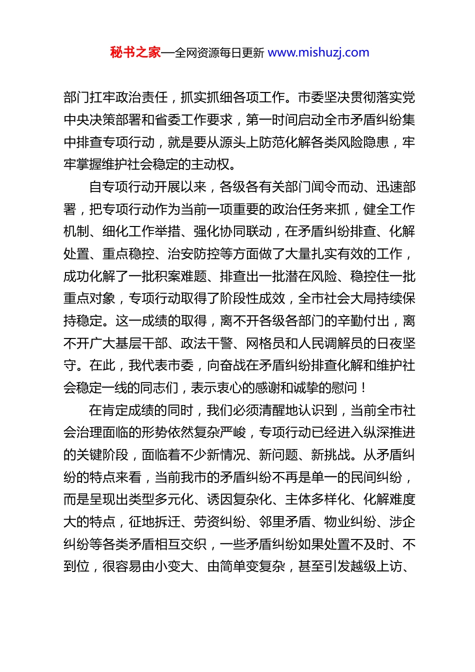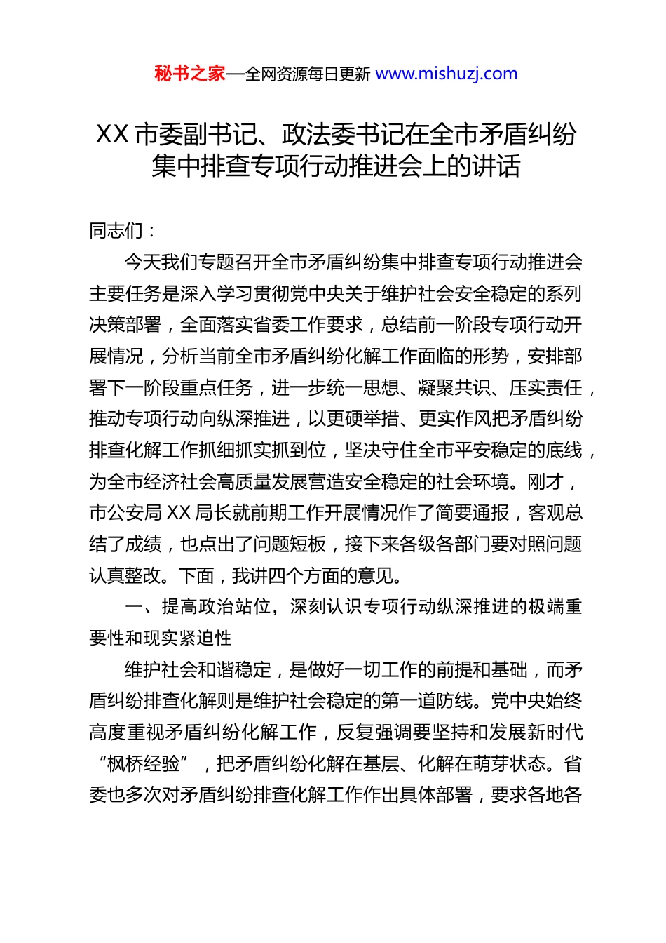 秘书之家—全网资源每日更新 www.mishuzj.comXX 市委副书记、政法委书记在全市矛盾纠纷集中排查专项行动推进会上的讲话同志们:今天我们专题召开全市矛盾纠纷集中排查专项行动推进会主要任务是深入学习贯彻党中央关于维护社会安全稳定的系列决策部署,全面落实省委工作要求,总结前一阶段专项行动开展情况,分析当前全市矛盾纠纷化解工作面临的形势,安排部署下一阶段重点任务,进一步统一思想、凝聚共识、压实责任,推动专项行动向纵深推进,以更硬举措、更实作风把矛盾纠纷排查化解工作抓细抓实抓到位,坚决守住全市平安稳定的底线,为全市经济社会高质量发展营造安全稳定的社会环境。刚才,市公安局 XX 局长就前期工作开展情况作了简要通报,客观总结了成绩,也点出了问题短板,接下来各级各部门要对照问题认真整改。下面,我讲四个方面的意见。一、提高政治站位,深刻认识专项行动纵深推进的极端重要性和现实紧迫性维护社会和谐稳定,是做好一切工作的前提和基础,而矛盾纠纷排查化解则是维护社会稳定的第一道防线。党中央始终高度重视矛盾纠纷化解工作,反复强调要坚持和发展新时代“枫桥经验”,把矛盾纠纷化解在基层、化解在萌芽状态。省委也多次对矛盾纠纷排查化解工作作出具体部署,要求各地各秘书之家—全网资源每日更新 www.mishuzj.com部门扛牢政治责任,抓实抓细各项工作。市委坚决贯彻落实党中央决策部署和省委工作要求,第一时间启动全市矛盾纠纷集中排查专项行动,就是要从源头上防范化解各类风险隐患,牢牢掌握维护社会稳定的主动权。自专项行动开展以来,各级各有关部门闻令而动、迅速部署,把专项行动作为当前一项重要的政治任务来抓,健全工作机制、细化工作举措、强化协同联动,在矛盾纠纷排查、化解处置、重点稳控、治安防控等方面做了大量扎实有效的工作,成功化解了一批积案难题、排查出一批潜在风险、稳控住一批重点对象,专项行动取得了阶段性成效,全市社会大局持续保持稳定。这一成绩的取得,离不开各级各部门的辛勤付出,离不开广大基层干部、政法干警、网格员和人民调解员的日夜坚守。在此,我代表市委,向奋战在矛盾纠纷排查化解和维护社会稳定一线的同志们,表示衷心的感谢和诚挚的慰问!在肯定成绩的同时,我们必须清醒地认识到,当前全市社会治理面临的形势依然复杂严峻,专项行动已经进入纵深推进的关键阶段,面临着不少新情况、新问题、新挑战。从矛盾纠纷的特点来看,当前我市的矛盾纠纷不再是单一的民间纠纷,而是呈现出类型多元化、诱因复杂化、主体多样化、化解难度大的特点,征地拆迁、劳资纠纷、邻里矛盾、物业纠纷、涉企纠纷等各类矛盾相互交织,一些矛盾纠纷如果处置不及时、不到位,很容易由小变大、由简单变复杂,甚至引发越级上访、秘书之家—全网资源每日更新 www.mishuzj.com群体性事件和个人极端案事件。从工作推进的情况来看,部分地区和部门还存在思想认识不够到位、排查手段不够丰富、化解措施不够精准、责任落实不够严实等问题,有的地方存在“重排查、轻化解”“重形式、轻实效”的现象,排查工作存在盲区和死角,对一些潜在的风险隐患未能及时发现;有的部门之间协同联动不够顺畅,存在“各自为战”的情况,形成了“信息壁垒”,影响了矛盾纠纷化解的效率;有的基层化解能力不足,面对复杂矛盾纠纷时办法不多、措施不硬,导致一些矛盾纠纷久拖不决。从发展的大局来看,当前我市正处于推动高质量发展的关键时期,各项重点工作、重大项目加快推进,改革发展的任务十分繁重,越是在这样的时期,越需要稳定的社会环境作保障。如果矛盾纠纷排查化解工作抓不好,各类风险隐患得不到有效管控,不仅会影响人民群众的幸福感、安全感,还会阻碍改革发展的步伐,甚至影响全市发展大局。同志们,矛盾纠纷排查化解工作,事关人民群众切身利益事关社会和谐稳定,事关党和政府在人民群众心中的形象。各级各部门必须进一步提高政治站位,切实把思想和行动统一到党中央决策部署和省委、市委工作要求上来,深刻认识到开展矛盾纠纷集中排查专项行动不是“阶段性任务”,而是“常态化要求”;不是“软指标”,而是“硬责任”。要始终坚...