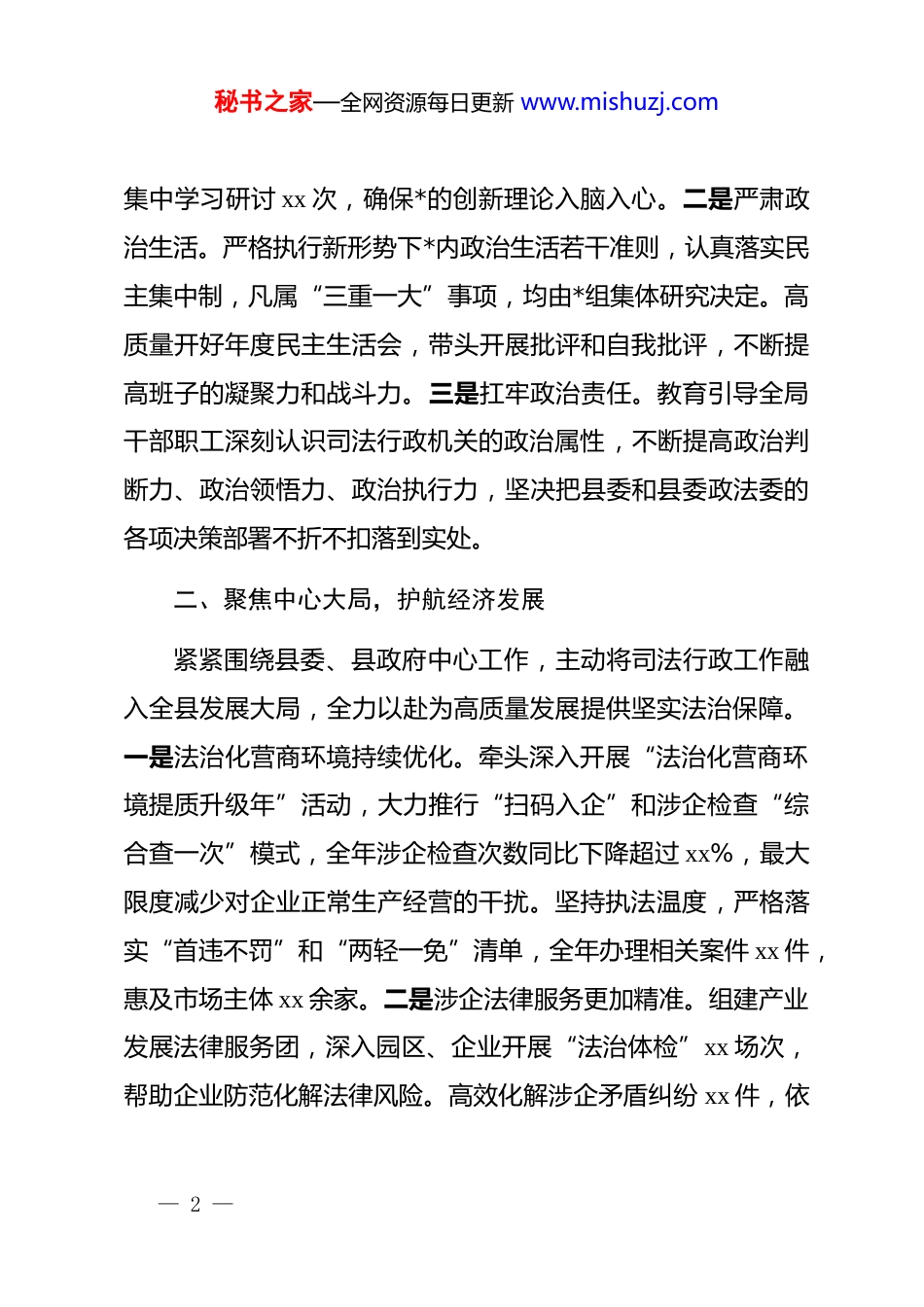 秘书之家—全网资源每日更新 www.mishuzj.comx 县司法局局长 2025 年度履行县委政法委员会委员职责情况的报告尊敬的各位领导、同志们:2025 年,在县委、县政府和县委政法委的坚强领导下,我始终坚持以**************思想为指导,团结带领县司法局全体干部职工,紧紧围绕全县政法工作大局,忠诚履职、务实作为,较好地完成了各项工作任务,为维护全县社会大局稳定、服务经济社会高质量发展贡献了法治力量。将我作为县委政法委员,2025 年度履职情况及分管的司法行政工作成效报告如下,请予评议。一、聚焦政治建设,筑牢忠诚根基作为政法队伍的一员,我深知旗帜鲜明讲政治是第一位的要求。一年来,始终将*的政治建设摆在首位,确保司法行政工作始终沿着正确的政治方向前进。一是抓实理论学习。严格落实“第一议题”制度,将******关于政法工作、法治建设的重要论述作为*组会、中心组学习的首要内容,第一时间传达学习、第一时间研究贯彻。全年组织*组理论学习中心组学习 xx 次,— 1 —秘书之家—全网资源每日更新 www.mishuzj.com集中学习研讨 xx 次,确保*的创新理论入脑入心。二是严肃政治生活。严格执行新形势下*内政治生活若干准则,认真落实民主集中制,凡属“三重一大”事项,均由*组集体研究决定。高质量开好年度民主生活会,带头开展批评和自我批评,不断提高班子的凝聚力和战斗力。三是扛牢政治责任。教育引导全局干部职工深刻认识司法行政机关的政治属性,不断提高政治判断力、政治领悟力、政治执行力,坚决把县委和县委政法委的各项决策部署不折不扣落到实处。二、聚焦中心大局,护航经济发展紧紧围绕县委、县政府中心工作,主动将司法行政工作融入全县发展大局,全力以赴为高质量发展提供坚实法治保障。一是法治化营商环境持续优化。牵头深入开展“法治化营商环境提质升级年”活动,大力推行“扫码入企”和涉企检查“综合查一次”模式,全年涉企检查次数同比下降超过 xx%,最大限度减少对企业正常生产经营的干扰。坚持执法温度,严格落实“首违不罚”和“两轻一免”清单,全年办理相关案件 xx 件,惠及市场主体 xx 余家。二是涉企法律服务更加精准。组建产业发展法律服务团,深入园区、企业开展“法治体检”xx 场次,帮助企业防范化解法律风险。高效化解涉企矛盾纠纷 xx 件,依— 2 —秘书之家—全网资源每日更新 www.mishuzj.com法审结涉企行政复议案件 xx 件,有力维护了公平竞争的市场秩序。三是行政争议化解成效显著。针对行政负责人“出庭不出声”问题,加强府院联动与业务指导,推动行政机关依法行政水平提升。2025 年,全县行政案件一审败诉率降至 xx%,同比降低 xx 个百分点,败诉率为全市最低,法治政府建设根基更加牢固。三、聚焦民生福祉,优化法律服务始终坚持以人民为中心的发展思想,努力让人民群众在每一项法律服务中感受到公平正义和法治温暖。一是公共法律服务网络更健全。持续推进城乡公共法律服务均等化,深化“互联网+”模式,实现村(社区)法律顾问全覆盖。全年县管律师代理案件 xx 件,开展线上线下法律服务 xx 场次,解答群众咨询 xx 人次,群众获得法律服务的便捷性大幅提升。二是困难群体权益保障更有力。不断降低法律援助门槛,扩大援助范围,全年共办理法律援助案件 xx 件,为受援人挽回经济损失 xx 万元。特别是在根治欠薪方面,全年为 xx 名农民工追回劳动报酬xx 万元,切实维护了弱势群体的合法权益。三是公证服务质效再上新台阶。创新推出的公证处“小房”二手房交易提存平台经验,xx 次在全省公证系统培训会上作交流推广,负责人杜亦— 3 —秘书之家—全网资源每日更新 www.mishuzj.com磊同志荣获司法部通报表扬。全年办理公证 xx 件,提供上门服务 xx 次,群众满意度达到 xx%。四、聚焦平安建设,维护社会稳定作为县委政法委委员,维护社会和谐稳定是我的首要职责。我始终牢固树立底线思维,全力以赴防风险、保安全、护稳定。一是筑牢矛盾化解“第一道防线”。健全县、乡、村三级人民调解组织网络,全面建成“诉调、警调、访调”对接平台,推动力量融合、工作联动。全年共排查...