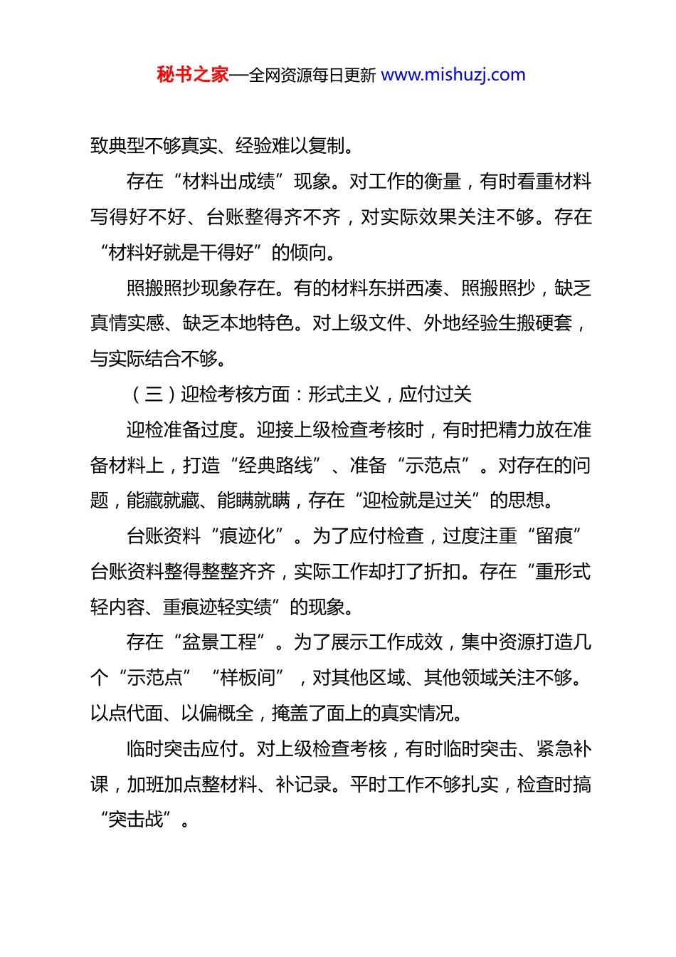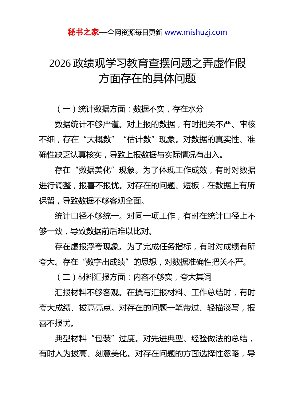 秘书之家—全网资源每日更新 www.mishuzj.com2026 政绩观学习教育查摆问题之弄虚作假方面存在的具体问题 (一)统计数据方面:数据不实,存在水分数据统计不够严谨。对上报的数据,有时把关不严、审核不细,存在“大概数”“估计数”现象。对数据的真实性、准确性缺乏认真核实,导致上报数据与实际情况有出入。存在“数据美化”现象。为了体现工作成效,有时对数据进行调整,报喜不报忧。对存在的问题、短板,在数据上有所保留,导致数据不够客观全面。统计口径不够统一。对同一项工作,有时在统计口径上不够一致,导致数据前后难以比对。存在虚报浮夸现象。为了完成任务指标,有时对成绩有所夸大。存在“数字出成绩”的思想,对数据准确性把关不严。(二)材料汇报方面:内容不够实,夸大其词汇报材料不够客观。在撰写汇报材料、工作总结时,有时夸大成绩、拔高亮点。对存在的问题一笔带过、轻描淡写,报喜不报忧。典型材料“包装”过度。对先进典型、经验做法的总结,有时人为拔高、刻意美化。对存在问题的方面选择性忽略,导秘书之家—全网资源每日更新 www.mishuzj.com致典型不够真实、经验难以复制。存在“材料出成绩”现象。对工作的衡量,有时看重材料写得好不好、台账整得齐不齐,对实际效果关注不够。存在“材料好就是干得好”的倾向。照搬照抄现象存在。有的材料东拼西凑、照搬照抄,缺乏真情实感、缺乏本地特色。对上级文件、外地经验生搬硬套,与实际结合不够。(三)迎检考核方面:形式主义,应付过关迎检准备过度。迎接上级检查考核时,有时把精力放在准备材料上,打造“经典路线”、准备“示范点”。对存在的问题,能藏就藏、能瞒就瞒,存在“迎检就是过关”的思想。台账资料“痕迹化”。为了应付检查,过度注重“留痕”台账资料整得整整齐齐,实际工作却打了折扣。存在“重形式轻内容、重痕迹轻实绩”的现象。存在“盆景工程”。为了展示工作成效,集中资源打造几个“示范点”“样板间”,对其他区域、其他领域关注不够。以点代面、以偏概全,掩盖了面上的真实情况。临时突击应付。对上级检查考核,有时临时突击、紧急补课,加班加点整材料、补记录。平时工作不够扎实,检查时搞“突击战”。秘书之家—全网资源每日更新 www.mishuzj.com(四)工作落实方面:落实不够到位,表面文章“纸上落实”现象存在。对上级部署的工作,存在以会议落实会议、以文件落实文件的现象。会议开了、文件发了,就以为落实了,实际效果却打了折扣。“表态多、落实少”。对上级部署,表态时声音很高,实际行动却拖拖拉拉、落实不力。存在“雷声大、雨点小”的现象。选择性落实。对上级部署,有时选择性执行,对自己有利的就落实,有困难的就打折扣、搞变通。存在“上有政策、下有对策”的现象。整改不够到位。对巡视巡察、督查检查反馈的问题,有时整改不够彻底。整改报告写得漂亮,实际整改却走了过场,问题反复出现。(五)工作成效方面:夸大成效,不够客观成效夸大其词。对工作成效的宣传,有时夸大其词、拔高渲染。把“点”上的成绩说成“面”上的成绩,把“起步”说成“突破”,把“进展”说成“成效”。宣传不够客观。为了营造氛围、扩大影响,有时对工作成效宣传不够客观。群众看得到、感受得到的少,口号喊得响、实效不明显。“典型”不够真实。对选树的先进典型,有时人为拔高、刻秘书之家—全网资源每日更新 www.mishuzj.com意美化,导致典型缺乏说服力、感染力。群众感觉“不真实”“学不来”。群众获得感不强。工作成效的宣传与群众实际感受脱节,群众感觉“说的比唱的好听”,实际获得感不强。导致信任度受到影响。(六)制度机制方面:监督不力,惩戒不严监督检查不够深入。对弄虚作假问题,监督检查不够深入不够经常。往往是出了问题才去查,平时监督不到位。惩戒问责不够严格。对弄虚作假行为,有时处理偏宽偏软存在“下不为例”的思想。导致弄虚作假问题屡禁不止。制度机制不够健全。对统计数据、材料汇报、迎检考核等缺乏严格的审核把关机制。对弄虚作假行为的发现、查处、问责,机制不够健全。