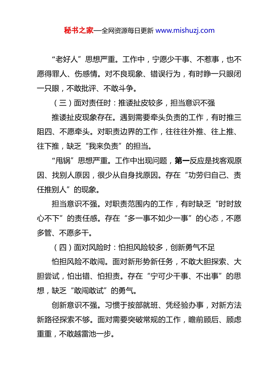 秘书之家—全网资源每日更新 www.mishuzj.com2026 政绩观学习教育查摆问题之畏难避责、斗争精神不强的问题 (一)面对困难时:畏难情绪较重,攻坚勇气不足遇难事往后缩。遇到复杂棘手的问题,第一反应是“这事不好办”“这事不该我管”,习惯往后缩、绕着走。缺乏“让我来”“我先上”的勇气和担当。啃硬骨头劲头不足。对历史遗留问题、复杂敏感问题,存在“等靠拖”思想,能拖就拖、能推就推。缺乏“敢啃硬骨头”的决心和韧劲,导致问题久拖不决。攻坚克难魄力不够。面对急难险重任务,有时瞻前顾后、顾虑重重,怕担风险、怕出问题。缺乏“明知山有虎、偏向虎山行”的魄力,工作推进不够有力。(二)面对矛盾时:回避绕行较多,较真碰硬不够遇到矛盾绕道走。工作中遇到矛盾冲突,不是积极面对、主动化解,而是能躲就躲、能绕就绕。缺乏直面矛盾的勇气,导致小事拖大、大事拖炸。较真碰硬不够。对原则性问题,有时不敢较真、不敢碰硬存在“和稀泥”现象。怕得罪人、怕伤和气,导致问题得不到有效解决。秘书之家—全网资源每日更新 www.mishuzj.com“老好人”思想严重。工作中,宁愿少干事、不惹事,也不愿得罪人、伤感情。对不良现象、错误行为,有时睁一只眼闭一只眼,不敢批评、不敢斗争。(三)面对责任时:推诿扯皮较多,担当意识不强推诿扯皮现象存在。遇到需要牵头负责的工作,有时推三阻四、不愿牵头。对职责边界的工作,往往往外推、往上推、往下推,缺乏“我来负责”的担当。“甩锅”思想严重。工作中出现问题,第一反应是找客观原因、找别人原因,很少从自身找原因。存在“功劳归自己、责任推别人”的现象。担当意识不强。对职责范围内的工作,有时缺乏“时时放心不下”的责任感。存在“多一事不如少一事”的心态,不愿多管、不愿多干。(四)面对风险时:怕担风险较多,创新勇气不足怕担风险不敢闯。面对新形势新任务,不敢大胆探索、大胆尝试,怕出错、怕担责。存在“宁可少干事、不出事”的思想,缺乏“敢闯敢试”的勇气。创新意识不强。习惯于按部就班、凭经验办事,对新方法新路径探索不够。面对需要突破常规的工作,瞻前顾后、顾虑重重,不敢越雷池一步。秘书之家—全网资源每日更新 www.mishuzj.com担当风险不够。对需要承担一定风险的工作,往往往后缩往外推,缺乏“功成不必在我、功成必定有我”的胸襟。(五)面对错误时:不敢批评较多,斗争精神不足批评与自我批评辣味不足。在组织生活会上,自我批评避重就轻、蜻蜓点水,不敢揭短亮丑。对同志批评时顾虑较多、辣味不足,怕影响关系。对不良现象不敢斗争。面对错误言论、不良风气,有时缺乏警惕性、不敢亮剑发声。存在“多一事不如少一事”的思想,缺乏斗争精神。对身边同志不敢批评。看到身边同志的问题,有时碍于情面不愿说、不敢说。存在“事不关己高高挂起”的思想,缺乏相互监督、共同进步的自觉。(六)面对困难群众时:怕麻烦较多,服务意识不强面对群众诉求怕麻烦。对群众反映的复杂问题,有时嫌麻烦、不愿管,能推就推、能拖就拖。缺乏“群众利益无小事”的意识。解决群众问题不够有力。对群众反映的问题,有时回应不够及时、解决不够彻底。存在“敷衍了事”“应付差事”的现象。深入基层不够主动。怕到矛盾多、问题多的地方去,怕群秘书之家—全网资源每日更新 www.mishuzj.com众找上门、怕问题缠上身。存在“坐在办公室听汇报多、深入基层解决实际问题少”的现象。(七)面对纪律时:怕得罪人较多,较真碰硬不够执行纪律不够严格。对违反纪律规矩的人和事,有时碍于情面不愿管、不敢管。存在“下不为例”“网开一面”的现象。较真碰硬不够。对需要严肃处理的问题,有时顾虑重重、不敢下手。怕得罪人、怕影响关系,导致纪律执行“宽松软”。监督提醒不够及时。对身边同志的苗头性、倾向性问题,提醒不够及时、批评不够到位。存在“睁一只眼闭一只眼”的现象。