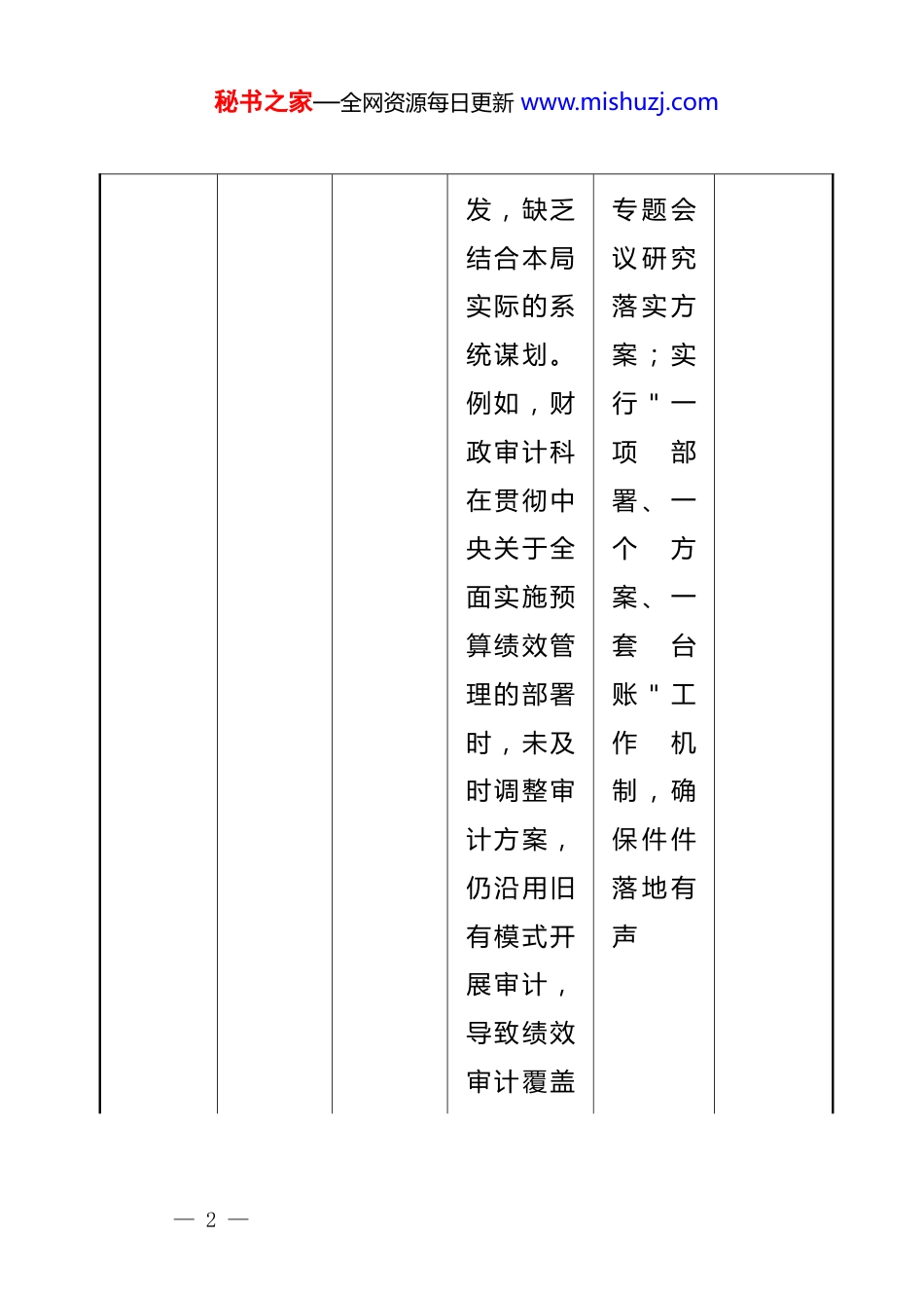 秘书之家—全网资源每日更新 www.mishuzj.com市审计局政绩观领导班子对照查摆清单序号方面查摆问题存 在差距与问题( 含事例与危害)整改措施整改时限1立党为公落实党的大政方针和党中央重大决策部署方面存在的差距和问题班 子对党中央关于深化审计体制改革的重大决策部署学习研究不够深入,有时满足于开会传达、文 件 转建立 重 大决 策 部署 专 题学 习 研究制度 , 每次 重 大部 署 出台 后 2周 内 召开 班 子1个月内建立机制,持续推进— 1 —秘书之家—全网资源每日更新 www.mishuzj.com发,缺乏结合本局实际的系统谋划。例如,财政审计科在贯彻中央关于全面实施预算绩效管理的部署时,未及时调整审计方案,仍沿用旧有模式开展审计,导致绩效审计覆盖专 题 会议 研 究落 实 方案 ; 实行 " 一项部署 、 一个方案 、 一套台账 " 工作机制 , 确保 件 件落 地 有声— 2 —秘书之家—全网资源每日更新 www.mishuzj.com面严重不足,被省审计厅年度工作考核扣分,影响了全局排名。2立党为公落实习近平总书记重要讲话和重要指示批示精神方面存在的差距和问题班 子成员对总书记关于审计工作重要论述的学习存在 碎 片化、浅层化问题,学用结合不紧密。例如,总将重 要 讲话 和 指示 批 示精 神 纳入 班 子理 论 学习 中 心组 年 度学 习 计划 , 每季 度 至即时整改,长期坚持— 3 —秘书之家—全网资源每日更新 www.mishuzj.com书 记 关于 " 审 计要做经济体 检 医生 " 的 重要论述出台后,经济责任审计科某干部在开展领导干部经济责任审计时,仍停留于查账目、看数字的传 统 模式,未能将"体少 开 展1 次 专题研讨 ; 建立 学 习成 果 转化清单 , 明确 每 次学 习 后形 成 的工 作 举措 及 责任人— 4 —秘书之家—全网资源每日更新 www.mishuzj.com检 " 理 念转化为系统 性 评价,导致审计报告深 度 不足,未能有效揭示被审计单位深层次管 理 问题,审计成果质量受到上级通 报 批评。3立党为公树立 " 全国一盘班 子在统筹安排审计项建立 审 计项 目 立2个月内明显改— 5 —秘书之家—全网资源每日更新 www.mishuzj.com棋 " 思想、服务从大局方面存在的差距和问题目时,有时只考虑本局工作量和人员安排,未能充分对接市委市政府中心工作。例如,市委重点部署的乡村振兴资金专项审计任务 下 达后,投资审 计 科以 " 人 员不足、任项 与 市委 市 政府 中 心工 作 对接机制 , 每年 度 审计 计 划须 经 班子 集 体对 标 市委 重 点部 署 ;将 服 务大 局 成效 纳 入班 子 年度考核 ; 定善— 6 —秘书之家—全网资源每日更新 www.mishuzj.com务繁重 " 为 由消 极 应对,未能按时完成审 计 任务,导致市委重点工作督查中审计支撑数据缺失,影响了全市乡村振兴工作的整体推进,被市政府办公室通报批评。期 与 市委 办 、市 政 府办 沟 通协 调 审计 工 作重点— 7 —秘书之家—全网资源每日更新 www.mishuzj.com4立党为公对照岗位职责履职方面存在的差距和问题班 子成员对分管领域的履职边界不 够 清晰,对重点审计项目的督导跟 进 不力 , 存在 " 签 字了事、放手不管 " 的 现象 。 例如,分管固定资产投资审计的副局长逐一 梳 理班 子 成员 岗 位职 责 清单 并 公示上墙 ; 建立 重 点审 计 项目 " 责任到人 " 台账 ; 每月 召 开1 次 班子 履 职情 况 碰头 会 ,1个月内完成职责清单梳理— 8 —秘书之家—全网资源每日更新 www.mishuzj.com对某重大基础设施项目审计跟 进 不力,相关科室审计进度严重滞后长达3 个 月 ,导致项目竣工结算审计报告未能及时出具,被审计单位借机突击变更工程量,造成国有资产对 超 期未 完 成的 审 计项 目 实行 挂 牌督办— 9 —秘书之家—全网资源每日更新 www.mishuzj.com潜在损失约 80 余万元。5立党为公党风廉政建设主体责任落实方面存在的差距和问...