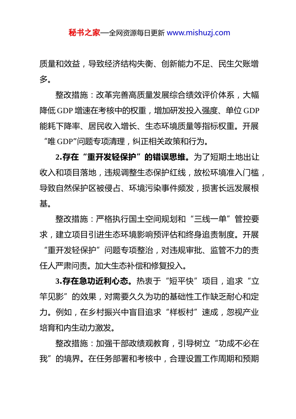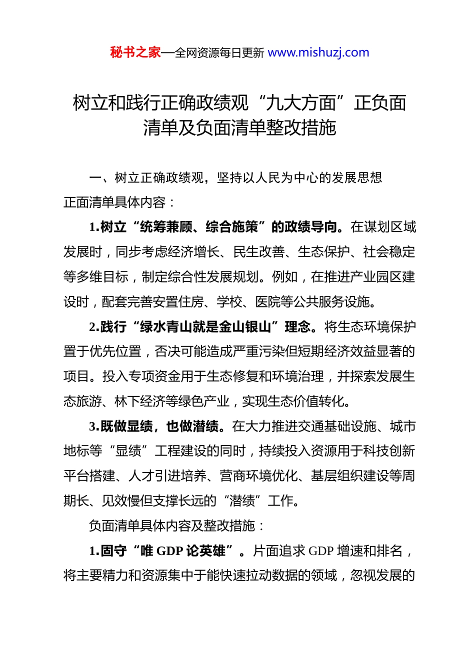 秘书之家—全网资源每日更新 www.mishuzj.com树立和践行正确政绩观“九大方面”正负面清单及负面清单整改措施 一、树立正确政绩观,坚持以人民为中心的发展思想正面清单具体内容:1.树立“统筹兼顾、综合施策”的政绩导向。在谋划区域发展时,同步考虑经济增长、民生改善、生态保护、社会稳定等多维目标,制定综合性发展规划。例如,在推进产业园区建设时,配套完善安置住房、学校、医院等公共服务设施。2.践行“绿水青山就是金山银山”理念。将生态环境保护置于优先位置,否决可能造成严重污染但短期经济效益显著的项目。投入专项资金用于生态修复和环境治理,并探索发展生态旅游、林下经济等绿色产业,实现生态价值转化。3.既做显绩,也做潜绩。在大力推进交通基础设施、城市地标等“显绩”工程建设的同时,持续投入资源用于科技创新平台搭建、人才引进培养、营商环境优化、基层组织建设等周期长、见效慢但支撑长远的“潜绩”工作。负面清单具体内容及整改措施:1.固守“唯 GDP 论英雄”。片面追求 GDP 增速和排名,将主要精力和资源集中于能快速拉动数据的领域,忽视发展的秘书之家—全网资源每日更新 www.mishuzj.com质量和效益,导致经济结构失衡、创新能力不足、民生欠账增多。整改措施:改革完善高质量发展综合绩效评价体系,大幅降低 GDP 增速在考核中的权重,增加研发投入强度、单位 GDP能耗下降率、居民收入增长、生态环境质量等指标权重。开展“唯 GDP”问题专项清理,纠正相关政策和行为。2.存在“重开发轻保护”的错误思维。为了短期土地出让收入和项目落地,违规调整生态保护红线,放松环境准入门槛,导致自然保护区被侵占、环境污染事件频发,损害长远发展根基。整改措施:严格执行国土空间规划和“三线一单”管控要求,建立项目引进生态环境影响预评估和终身追责制度。开展“重开发轻保护”问题专项整治,对违规审批、监管不力的责任人严肃问责。加大生态补偿和修复投入。3.存在急功近利心态。热衷于“短平快”项目,追求“立竿见影”的效果,对需要久久为功的基础性工作缺乏耐心和定力。例如,在乡村振兴中盲目追求“样板村”速成,忽视产业培育和内生动力激发。整改措施:加强干部政绩观教育,引导树立“功成不必在我”的境界。在任务部署和考核中,合理设置工作周期和预期秘书之家—全网资源每日更新 www.mishuzj.com目标,对长期性、基础性工作给予持续稳定的政策支持。建立重大决策和项目“回头看”机制,评估长期效益。二、坚持实事求是,作出符合实际、遵循规律的科学决策正面清单具体内容:1.坚持实事求是、因地制宜。在制定产业发展政策时,深入调研本地资源禀赋、产业基础和市场条件,确定主导产业和特色产业,不盲目跟风引进不适合本地实际的“高大上”项目。2.强化系统思维。规划城市新区建设时,统筹考虑产业布局、居住配套、交通组织、生态空间、地下管网等要素,进行系统性设计,避免功能割裂和重复建设。3.坚持“从群众中来、到群众中去”。在推进老旧小区改造前,通过召开居民议事会、发放调查问卷、入户访谈等方式,广泛征求居民对改造内容、方案设计的意见和建议,确保改造符合群众需求。负面清单具体内容及整改措施:1.脱离实际盲目决策。不顾地方财政承受能力和市场需求,盲目举债上马大型景观工程、超前基础设施项目,导致项目建成后利用率低、运营维护成本高昂,形成沉重债务包袱。整改措施:健全重大项目决策咨询和风险评估机制,所有重大项目必须经过严格的可行性研究、财政承受能力评估和合秘书之家—全网资源每日更新 www.mishuzj.com规性审查。实行决策终身责任追究制度,对因盲目决策造成重大损失的责任人依法依规问责。2.决策碎片化、朝令夕改。缺乏长远规划和稳定预期,不同时期领导提出的发展思路和重点频繁变动,导致政策缺乏连续性,基层无所适从,企业投资信心受损。整改措施:强化规划的战略引领和刚性约束作用,经法定程序批准的规划不得随意修改。建立重大决策事项清单管理制度,规范决策程序。保持主要政策的稳定性和连续性,确需调整的要充分论证、做好衔接。3.凭主观臆断“拍板”决策。不经过深入调研和科...