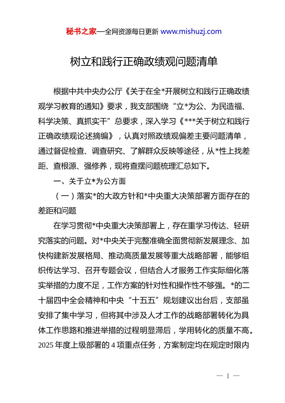 秘书之家—全网资源每日更新 www.mishuzj.com树立和践行正确政绩观问题清单根据中共中央办公厅《关于在全*开展树立和践行正确政绩观学习教育的通知》要求,我支部围绕“立*为公、为民造福、科学决策、真抓实干”总要求,深入学习《***关于树立和践行正确政绩观论述摘编》,认真对照政绩观偏差主要问题清单,通过督促检查、调查研究、了解群众反映等途径,从*性上找差距、查根源、强修养,现将查摆问题梳理汇总如下。一、关于立*为公方面(一)落实*的大政方针和*中央重大决策部署方面存在的差距和问题在学习贯彻*中央重大决策部署上,存在重学习传达、轻研究落实的问题。对*中央关于完整准确全面贯彻新发展理念、加快构建新发展格局、推动高质量发展等重大战略部署,能够组织传达学习、召开专题会议,但结合人才服务工作实际细化落实举措的力度不足,工作方案的针对性和操作性不够强。*的二十届四中全会精神和中央“十五五”规划建议出台后,支部虽安排了集中学习,但将其中涉及人才工作的战略部署转化为具体工作思路和推进举措的过程明显滞后,学用转化的质量不高。2025 年度上级部署的 4 项重点任务,方案制定均在规定时限内— 1 —秘书之家—全网资源每日更新 www.mishuzj.com完成,但在实质推进深度和工作质量上与部署要求存在差距,部分任务仍停留于完成规定动作层面,未能结合本地实际进行创造性落实,工作缺乏应有的力度和成效。(二)落实******重要讲话和****批示精神方面存在的差距和问题对******关于树立和践行正确政绩观系列重要论述的学习,存在碎片化、浅层化的问题。《***关于树立和践行正确政绩观论述摘编》出版后,支部安排了集体学习,但精读精研不够,专题研讨的深度和频次不足,对其中核心要义和内在逻辑的把握不够系统深入。对******关于人才工作的重要论述,在理解上存在片段化倾向,未能做到原原本本、融会贯通地掌握,在日常决策和业务推进中的指引作用发挥不够充分。对******关于“政绩为谁而树、树什么样的政绩、靠什么树政绩”的重要论断,理解停留于字面,未能结合具体岗位职责深化认识,将重要讲话精神转化为推动工作的自觉行动还有明显差距。(三)树立“全国一盘棋”思想、服务服从大局方面存在的差距和问题在服从服务大局上,全局意识和统筹协调能力有待增强。习惯于在本单位职责范围内谋划工作,对跨部门、跨层级、跨区域协同合作的主动性和积极性不足,在参与上级统筹部署的— 2 —秘书之家—全网资源每日更新 www.mishuzj.com跨系统工作中,倾向于先考量本部门工作负担和局部利益,主动补位、主动担责的意识不够强。在推进辖区招商引资和人才引进工作中,与邻近县区之间信息壁垒依然存在,协同联动机制不健全,招商政策同质化竞争问题突出,未能形成错位发展、优势互补的区域合力。在贯彻上级统一部署时,存在选择性执行的倾向,对有利于本单位的政策执行积极,对需要本单位做出牺牲和让步的要求,则寻找理由打折扣,服务服从大局的政治自觉有待切实提升。(四)对照岗位职责履职方面存在的差距和问题对岗位职责的认知和履行存在固化倾向,重完成交办任务轻主动开拓创新,日常事务性工作处理较为熟练,但主动研究新情况、谋划新思路、推动工作提质升级的内生动力不足。支部班子成员对各自分管业务的政策依据、行业规律和前沿动态掌握不够全面深入,在面对新形势新要求时,调整工作思路和创新工作方法的能力有待提升。在推进“十五五”开局之年各项重点工作中,对于新赋予的职责和新拓展的业务领域,存在畏难情绪和等靠观望心态,主动谋划、积极作为的精神状态不够饱满。2025 年度绩效考核中,支部在主动履职、改革创新等加分指标上的得分低于全市系统平均水平约 11 个百分点,一定程度上反映出主动担当不足的深层问题。— 3 —秘书之家—全网资源每日更新 www.mishuzj.com二、关于为民造福方面(一)坚持人民至上、践行全心全意为人民服务宗旨方面存在的差距和问题人民至上理念在工作实践中的落地落实不够充分,口号多于行动、表态多于举措的问题客观存在。部分业务流程和工作制度的设计,更多从便于管理、便于考核的角度出发...