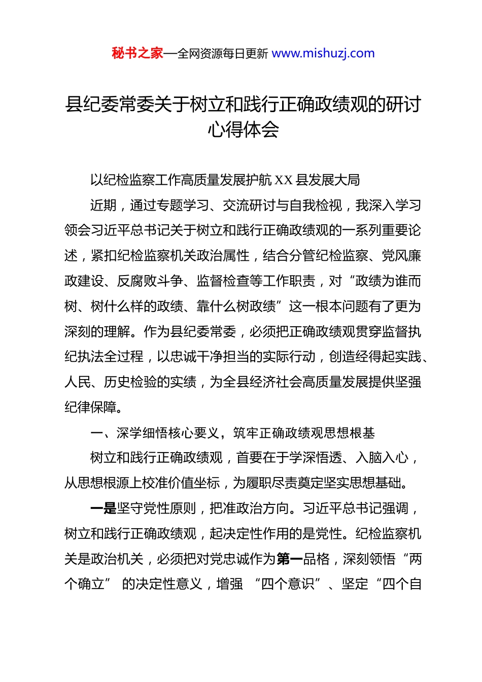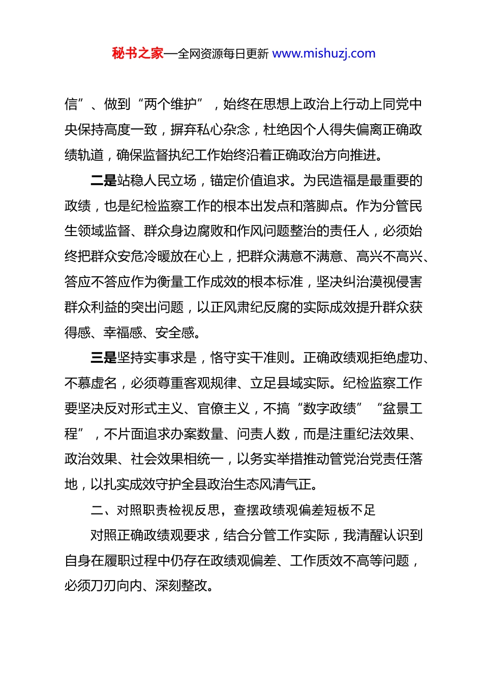 秘书之家—全网资源每日更新 www.mishuzj.com县纪委常委关于树立和践行正确政绩观的研讨心得体会 以纪检监察工作高质量发展护航 XX 县发展大局近期,通过专题学习、交流研讨与自我检视,我深入学习领会习近平总书记关于树立和践行正确政绩观的一系列重要论述,紧扣纪检监察机关政治属性,结合分管纪检监察、党风廉政建设、反腐败斗争、监督检查等工作职责,对“政绩为谁而树、树什么样的政绩、靠什么树政绩”这一根本问题有了更为深刻的理解。作为县纪委常委,必须把正确政绩观贯穿监督执纪执法全过程,以忠诚干净担当的实际行动,创造经得起实践、人民、历史检验的实绩,为全县经济社会高质量发展提供坚强纪律保障。一、深学细悟核心要义,筑牢正确政绩观思想根基树立和践行正确政绩观,首要在于学深悟透、入脑入心,从思想根源上校准价值坐标,为履职尽责奠定坚实思想基础。一是坚守党性原则,把准政治方向。习近平总书记强调,树立和践行正确政绩观,起决定性作用的是党性。纪检监察机关是政治机关,必须把对党忠诚作为第一品格,深刻领悟“两个确立” 的决定性意义,增强 “四个意识”、坚定“四个自秘书之家—全网资源每日更新 www.mishuzj.com信”、做到“两个维护”,始终在思想上政治上行动上同党中央保持高度一致,摒弃私心杂念,杜绝因个人得失偏离正确政绩轨道,确保监督执纪工作始终沿着正确政治方向推进。二是站稳人民立场,锚定价值追求。为民造福是最重要的政绩,也是纪检监察工作的根本出发点和落脚点。作为分管民生领域监督、群众身边腐败和作风问题整治的责任人,必须始终把群众安危冷暖放在心上,把群众满意不满意、高兴不高兴、答应不答应作为衡量工作成效的根本标准,坚决纠治漠视侵害群众利益的突出问题,以正风肃纪反腐的实际成效提升群众获得感、幸福感、安全感。三是坚持实事求是,恪守实干准则。正确政绩观拒绝虚功、不慕虚名,必须尊重客观规律、立足县域实际。纪检监察工作要坚决反对形式主义、官僚主义,不搞“数字政绩”“盆景工程”,不片面追求办案数量、问责人数,而是注重纪法效果、政治效果、社会效果相统一,以务实举措推动管党治党责任落地,以扎实成效守护全县政治生态风清气正。二、对照职责检视反思,查摆政绩观偏差短板不足对照正确政绩观要求,结合分管工作实际,我清醒认识到自身在履职过程中仍存在政绩观偏差、工作质效不高等问题,必须刀刃向内、深刻整改。秘书之家—全网资源每日更新 www.mishuzj.com一是监督执纪存在重数量轻质效的倾向。在查办违纪违法案件中,有时过于关注案件数量、处分层级等显性指标,对案件查办“后半篇文章”重视不足,以案促改、以案促治、以案促建不够深入,未能充分发挥查处一案、警示一片、治理一域的综合效应,存在重惩治轻治理的片面政绩观。二是党风廉政建设存在重部署轻落实的问题。在推进党风廉政建设责任制落实、开展廉政教育、作风建设等工作中,有时满足于开会部署、发文安排,对基层落实情况跟踪问效不够,督导检查浮于表面,对苗头性、倾向性问题发现不及时、处置不坚决,存在重形式轻实效、重过程轻结果的短板。三是反腐败斗争存在重治标轻治本的短板。在推进反腐败工作中,对显性腐败问题查处力度较大,但对新型腐败、隐性腐败的研判不足,对权力运行关键环节的廉政风险防控抓得不紧,制度建设、源头治理跟进滞后,未能完全构建起不敢腐、不能腐、不想腐一体推进的闭环体系,治标与治本衔接不够顺畅。四是监督检查存在重程序轻实效的现象。在开展专项监督、日常监督检查工作中,有时过于注重流程规范、资料完备,对监督发现问题的整改落实、长效治理盯得不牢,存在“监督一阵风、整改走过场”的情况,未能真正以监督推动工作落实、秘书之家—全网资源每日更新 www.mishuzj.com破解发展难题,监督保障执行、促进完善发展作用发挥不充分。三、立足主责主业履职,以实干践行正确政绩观作为分管纪检监察相关工作的常委,必须紧扣职责使命,把正确政绩观转化为监督执纪、正风反腐的具体行动,以高质量纪检监察工作服务保障全县发展大局。一是聚焦政治监督,以护航发展彰显政绩。紧紧围...