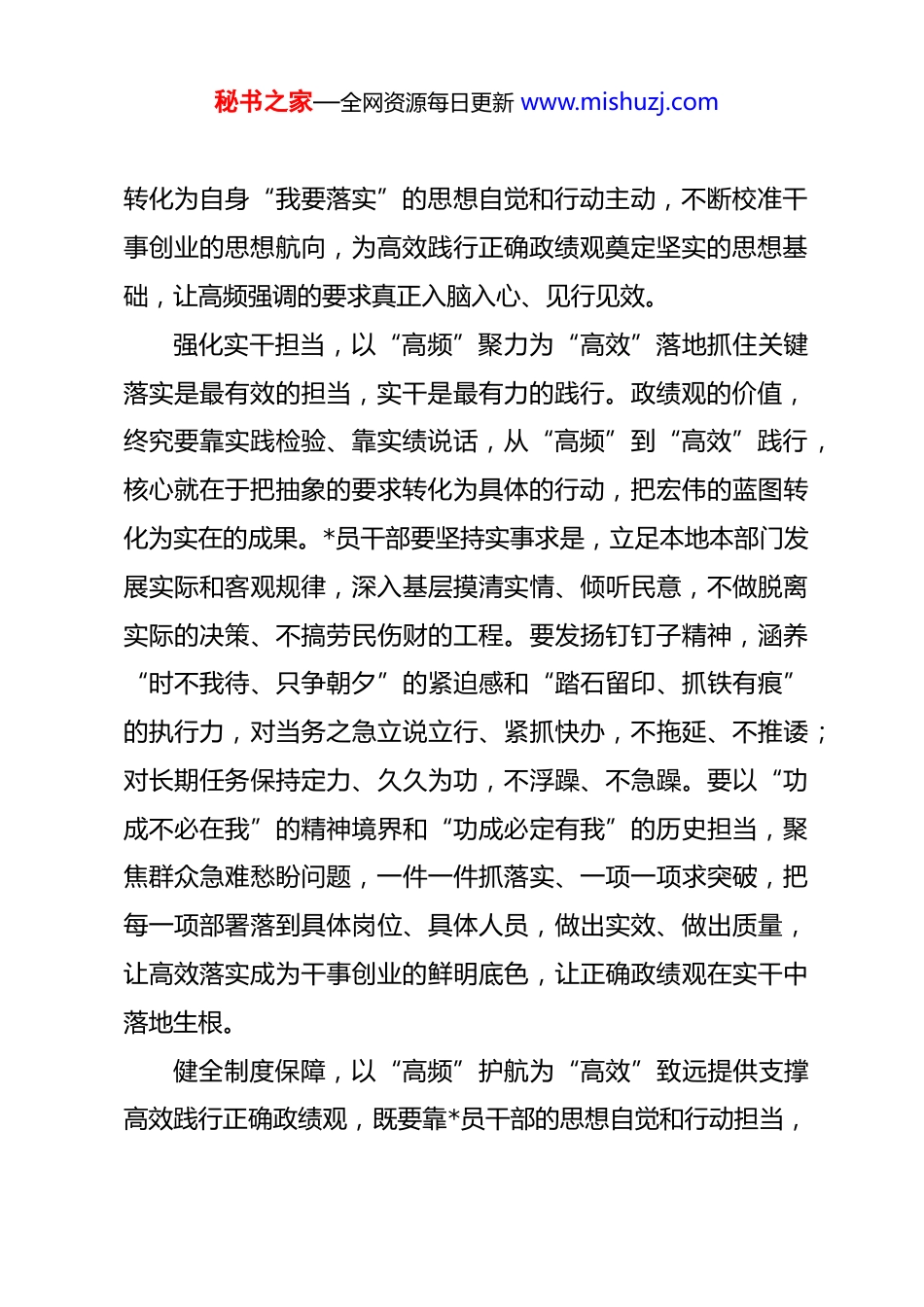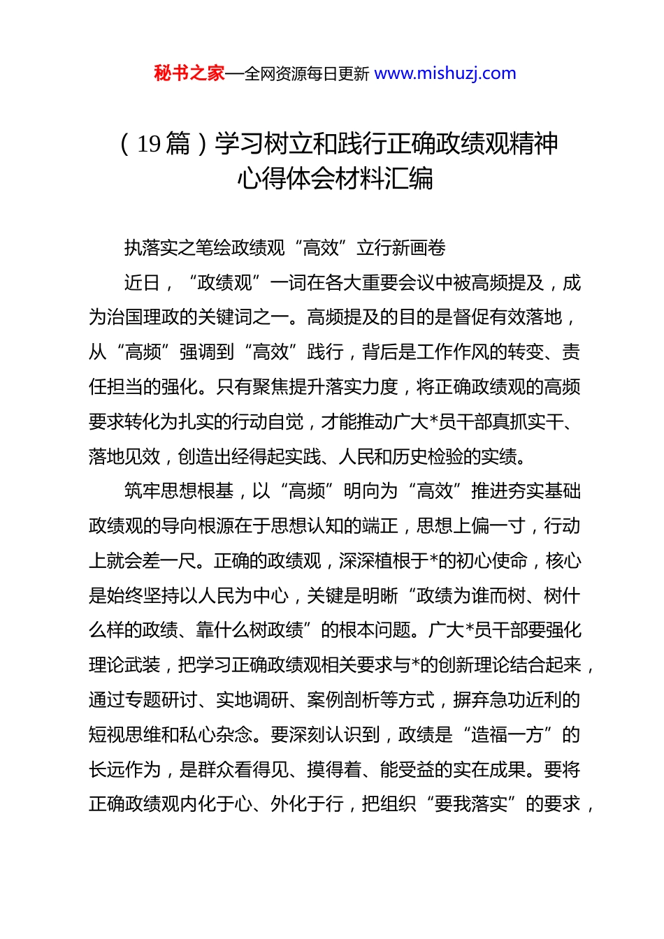 秘书之家—全网资源每日更新 www.mishuzj.com(19 篇)学习树立和践行正确政绩观精神心得体会材料汇编执落实之笔绘政绩观“高效”立行新画卷近日,“政绩观”一词在各大重要会议中被高频提及,成为治国理政的关键词之一。高频提及的目的是督促有效落地,从“高频”强调到“高效”践行,背后是工作作风的转变、责任担当的强化。只有聚焦提升落实力度,将正确政绩观的高频要求转化为扎实的行动自觉,才能推动广大*员干部真抓实干、落地见效,创造出经得起实践、人民和历史检验的实绩。筑牢思想根基,以“高频”明向为“高效”推进夯实基础政绩观的导向根源在于思想认知的端正,思想上偏一寸,行动上就会差一尺。正确的政绩观,深深植根于*的初心使命,核心是始终坚持以人民为中心,关键是明晰“政绩为谁而树、树什么样的政绩、靠什么树政绩”的根本问题。广大*员干部要强化理论武装,把学习正确政绩观相关要求与*的创新理论结合起来,通过专题研讨、实地调研、案例剖析等方式,摒弃急功近利的短视思维和私心杂念。要深刻认识到,政绩是“造福一方”的长远作为,是群众看得见、摸得着、能受益的实在成果。要将正确政绩观内化于心、外化于行,把组织“要我落实”的要求,秘书之家—全网资源每日更新 www.mishuzj.com转化为自身“我要落实”的思想自觉和行动主动,不断校准干事创业的思想航向,为高效践行正确政绩观奠定坚实的思想基础,让高频强调的要求真正入脑入心、见行见效。强化实干担当,以“高频”聚力为“高效”落地抓住关键落实是最有效的担当,实干是最有力的践行。政绩观的价值,终究要靠实践检验、靠实绩说话,从“高频”到“高效”践行,核心就在于把抽象的要求转化为具体的行动,把宏伟的蓝图转化为实在的成果。*员干部要坚持实事求是,立足本地本部门发展实际和客观规律,深入基层摸清实情、倾听民意,不做脱离实际的决策、不搞劳民伤财的工程。要发扬钉钉子精神,涵养“时不我待、只争朝夕”的紧迫感和“踏石留印、抓铁有痕”的执行力,对当务之急立说立行、紧抓快办,不拖延、不推诿;对长期任务保持定力、久久为功,不浮躁、不急躁。要以“功成不必在我”的精神境界和“功成必定有我”的历史担当,聚焦群众急难愁盼问题,一件一件抓落实、一项一项求突破,把每一项部署落到具体岗位、具体人员,做出实效、做出质量,让高效落实成为干事创业的鲜明底色,让正确政绩观在实干中落地生根。健全制度保障,以“高频”护航为“高效”致远提供支撑高效践行正确政绩观,既要靠*员干部的思想自觉和行动担当,秘书之家—全网资源每日更新 www.mishuzj.com更要靠制度约束和机制激励,让“落实”有章可循、有规可依。要完善政绩考核评价体系,将民生改善、生态保护、风险防控、长远发展、群众满意度等纳入核心考核内容,精准设置关键性、引领性指标,实行差异化考核,让干实事、求实效的干部脱颖而出。要强化监督刚性约束,把政绩观落实情况纳入日常监督、专项检查、巡视巡察范畴,及时发现和纠治形式主义、官僚主义等突出问题,对不作为、慢作为、乱作为行为做到早发现、早处置、早纠正,推动*员干部积极履职尽责、担当作为。同时,健全容错纠错机制,为敢于实干、勇于担当的*员干部撑腰鼓劲,营造“人人重落实、事事求高效”的良好氛围,让正确政绩观在制度保障下,真正实现从“高频提及”到“高效践行”的常态化、长效化。加强政绩观教育助推“十五五”高质量发展全国组织部长会议 1 月 15 日在京召开,**在会议上强调要“树立和践行正确政绩观,加强正确政绩观教育”。2026 年是“十五五”开局之年,开局关乎全局,起步决定后势。加强正确政绩观教育,正是开好局、起好步的重要保障,必须以系统性、持续性、针对性的务实举措常抓不懈,切实校准广大*员干部的思想刻度与行动坐标。以思想清醒把准“为谁创造政绩”的根本方向。思想是行秘书之家—全网资源每日更新 www.mishuzj.com动的先导,理论是实践的指南。加强政绩观教育必须引导*员干部解决好为谁创造业绩、创造什么样的业绩、怎样创造业绩的问题。******强调,“共产*人必须牢记,为民造福是最大政绩。”这一重...