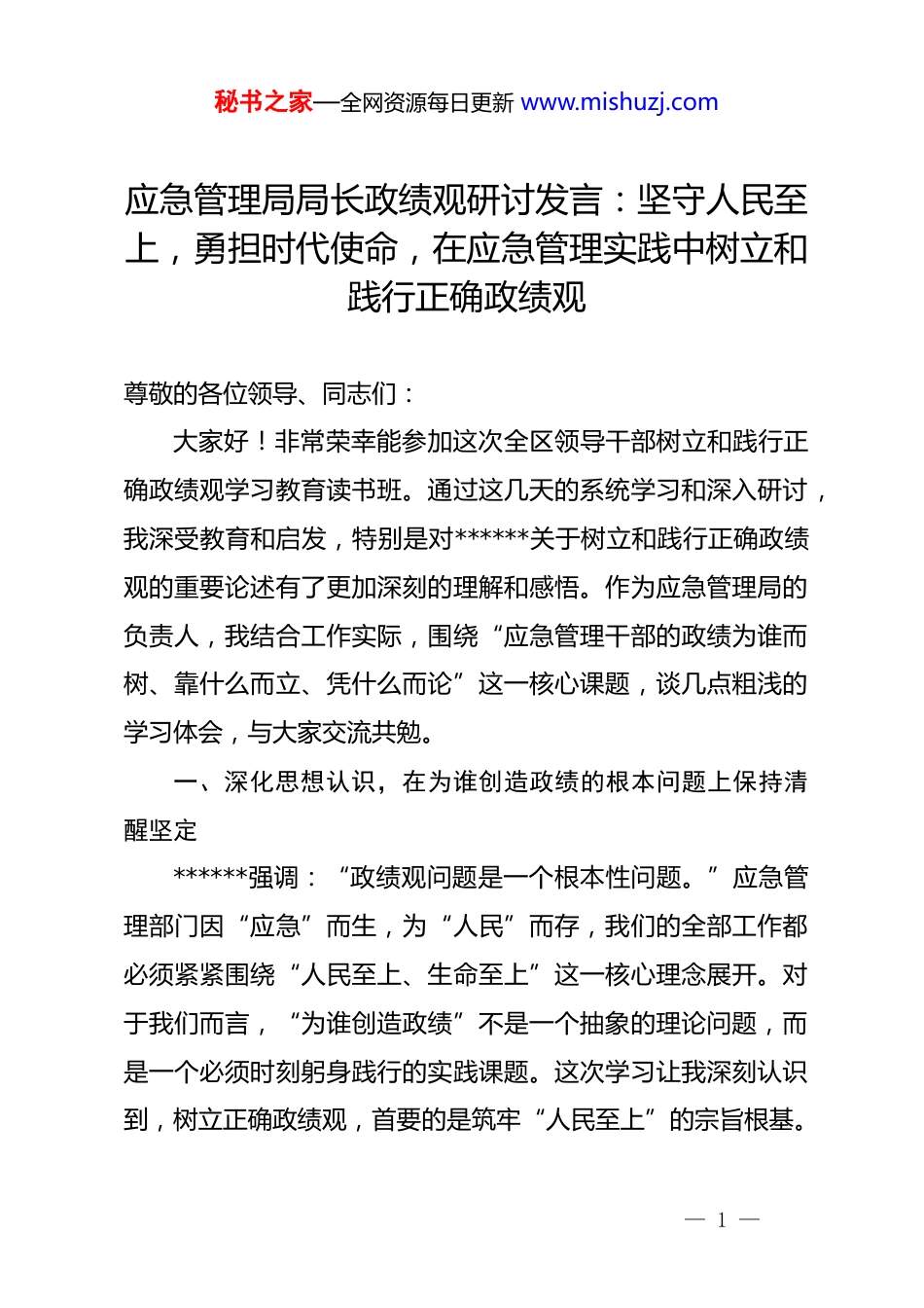 秘书之家—全网资源每日更新 www.mishuzj.com应急管理局局长政绩观研讨发言:坚守人民至上,勇担时代使命,在应急管理实践中树立和践行正确政绩观尊敬的各位领导、同志们:大家好!非常荣幸能参加这次全区领导干部树立和践行正确政绩观学习教育读书班。通过这几天的系统学习和深入研讨,我深受教育和启发,特别是对******关于树立和践行正确政绩观的重要论述有了更加深刻的理解和感悟。作为应急管理局的负责人,我结合工作实际,围绕“应急管理干部的政绩为谁而树、靠什么而立、凭什么而论”这一核心课题,谈几点粗浅的学习体会,与大家交流共勉。一、深化思想认识,在为谁创造政绩的根本问题上保持清醒坚定******强调:“政绩观问题是一个根本性问题。”应急管理部门因“应急”而生,为“人民”而存,我们的全部工作都必须紧紧围绕“人民至上、生命至上”这一核心理念展开。对于我们而言,“为谁创造政绩”不是一个抽象的理论问题,而是一个必须时刻躬身践行的实践课题。这次学习让我深刻认识到,树立正确政绩观,首要的是筑牢“人民至上”的宗旨根基。— 1 —秘书之家—全网资源每日更新 www.mishuzj.com(一)深刻领悟政绩的人民性,始终将保护人民生命财产安全作为最高准则应急管理工作的特殊性决定了我们的政绩,最直接、最核心的体现就是人民群众的获得感、幸福感、安全感。安全是1,其他都是后面的 0。如果安全这个 1 倒下了,再多的发展成果也可能付诸东流。这就要求我们必须从思想深处破除“唯gdp 论”的惯性思维,坚决摒弃任何以牺牲人民群众生命财产安全为代价换取一时一地经济增长的错误观念。在日常工作中,我们要时常反思:安全生产的每一次执法检查、防灾减灾的每一次预警发布、应急救援的每一次出动,是否都真正把人民的安危放在了第一位?是否把工作落脚点放在了解决群众最关心、最直接、最现实的安全问题上?只有始终与人民群众站在一起、想在一起、干在一起,我们的工作才能获得最广泛的支持,我们创造的政绩才能真正得到人民的认可。(二)准确把握政绩的全局性,自觉将应急管理工作融入经济社会发展大局正确的政绩观,必然是全面、协调、可持续的。应急管理工作不是孤立的,安全与发展的关系密不可分,两者相辅相成、辩证统一。一个地方如果安全事故频发,不仅会造成巨大的人员和财产损失,更会严重影响发展环境和区域形象。因此,我— 2 —秘书之家—全网资源每日更新 www.mishuzj.com们创造的政绩,不能仅仅局限于应急管理部门的“一亩三分地”,而应是服务于全区高质量发展大局的“安全屏障”。这就要求我们必须具备全局视野和系统思维,在谋划工作时,既要立足当前抓好风险防范,又要着眼长远服务发展大局。例如,在服务重点项目建设时,我们要主动靠前,提供专业的安全指导,帮助企业从源头上消除隐患,而不是简单地“一罚了之”。通过创造本质安全的环境,为全区招商引资、项目落地、产业升级提供坚实保障,这本身就是应急管理部门为大局作出的重要政绩。(三)清醒认识政绩的检验标准,坚持把群众满意度作为最终评判标尺政绩好不好,不能只看开了多少会、发了多少文件,更不能只凭我们自己的感觉,最终要由人民群众来评判。应急管理工作与群众生活息息相关,群众对安全的需求是具体而现实的。比如,老旧小区的消防通道是否畅通,沿街商铺的燃气使用是否安全,汛期来临时低注地带的群众能否及时转移。这些看似琐碎的“小事”,恰恰是群众最关心的“大事”,也是检验我们工作成效的“试金石”。因此,我们必须坚持问题导向,经常深入基层、深入一线,倾听群众的呼声,了解群众的期盼,精准对接群众在安全领域的急难愁盼问题,用心用情用力解决— 3 —秘书之家—全网资源每日更新 www.mishuzj.com好他们身边的安全隐患,让群众在日常生活中感受到实实在在的安全,这才是最有温度、最有价值的政绩。二、锤炼坚强*性,在靠什么创造政绩的基本问题上做到知行合一******指出:“树立和践行正确政绩观,起决定性作用的是*性。”应急管理工作充满风险与挑战,面对的往往是急事、难事、险事,没有坚强的*性作支撑,就不可能创造出经得起实践、人民...