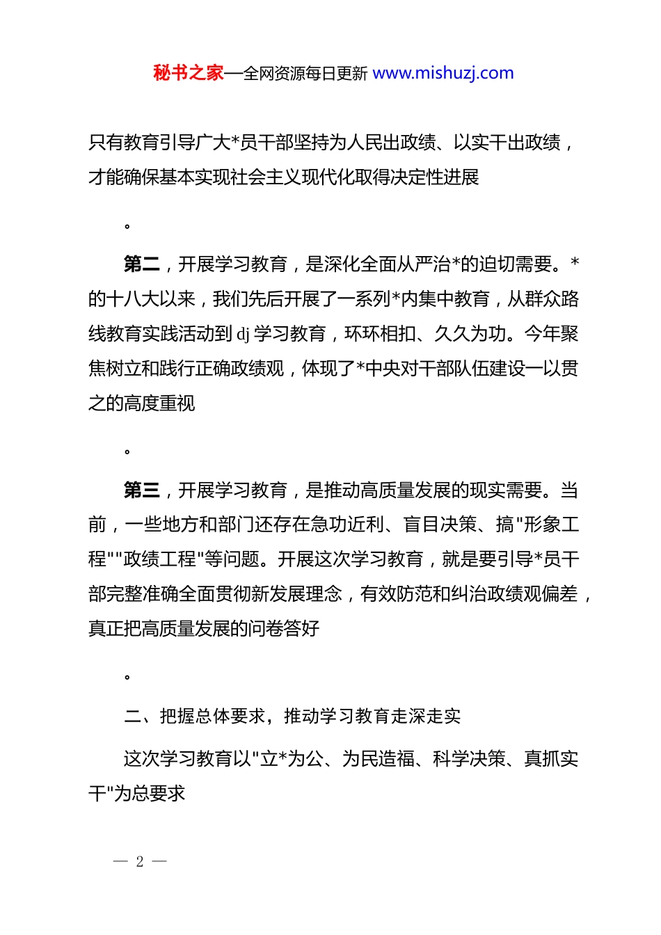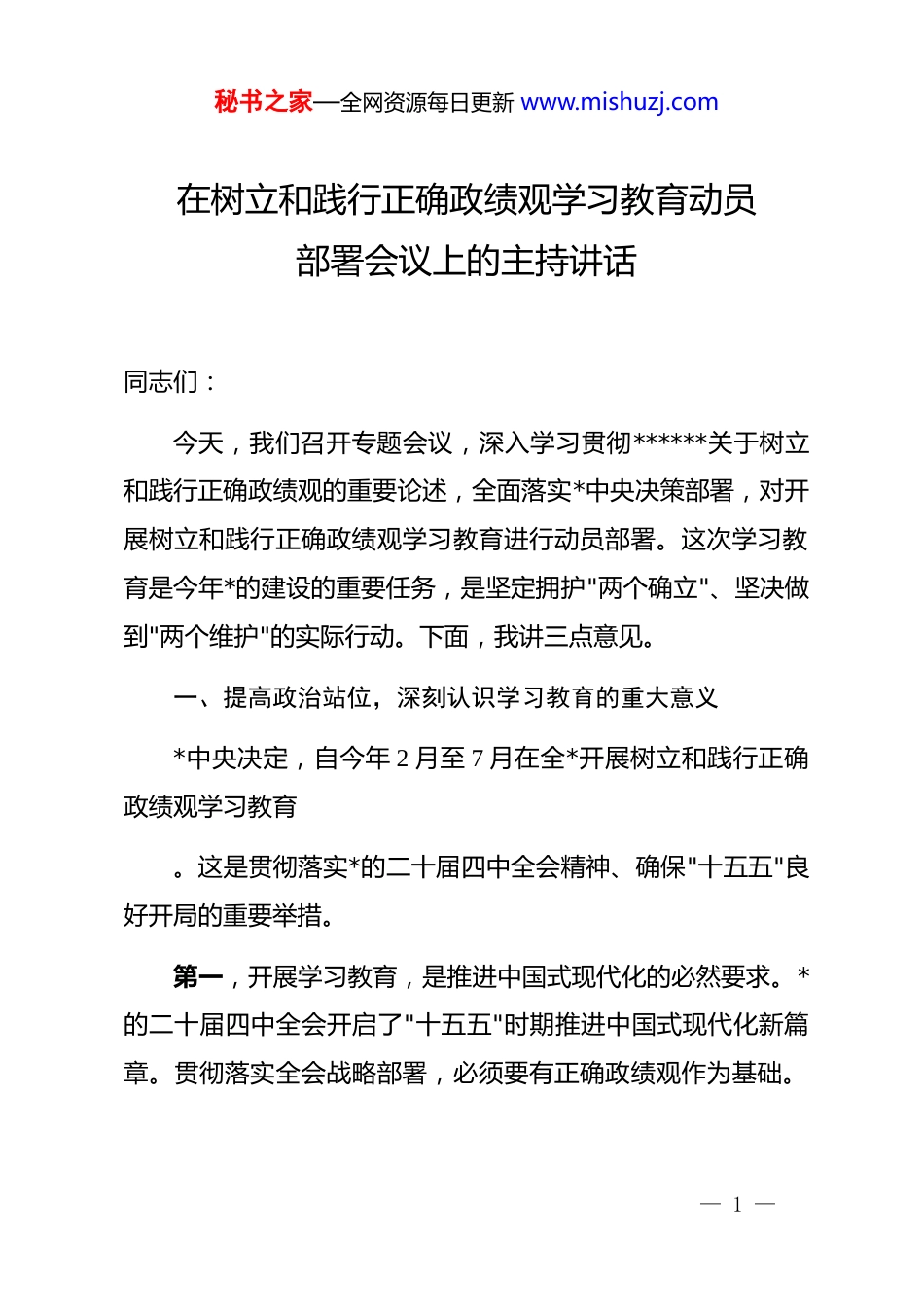 秘书之家—全网资源每日更新 www.mishuzj.com在树立和践行正确政绩观学习教育动员部署会议上的主持讲话同志们:今天,我们召开专题会议,深入学习贯彻******关于树立和践行正确政绩观的重要论述,全面落实*中央决策部署,对开展树立和践行正确政绩观学习教育进行动员部署。这次学习教育是今年*的建设的重要任务,是坚定拥护"两个确立"、坚决做到"两个维护"的实际行动。下面,我讲三点意见。一、提高政治站位,深刻认识学习教育的重大意义*中央决定,自今年 2 月至 7 月在全*开展树立和践行正确政绩观学习教育。这是贯彻落实*的二十届四中全会精神、确保"十五五"良好开局的重要举措。第一,开展学习教育,是推进中国式现代化的必然要求。*的二十届四中全会开启了"十五五"时期推进中国式现代化新篇章。贯彻落实全会战略部署,必须要有正确政绩观作为基础。— 1 —秘书之家—全网资源每日更新 www.mishuzj.com只有教育引导广大*员干部坚持为人民出政绩、以实干出政绩,才能确保基本实现社会主义现代化取得决定性进展。第二,开展学习教育,是深化全面从严治*的迫切需要。*的十八大以来,我们先后开展了一系列*内集中教育,从群众路线教育实践活动到 dj 学习教育,环环相扣、久久为功。今年聚焦树立和践行正确政绩观,体现了*中央对干部队伍建设一以贯之的高度重视。第三,开展学习教育,是推动高质量发展的现实需要。当前,一些地方和部门还存在急功近利、盲目决策、搞"形象工程""政绩工程"等问题。开展这次学习教育,就是要引导*员干部完整准确全面贯彻新发展理念,有效防范和纠治政绩观偏差,真正把高质量发展的问卷答好。二、把握总体要求,推动学习教育走深走实这次学习教育以"立*为公、为民造福、科学决策、真抓实干"为总要求— 2 —秘书之家—全网资源每日更新 www.mishuzj.com,坚持聚焦主题、简约务实,不分批次、不划阶段。我们要认真落实学习研讨、查摆问题、整改整治、建章立制、开门教育等工作安排。(一)在"深学"上下功夫,筑牢思想根基要深入学习******关于树立和践行正确政绩观的重要论述,深入学习《中共中央关于制定国民经济和社会发展第十五个五年规划的建议》,深入学习******关于本地区本部门本领域的重要讲话和****精神。通过理论学习中心组学习、专题读书班、"三会一课"等形式,做到知其言更知其义、知其然更知其所以然,进一步强化立*为公、为民造福理念。(二)在"真查"上下功夫,找准问题症结县处级以上领导班子及其成员要通过督促检查、调查研究了解群众反映等途径,深入查找政绩观方面存在的问题。要从*性上找差距、查根源、强修养,重点查摆是否存— 3 —秘书之家—全网资源每日更新 www.mishuzj.com在"新官不理旧账"、搞"形象工程""政绩工程"、统计造假等问题。要坚持把自己摆进去、把职责摆进去、把工作摆进去,真正做到见人见事见思想。(三)在"严改"上下功夫,确保整改实效要坚持与中央巡视整改、深入贯彻中央八项规定精神学习教育整改、"十五五"规划编制实施等相结合,边查边改、立行立改。对突出问题开展集中整治,持续推动整改落实。要从思想上改起,破除私心杂念;从作风上改起,反对形式主义、官僚主义;从制度上改起,深入查找现行制度机制中不符合正确政绩观要求的规定,该废止的废止,该修订的修订。(四)在"开门"上下功夫,接受群众监督要坚持开门教育,查摆问题听取群众意见,整改整治接受群众监督,检验成效接受群众评判。坚持民生为大,聚焦人民群众最关心最直接最现实的利— 4 —秘书之家—全网资源每日更新 www.mishuzj.com益问题,采取更多可感可及的具体举措,让群众看到变化、得到实惠。三、强化组织领导,确保学习教育取得实效一要压实主体责任。各级*委(*组)要把开展学习教育作为重要政治任务,精心组织实施。*委(*组)主要负责同志要履行好第一责任人责任,以身作则、以上率下,推动学习教育层层传导压力、逐级压实责任,一贯到底落实。二要坚持分类指导。结合不同层级、地区、领域、行业实际,加强分类指导,防止"一刀切"。要力戒形式主义,坚决防止以会议落实会议、以文件落实文件,确保学习教育不空...