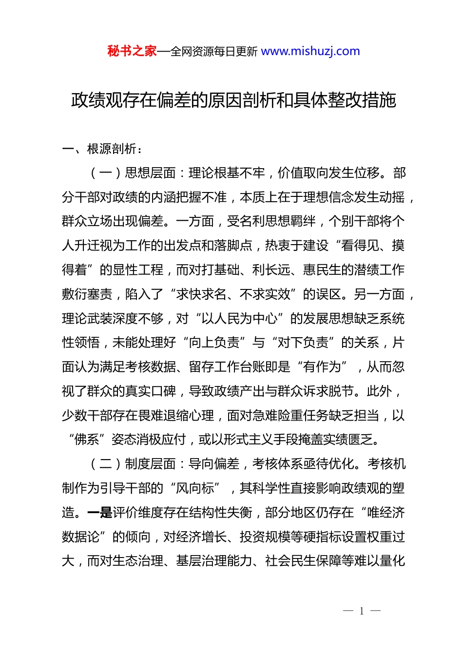 秘书之家—全网资源每日更新 www.mishuzj.com政绩观存在偏差的原因剖析和具体整改措施一、根源剖析:(一)思想层面:理论根基不牢,价值取向发生位移。部分干部对政绩的内涵把握不准,本质上在于理想信念发生动摇,群众立场出现偏差。一方面,受名利思想羁绊,个别干部将个人升迁视为工作的出发点和落脚点,热衷于建设“看得见、摸得着”的显性工程,而对打基础、利长远、惠民生的潜绩工作敷衍塞责,陷入了“求快求名、不求实效”的误区。另一方面,理论武装深度不够,对“以人民为中心”的发展思想缺乏系统性领悟,未能处理好“向上负责”与“对下负责”的关系,片面认为满足考核数据、留存工作台账即是“有作为”,从而忽视了群众的真实口碑,导致政绩产出与群众诉求脱节。此外,少数干部存在畏难退缩心理,面对急难险重任务缺乏担当,以“佛系”姿态消极应付,或以形式主义手段掩盖实绩匮乏。(二)制度层面:导向偏差,考核体系亟待优化。考核机制作为引导干部的“风向标”,其科学性直接影响政绩观的塑造。一是评价维度存在结构性失衡,部分地区仍存在“唯经济数据论”的倾向,对经济增长、投资规模等硬指标设置权重过大,而对生态治理、基层治理能力、社会民生保障等难以量化— 1 —秘书之家—全网资源每日更新 www.mishuzj.com的软指标考察不深,倒逼干部将精力向“高分赛道”集结。二是核查手段滞后,往往依赖材料汇编、工作日志或走马观花式的现场调研,缺乏对真实成效的穿透式监管,容易让“文字政绩”蒙混过关。三是激励约束效力不足,考核结果与职务晋升、奖惩机制的挂钩力度不够紧密,导致干好干坏一个样,既无法对实干者形成有效激励,也难以对虚夸者形成震慑。(三)环境层面:风气侵蚀,外部压力传导失真。政治生态与单位风气是影响干部行为选择的重要土壤。从外部环境看,部分区域存在盲目攀比、“相互较劲”的浮躁风气,过度追求规模效应与表面形象,这种不良竞争给基层带来了沉重的层级压力,诱导干部违规决策以迎合“上级胃口”。从内部氛围看,个别单位盛行“包装文化”,善于总结辞藻、堆砌材料的干部更容易获得青睐,而默默耕耘、注重长期效益的干部却处于边缘化,这种失衡的评价生态导致功利主义蔓延。同时,沟通反馈渠道不畅,部分决策指令脱离实情,下级为完成“不可能的任务”只能采取过度留痕、层层加码等手段,致使政绩观在重重压力下发生扭曲。(四)能力层面:素养短板凸显,担当底气不足。干部治理能力与担当精神的匮乏,是导致政绩观走偏的内在因素。一方面,部分干部缺乏专业化素养,面对高质量发展背景下的新— 2 —秘书之家—全网资源每日更新 www.mishuzj.com挑战,缺乏统筹兼顾的工作方法,无法在处理复杂矛盾中找准显绩与潜绩的平衡点,只能靠搞“花架子”来弥补本领恐慌。另一方面,缺乏敢于负责的政治胆识,在矛盾面前绕道走,在风险面前不敢迈步,为了“不出事”宁愿“不干事”,或采取“一刀切”的简单化处理方式,忽视了工作的针对性与精准度,使得政绩工作呈现出“盆景化”、“碎片化”特征,难以经受实践的检验。二、整改措施:针对政绩观偏差的复杂成因,必须坚持标本兼治、系统施治,通过思想引领、制度约束、氛围营造、能力锤炼四位一体,引导广大干部在高质量发展实践中建立真功、创造实绩。(一)筑牢思想防线,锚定政治发展方向。坚持把政治建设摆在首位,引导干部深刻体悟“功成不必在我、功成必定有我”的境界。一是强化政治引领,通过常态化专题轮训、沉浸式现场教学等方式,引导干部深学细悟,明确政绩观的“核心是人、关键在实”,从源头上铲除功利主义滋生的土壤。二是践行群众路线,深入开展察民情、解民忧活动,建立政绩评价的群众参与机制,让评价权回归百姓,引导干部从“围着表格转”转向“围着群众转”。三是严格监督预警,定期梳理并通报政绩观偏差典型案件,通过以案促改、以案说法,警示干部— 3 —秘书之家—全网资源每日更新 www.mishuzj.com坚守底线,坚决抵制搞脱离实际、劳民伤财的“政绩工程”。(二)优化评价体系,校准考核激励“风向标”。发挥考核评价的引路作用,推动政绩考核由“看结...