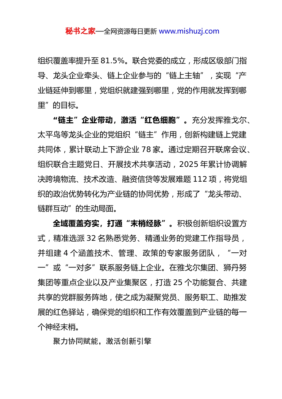 秘书之家—全网资源每日更新 www.mishuzj.com“红色针脚”织就“时尚锦绣”——党建引领海曙纺织服装产业高质量发展纺织服装产业是海曙区最具历史底蕴与现代活力的优势产业集群。2025 年,全区纺织服装行业实现工业总产值 173.1亿元,占全区规上工业总产值的 14.2%,“海曙服装”入选首批“浙江消费名品”区域品牌,雅戈尔高端西服智能工厂获评国家卓越级智能工厂。面对复杂多变的外部环境与产业深度转型的内在要求,海曙区以党建统领产业发展全局,把党的组织优势转化为产业发展胜势,以“红色针脚”穿引全链,推动时尚纺织服装产业向高端化、智能化、绿色化转变,为区域经济高质量发展注入强劲动力。织密组织体系,筑牢发展根基聚焦纺织服装产业链长面广、企业集聚的特点,推动党的组织体系与产业链条同步延伸,实现“党建链”与“产业链”深度融合。联合党委领航,构建“链上主轴”。针对产业协同发展中存在的壁垒,海曙区创新组建时尚纺织服装产业链联合党委,由区经信局总工程师与雅戈尔集团党委书记负责协调,联动链上 151 家企业、32 家成员单位,覆盖党员 1721 名,推动党秘书之家—全网资源每日更新 www.mishuzj.com组织覆盖率提升至 81.5%。联合党委的成立,形成区级部门指导、龙头企业牵头、链上企业参与的“链上主轴”,实现“产业链延伸到哪里,党组织就建强到哪里,党的作用就发挥到哪里”的目标。“链主”企业带动,激活“红色细胞”。充分发挥雅戈尔、太平鸟等龙头企业的党组织“链主”作用,创新构建链上党建共同体,累计联动上下游企业 78 家。通过定期召开联席会议、组织联合主题党日、开展技术共享活动,2025 年累计协调解决跨境物流、技术改造、融资信贷等发展难题 112 项,将党组织的政治优势转化为产业链的协同优势,形成了“龙头带动、链群互动”的生动局面。全域覆盖夯实,打通“末梢经脉”。积极创新组织设置方式,精准选派 32 名熟悉党务、精通业务的党建工作指导员,并组建 4 个涵盖技术、管理、政策的专家服务团队,“一对一”或“一对多”联系服务链上企业。在雅戈尔集团、狮丹努集团等重点企业以及产业集聚区,打造 25 个功能复合、共建共享的党群服务阵地,使之成为凝聚党员、服务职工、助推发展的红色驿站,确保党的组织和工作有效覆盖到产业链的每一个神经末梢。聚力协同赋能,激活创新引擎秘书之家—全网资源每日更新 www.mishuzj.com坚持以党建聚合高端要素、链接创新动能,推动人才、技术、资本、数据等资源在产业链上高效配置、深度融合,全面激活产业升级的内生动力。搭平台促对接,贯通产业循环。联合党委牵头连续三年承办中国职业装产业大会,强化品牌行业话语权;举办宁波国际纺织服装供应链博览会,吸引 500 余家优质展商,使之成为长三角地区重要的产销对接平台。不仅“请进来”,更主动“走出去”,先后组织企业赴巴黎、东京等地参加国际展会拓展市场,助力企业洞察国际前沿趋势、拓展海外市场渠道。推动雅戈尔、太平鸟等“链主”企业开放设计、市场资源,2025 年带动 6 家中小纺织服装企业纳入“小升规”培育库,实现大中小企业融通发展。强培训提技能,筑牢人才支撑。联合党委深化“政、企、校、协”四方联动机制,与浙江纺织服装职业技术学院等高校共建人才培养基地。技能传承与创新并举,常态化举办“红帮杯”服装制版师、色彩搭配师等职业技能竞赛。在党员队伍建设上,深入实施“双培双推”,链上企业高层管理人员中党员比例达到 93%。党员骨干牵头建设 4 个国家级技术中心,涌现出以“浙江工匠”为代表的一大批高技能党员人才,为产业升级提供坚实智力支撑。秘书之家—全网资源每日更新 www.mishuzj.com抓数智促融合,助推焕新升级。联合党委将推动“智转数改”作为党建服务产业的核心攻坚任务。全面推广数字化改造模式,目前已完成 49 家中小企业数字化改造,改造后企业生产效率平均提升 20%。强化标杆引领,支持雅戈尔建成国家级5G 工厂,落地“5G+AI 机器人巡检”等创新场景。同时,联合党委前瞻布局产业未来,牵头推动建设全国首个纺织服装行业数据流通平台(交易中心),发布百余个...